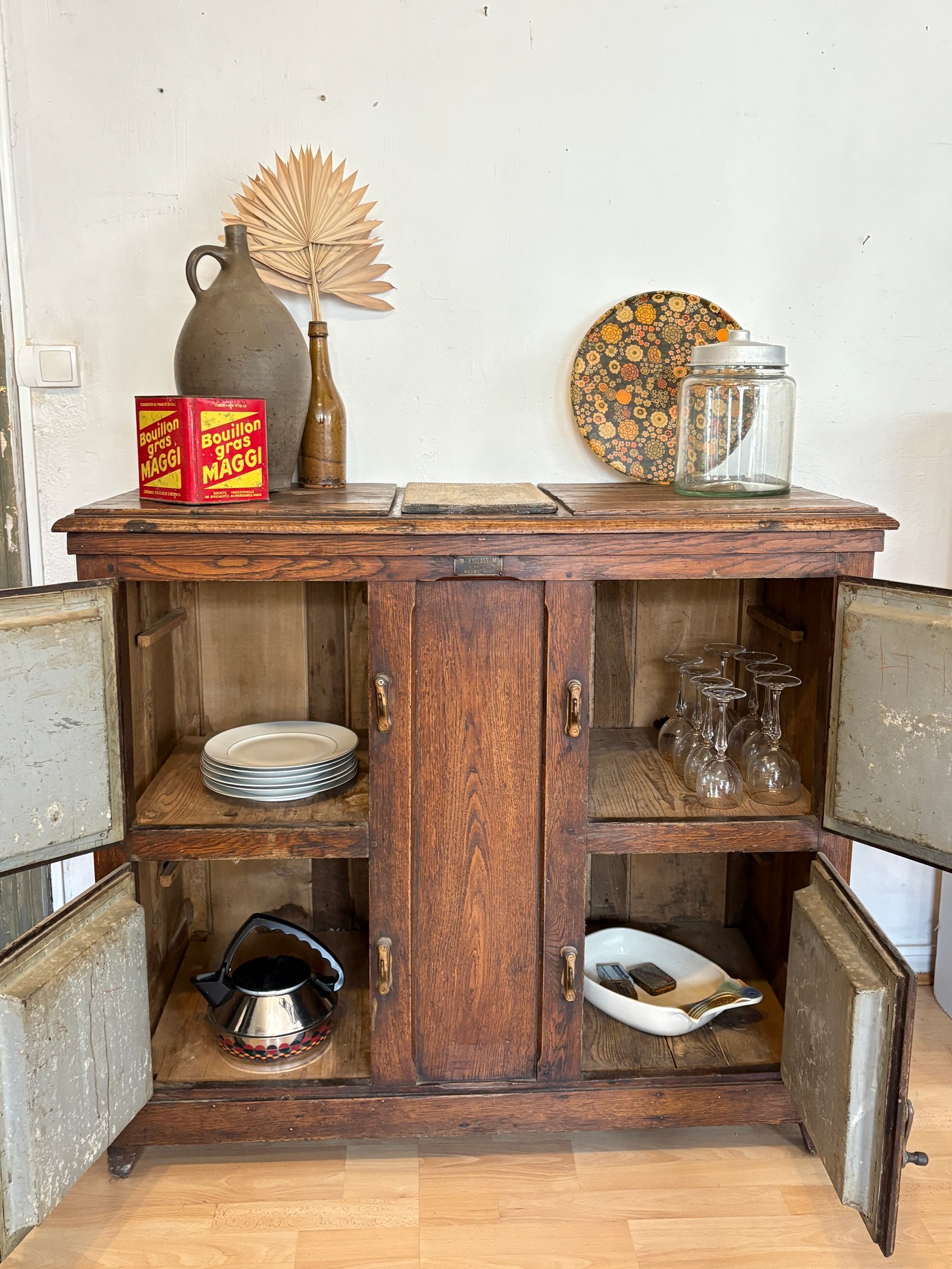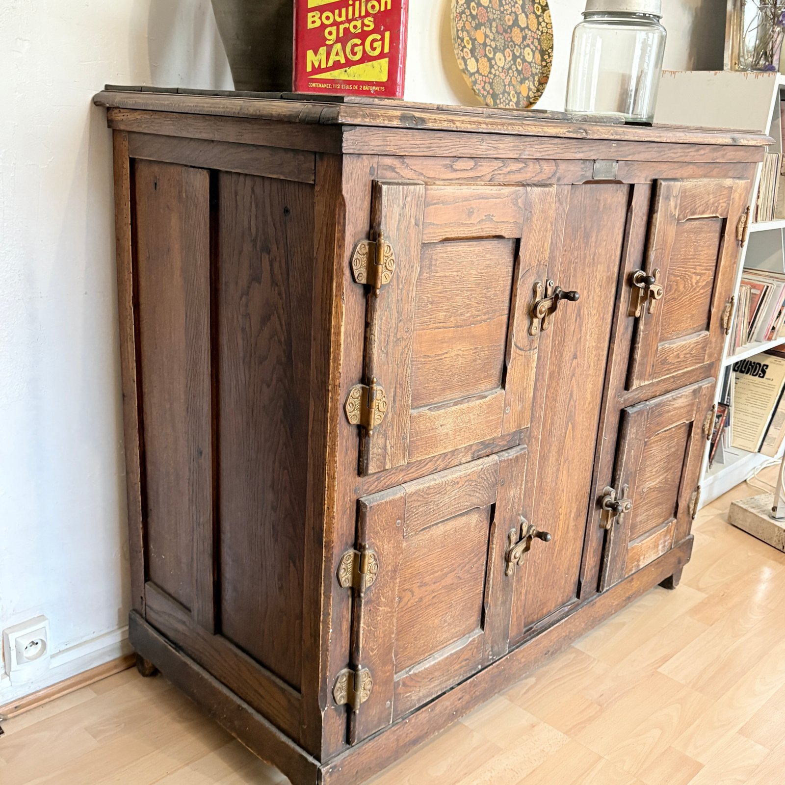 Superbe glacière ancienne transformée en buffet, cette pièce unique allie charme vintage et fonctionnalité. Son authenticité est mise en valeur par de magnifiques loquets métalliques, témoins de son caractère d’origine. Pratique et esthétique, ce meuble offre quatre espaces de rangement distincts, parfaits pour organiser vaisselle, linge de maison ou objets du quotidien