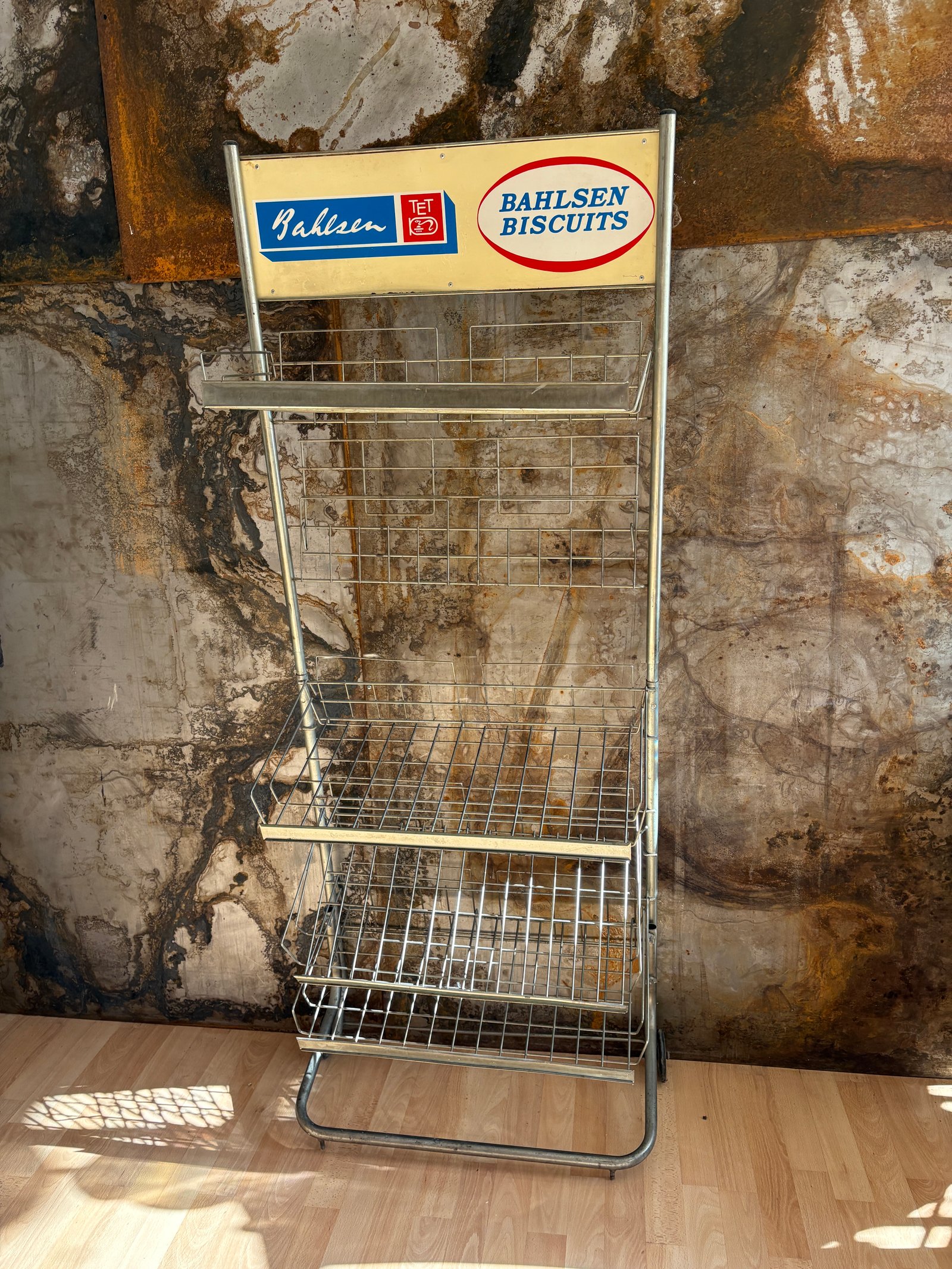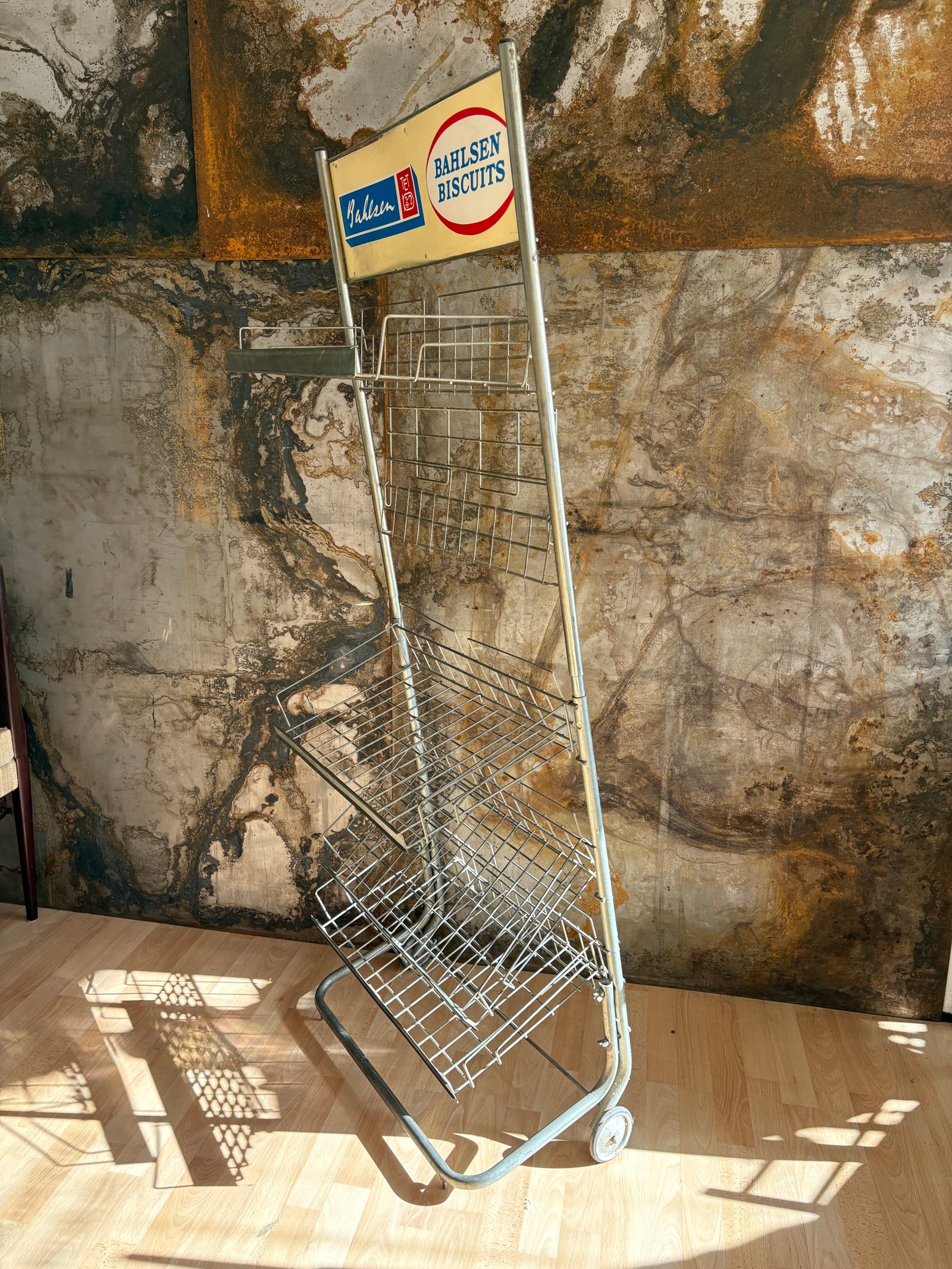 Ancien présentoir de magasin Balhsen, véritable meuble de métier et objet publicitaire d’époque. Ce présentoir robuste est composé de quatre grandes étagères réglables en hauteur, offrant une capacité d’exposition modulable selon vos besoins. Conçu avec un système de contrepoids par l’avant et équipé de deux roues arrières, il allie stabilité et mobilité. Idéal pour les collectionneurs, amateurs de décoration vintage ou pour apporter une touche authentique à une boutique, ce présentoir Balhsen incarne parfaitement le charme des meubles publicitaires anciens.