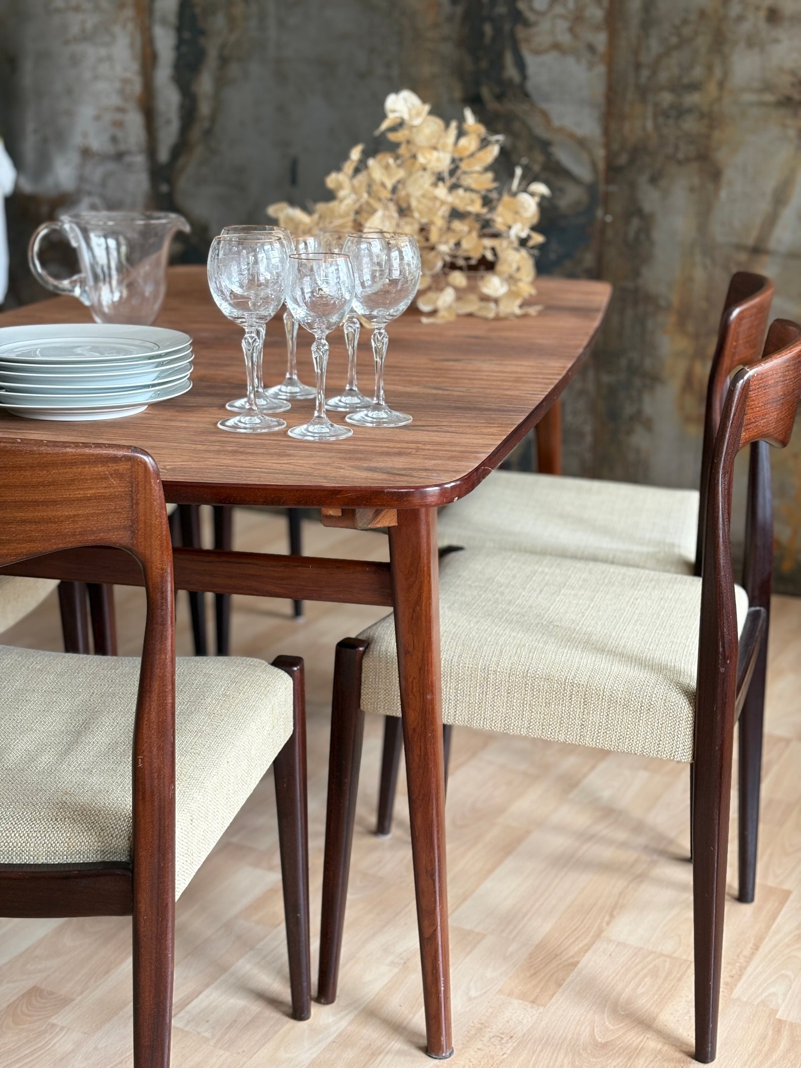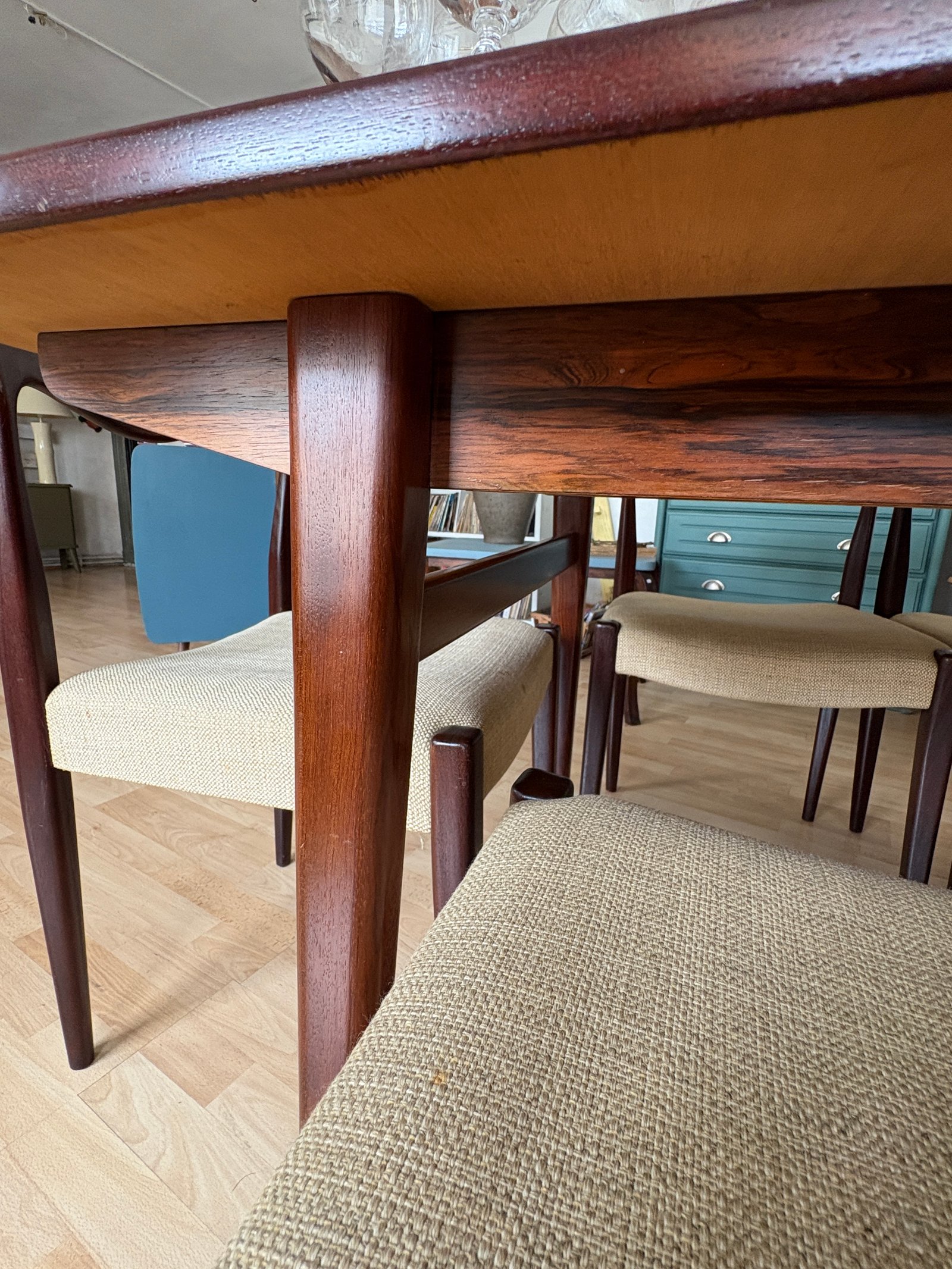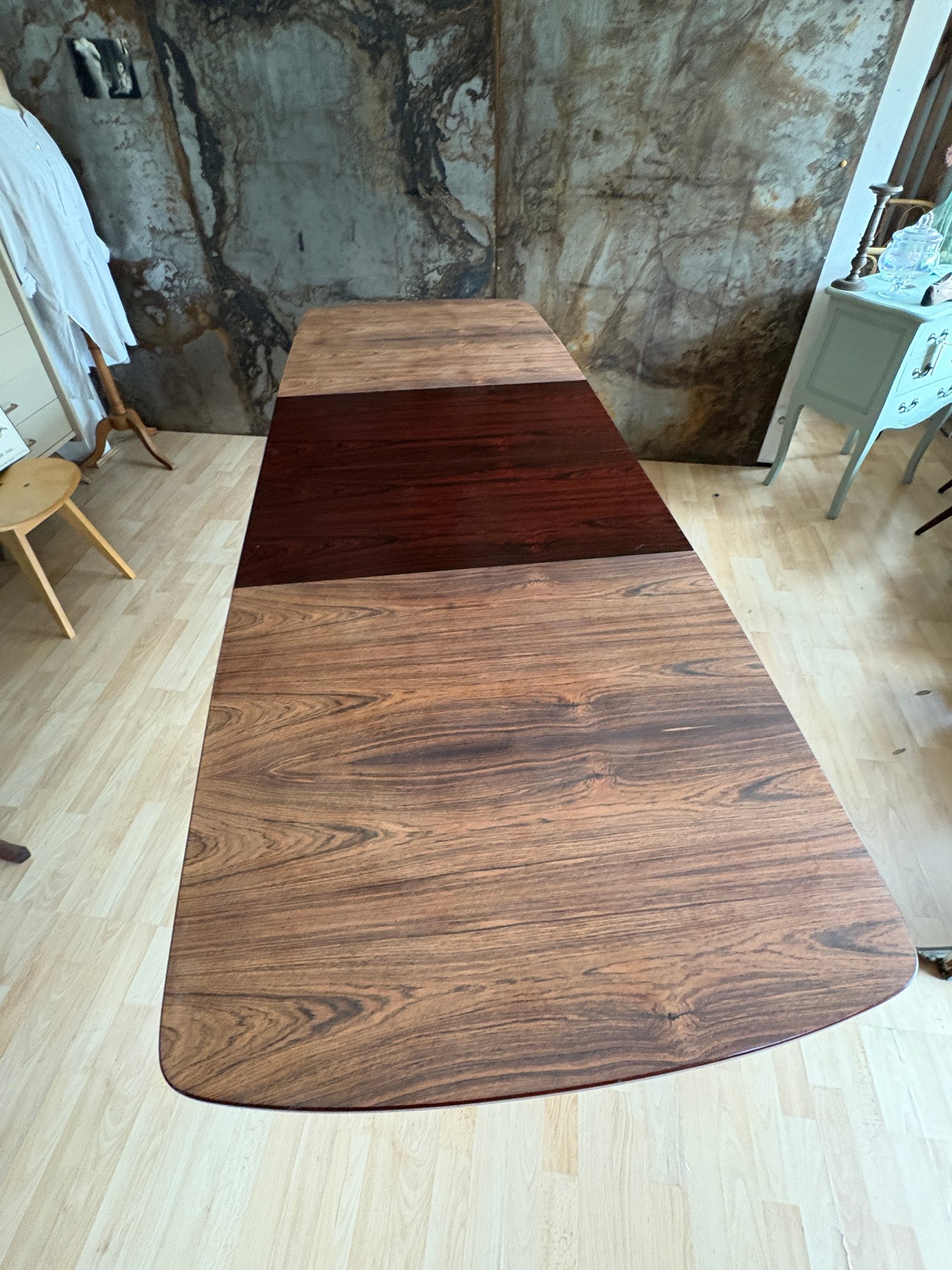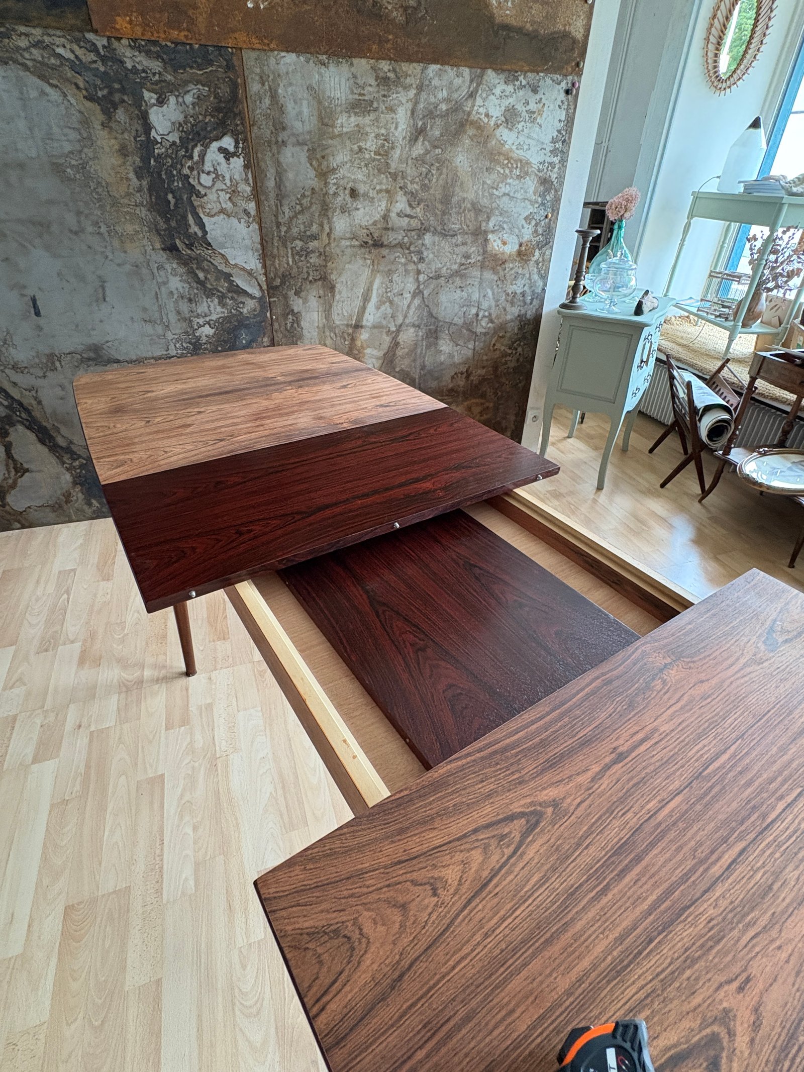 Table scandinave en palissandre au design élégant, dotée d’un plateau en bois brut et de lignes arrondies raffinées. Cette table de facture noble allie solidité et stabilité. Pratique et modulable, elle dispose de deux rallonges intégrées se glissant sous le plateau principal, permettant de passer facilement de 166 cm (6 couverts) à 210 cm (8 couverts) et jusqu’à 250 cm (12 couverts), pour un gain de place optimal. Idéale pour une salle à manger au style scandinave ou contemporain, cette table en palissandre combine esthétisme, fonctionnalité et durabilité. Dimensions sans rallonges : H74 x L166 x P90 cm.