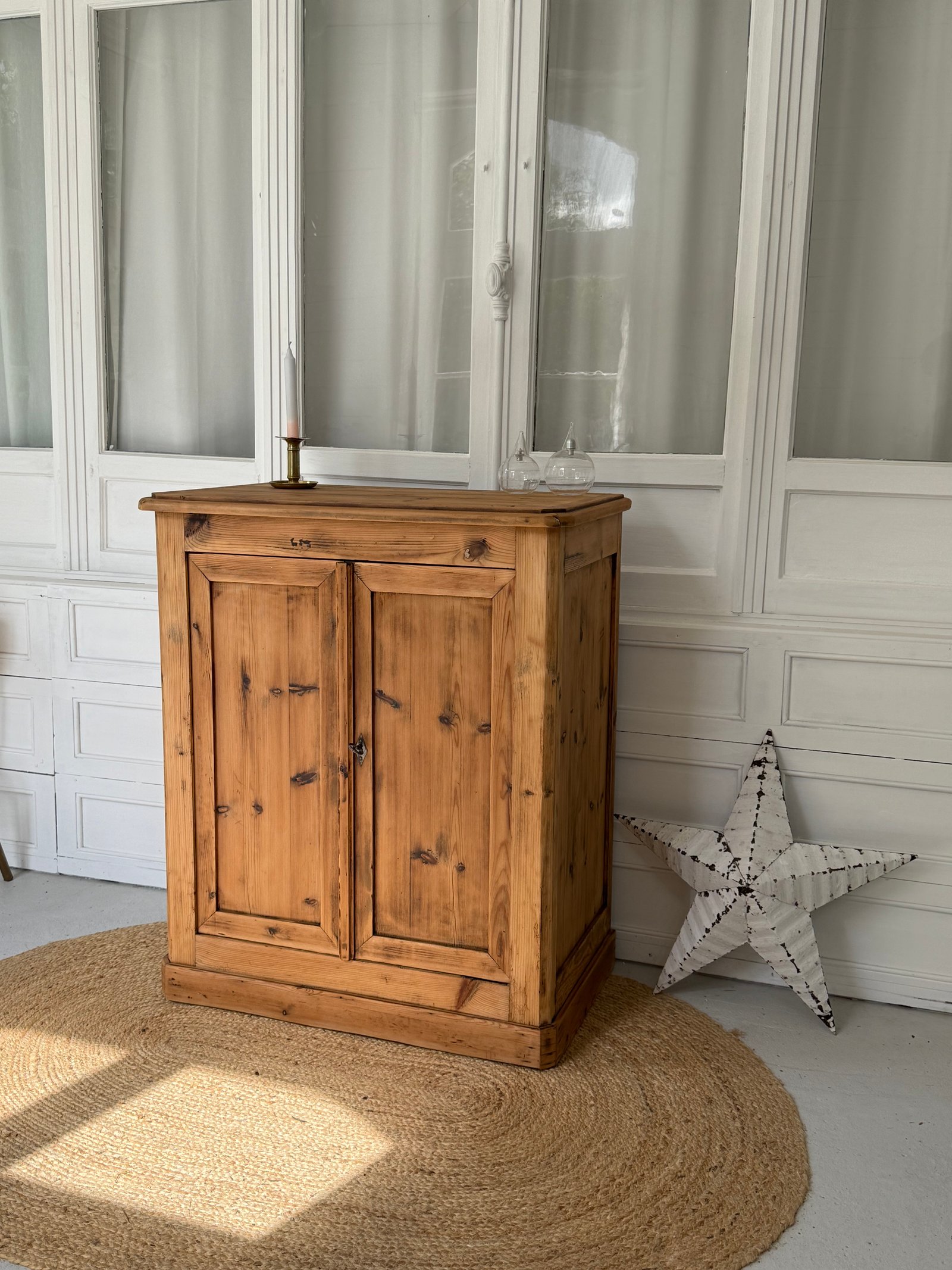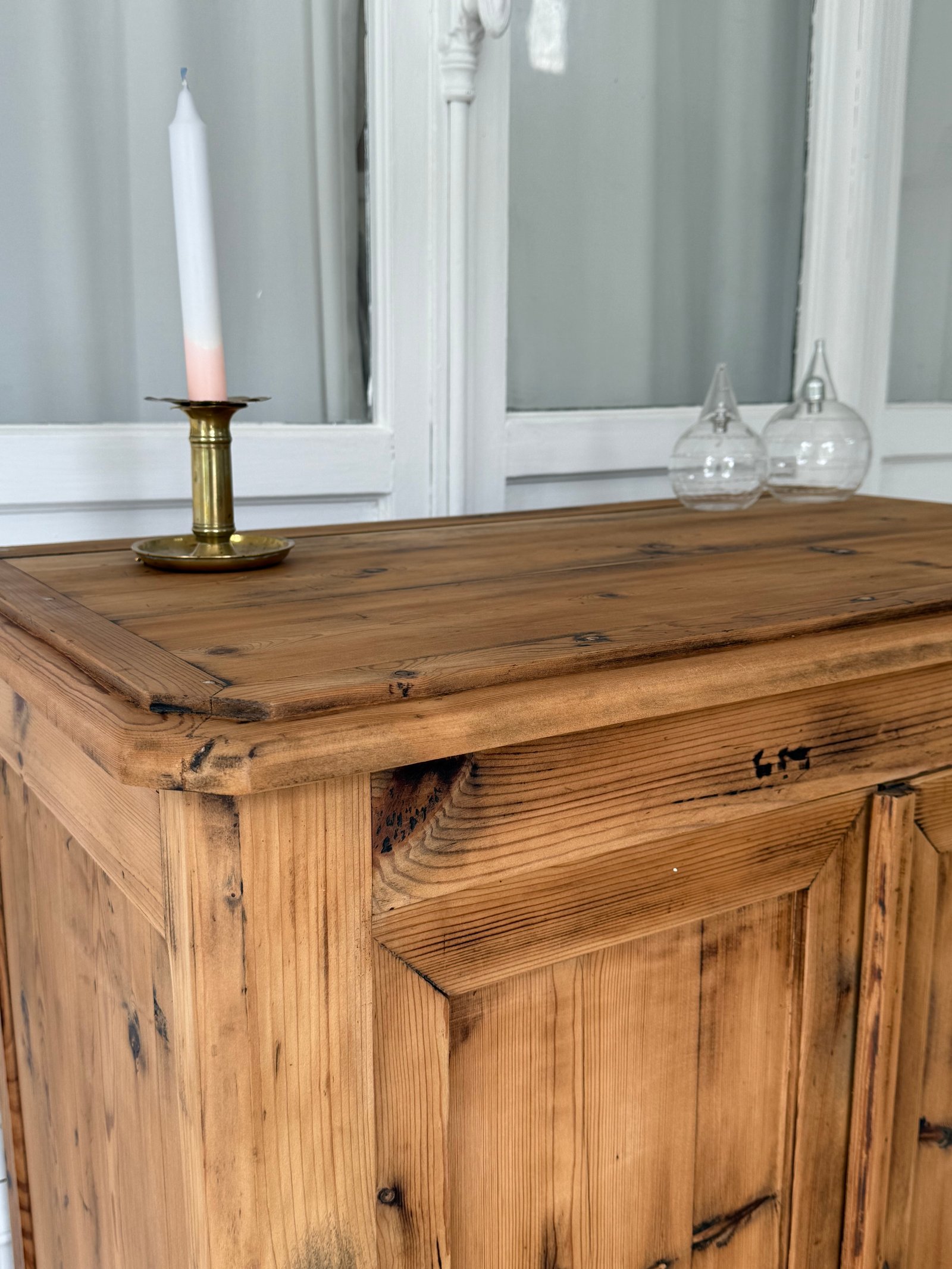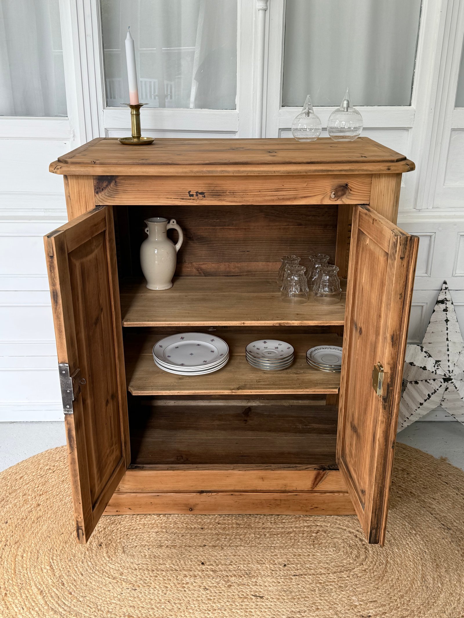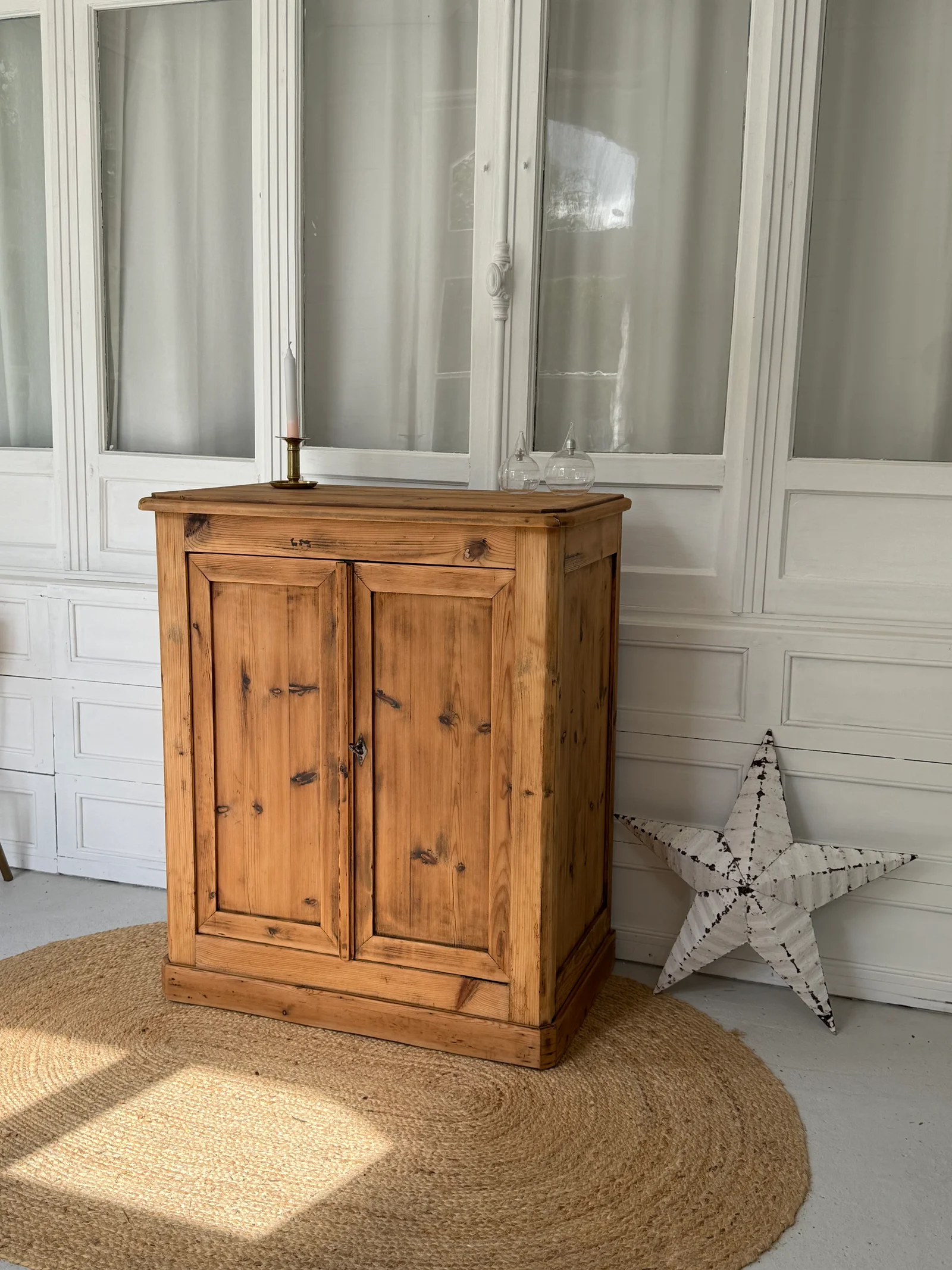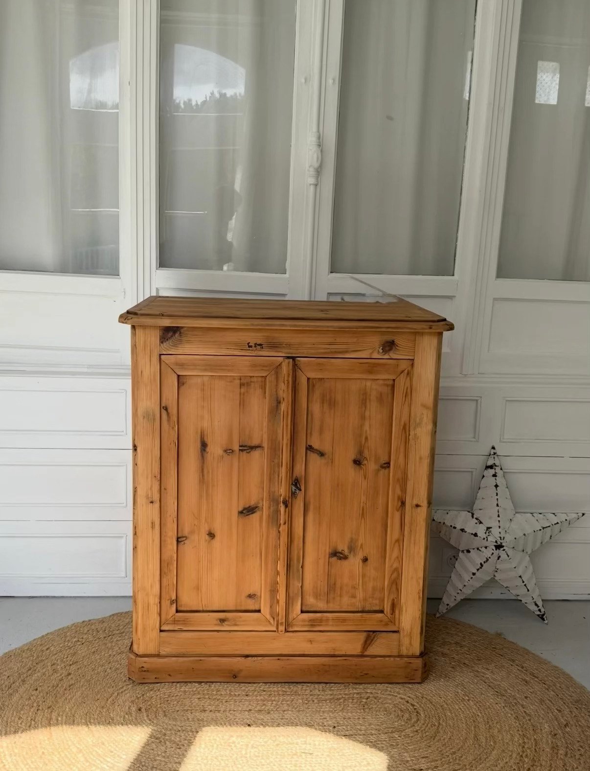 Buffet ancien en bois brut, entièrement nettoyé, poncé, traité et protégé avec un protecteur extra mat Id Paris. Il présente quelques trous de vrillettes traités, ce qui garantit un meuble sain. Certaines imperfections liées au temps demeurent. La porte gauche se ferme par un crochet intérieur et la porte droite par une serrure.