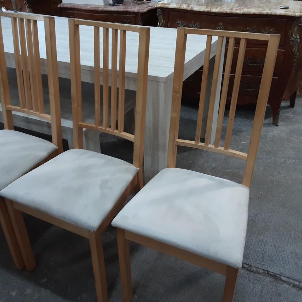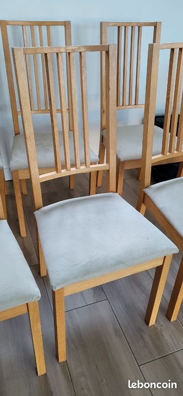 Lot dechaises en bois clair au design épuré, inspiré du style scandinave. Chaque chaise est dotée d’un dossier à barreaux verticaux et d’une assise confortable en tissu, légèrement patinée mais sans défauts majeurs. Leur structure en bois massif assure une excellente stabilité, idéale pour un usage quotidien dans une salle à manger, une cuisine ou un espace professionnel. Leur ligne sobre et leur teinte naturelle s’intègrent facilement dans une décoration nordique, contemporaine ou minimaliste.