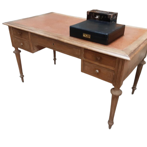Authentique bureau vintage en bois massif, finition brun acajou, avec plateau en cuir véritable. Ce meuble ancien au style classique et intemporel est doté de six tiroirs fonctionnels à poignées rondes, parfait pour le rangement de documents, accessoires ou outils. Ses pieds tournés et sa patine naturelle lui confèrent un charme rétro idéal pour une décoration de type industriel, atelier, brocante ou maison de campagne.