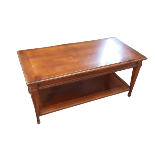 Table basse rectangulaire en merisier, finition vernie, au style classique et intemporel. Son plateau spacieux et sa tablette inférieure offrent un double niveau de rangement idéal pour les magazines, télécommandes ou objets déco. Les pieds légèrement fuselés lui donnent une silhouette élégante tout en assurant une excellente stabilité. Avec ses lignes sobres et sa teinte bois naturel, elle s’intègre facilement dans un salon de style traditionnel, rustique ou contemporain.