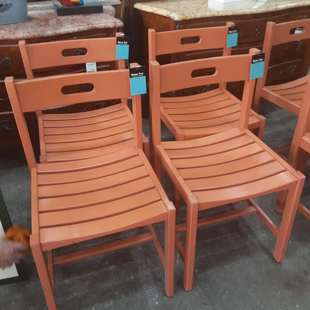 Lot de 6 chaises en bois teinté orange, au design vintage et épuré. Chaque chaise est dotée d’une assise ajourée et d’un dossier avec découpe rectangulaire, offrant confort et légèreté visuelle. Leur structure robuste et leur finition chaleureuse en font un choix idéal pour une salle à manger, une cuisine ou un espace professionnel au style rétro, bistrot ou industriel. Stables et prêtes à l’emploi, elles peuvent être utilisées telles quelles ou intégrées dans un projet de relooking déco.