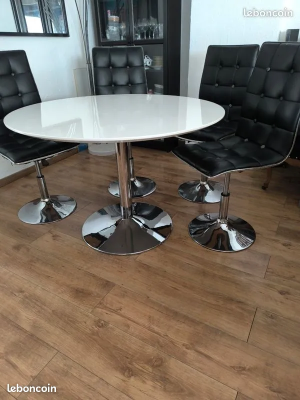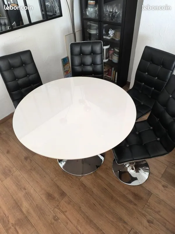 Table ronde blanche laquée de 110 cm de diamètre, accompagnée de quatre chaises matelassées noires au design moderne. L’ensemble repose sur des pieds argentés en métal, apportant une touche contemporaine et raffinée. Idéal pour une salle à manger ou un espace repas, confort et esthétique. La table offre une belle surface pour accueillir jusqu’à quatre convives, tandis que les chaises assurent un excellent maintien grâce à leur assise rembourrée style cuir. La table est en très bon état, prêt à être utilisé sans aucun défaut. Les chaises ont des traces d'usure (voir photos).