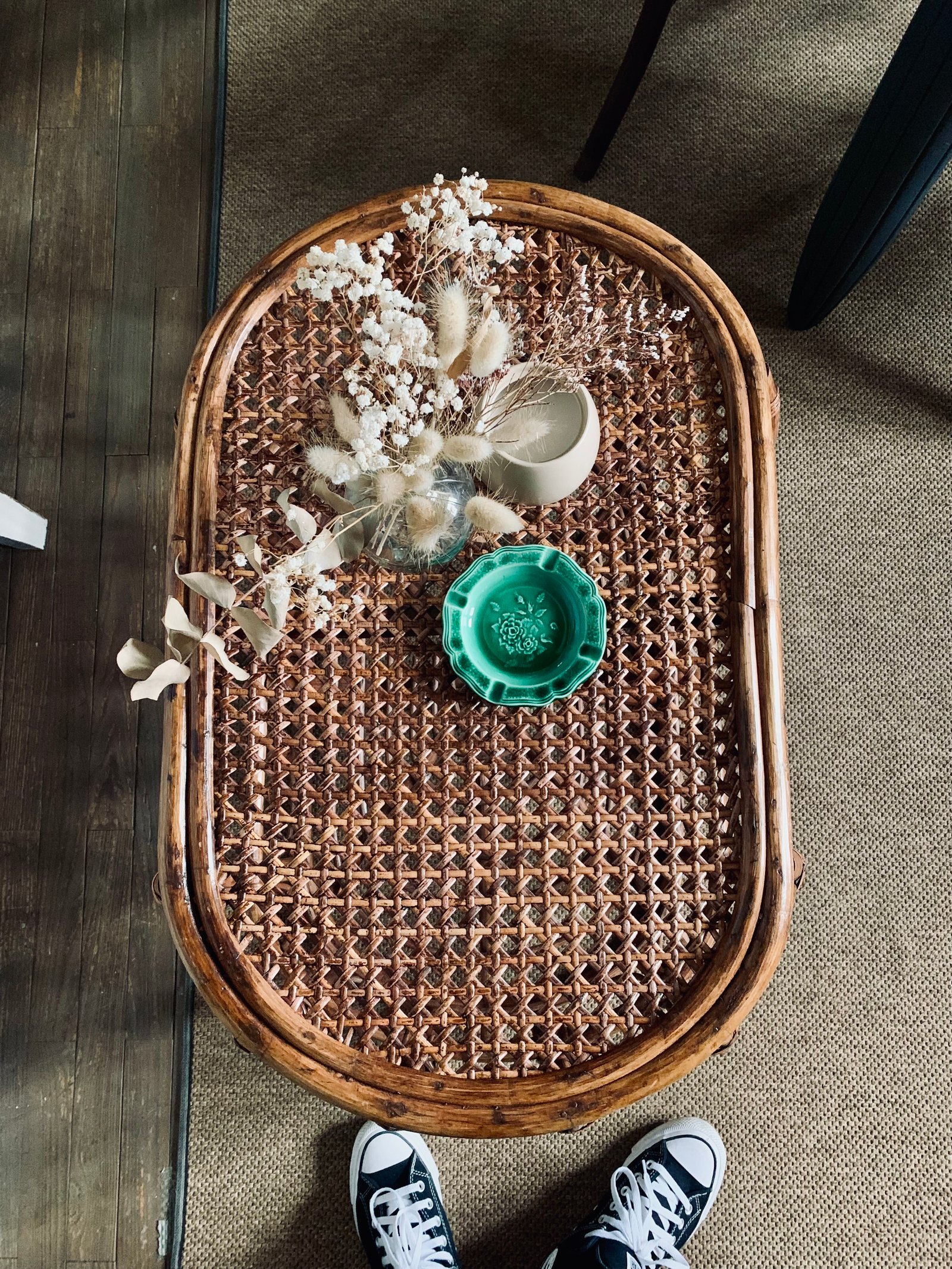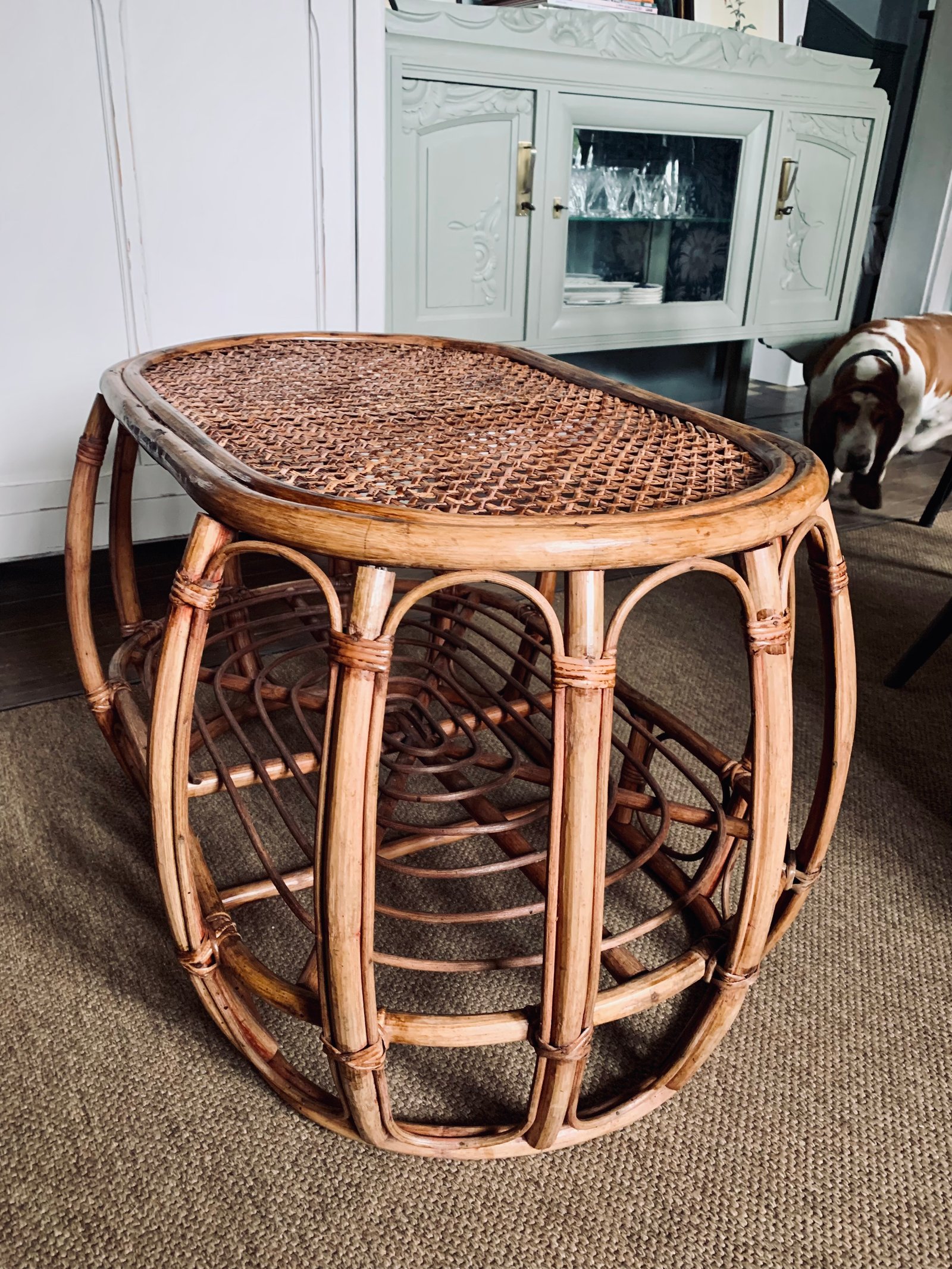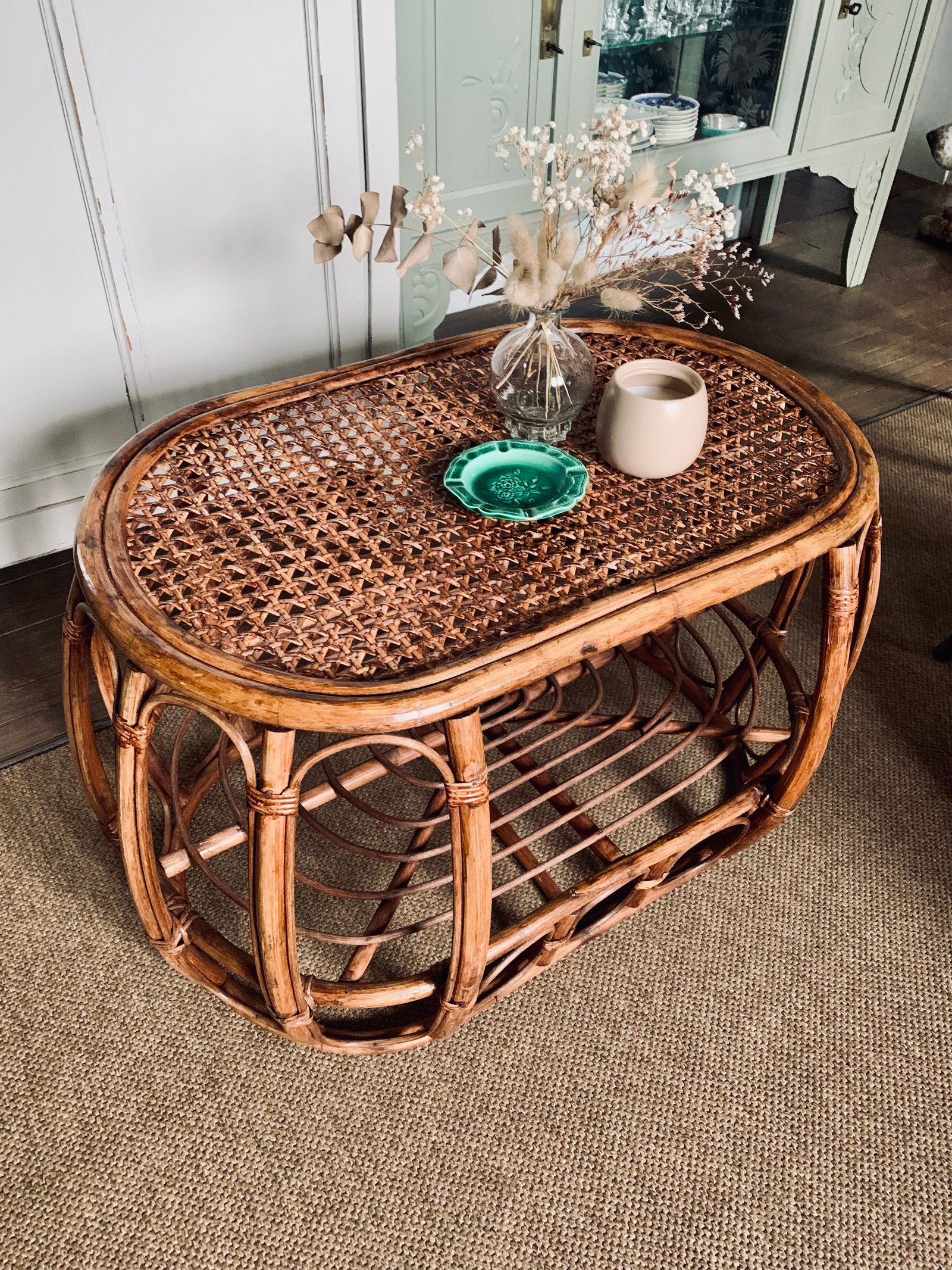 Table basse vintage en osier, bambou et cannage, au charme naturel et authentique. Légère mais solide, elle s’intègre parfaitement dans une décoration bohème, rétro ou bord de mer. Son espace inférieur permet de ranger facilement vos magazines ou objets du quotidien, tout en conservant un encombrement réduit.