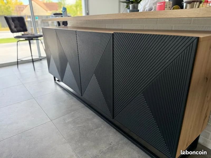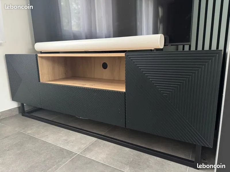 Ensemble meuble TV + buffet de la collection ALICE de chez Bobochic, acheté il y a un an et encore disponible à 1 100 € les deux sur le site officiel. Design moderne et élégant avec façades chevronnées, finition chêne et noir, et pieds en métal pour une touche contemporaine. Le buffet 4 portes (200 cm) offre un vaste espace de rangement avec étagères réglables sur trois niveaux, tandis que le meuble TV (167 cm) combine style et fonctionnalité avec ses niches pratiques et son système d’ouverture sans poignées. Les deux meubles sont en très bon état, sans défaut, et s’intègrent parfaitement dans un intérieur tendance, scandinave ou industriel. Idéal pour structurer un séjour avec goût et praticité.