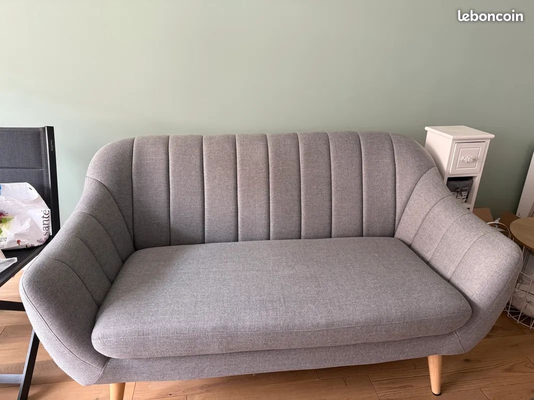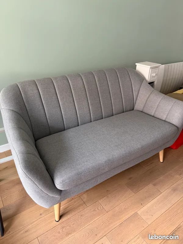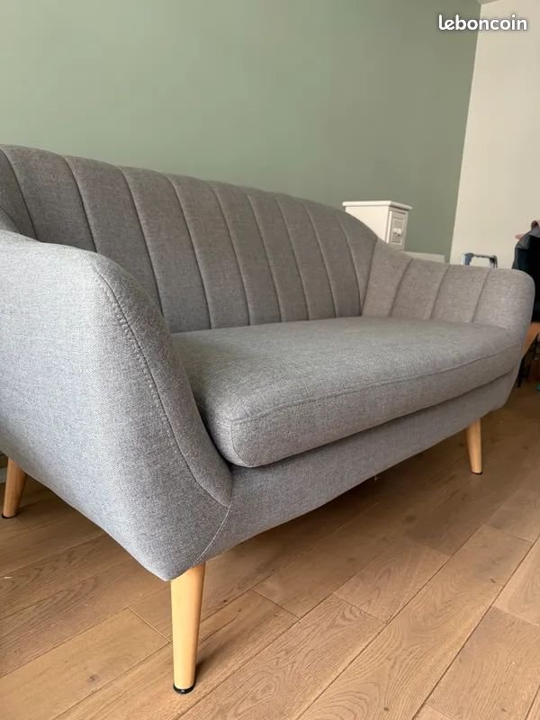 Canapé 2-3 places en tissu gris au style contemporain, reposant sur des pieds en bois clair pour une touche élégante et moderne. En très bon état, il a toujours été protégé par un plaid au niveau de l’assise, garantissant confort et durabilité. Idéal pour un salon design et convivial. Les dimensions renseignées ne sont pas bonnes pour info.