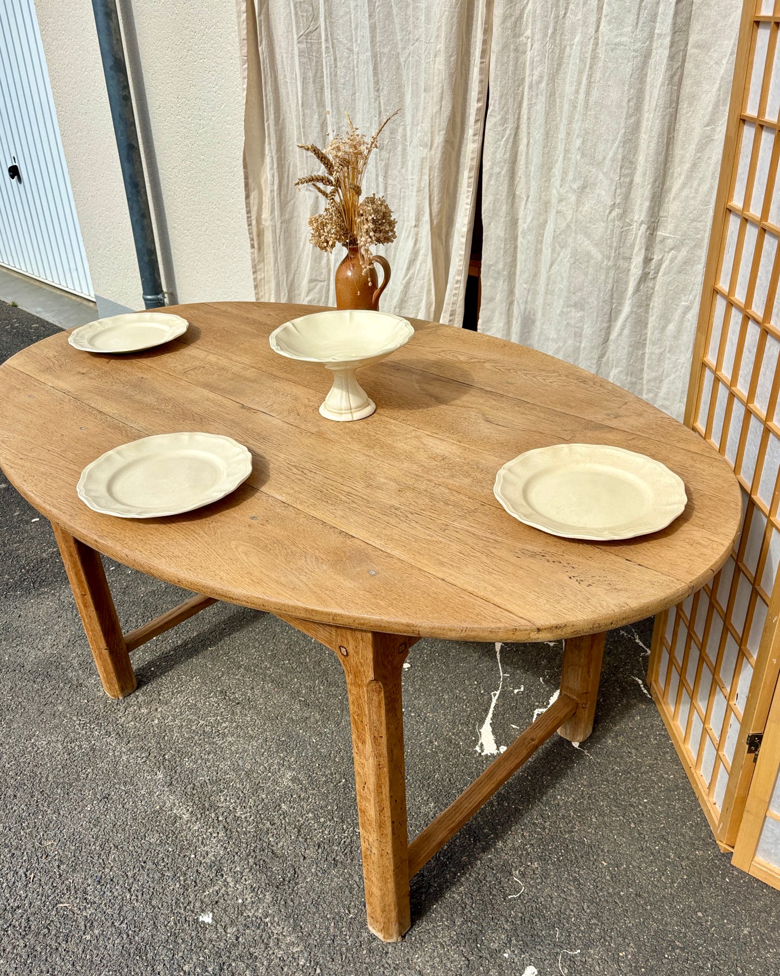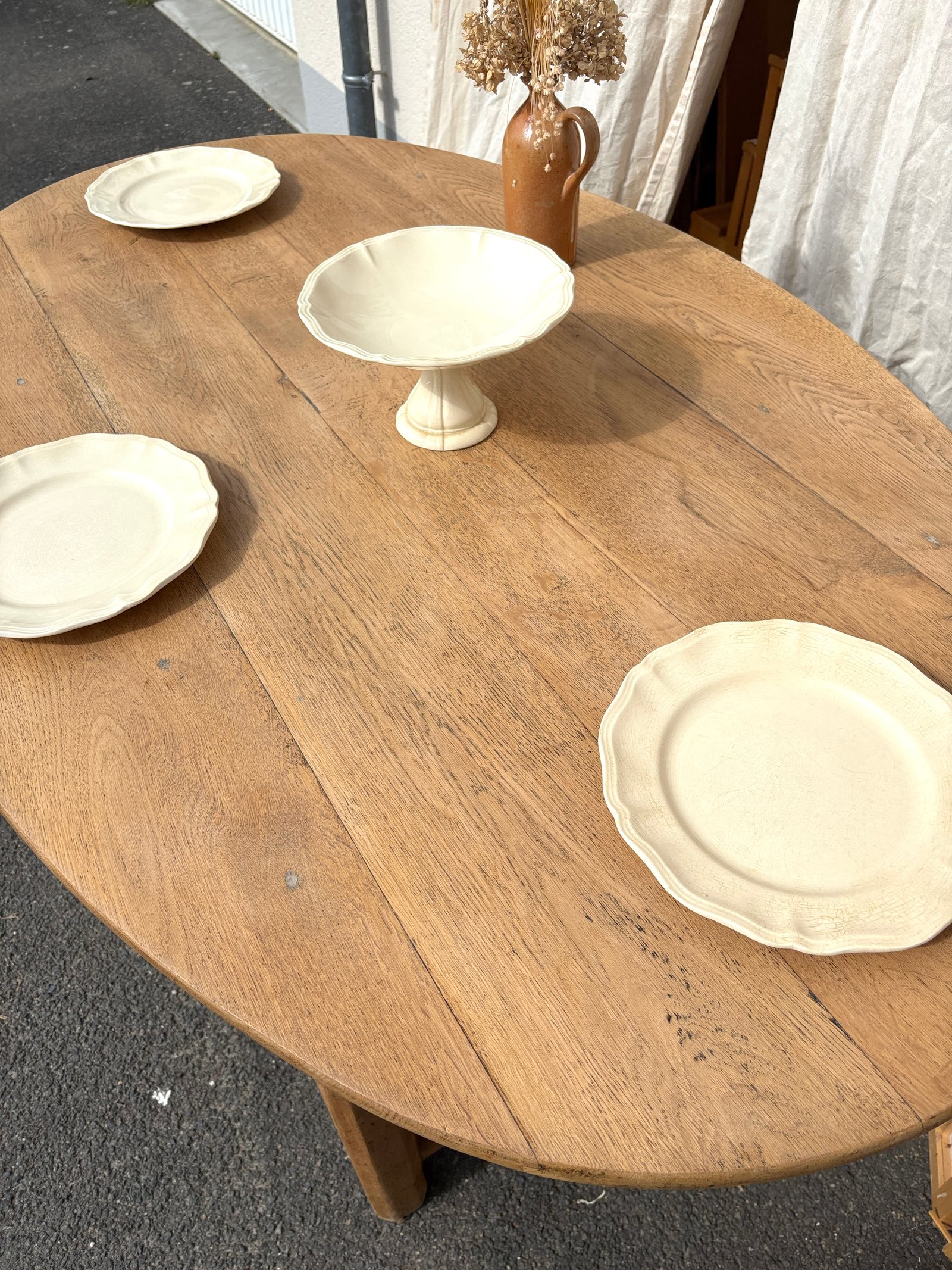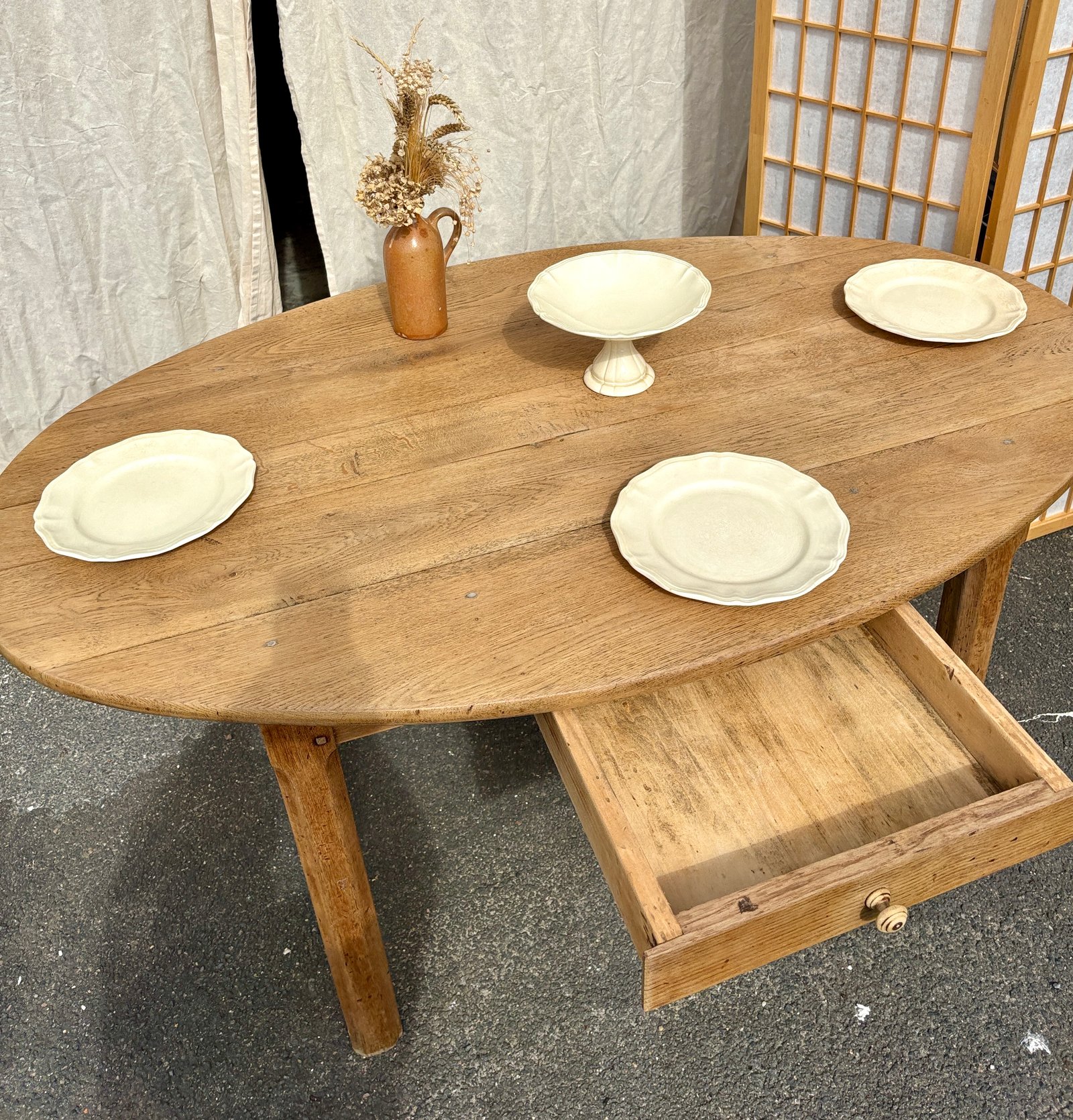Cette superbe table de ferme ovale est entièrement réalisée en chêne massif, un bois noble reconnu pour sa solidité et sa longévité. Son plateau aux lignes douces facilite la circulation et crée une ambiance chaleureuse, idéale pour les repas en famille ou les dîners entre amis. Le grain naturel du bois et sa patine authentique témoignent de son histoire, tandis qu’une légère marque sur le plateau ajoute une touche de vécu, renforçant son caractère. Dotée d’un grand tiroir central discret, elle offre un espace de rangement pratique pour les couverts ou le linge de table. Avec ses dimensions (L150 x P94 x H74 cm, hauteur sous bandeau : 60 cm), elle s’intègre parfaitement dans une salle à manger, une cuisine ouverte ou un espace de vie lumineux. Son style campagne chic, bohème ou classique revisité en fait une pièce maîtresse qui s’accorde avec les intérieurs les plus soignés.