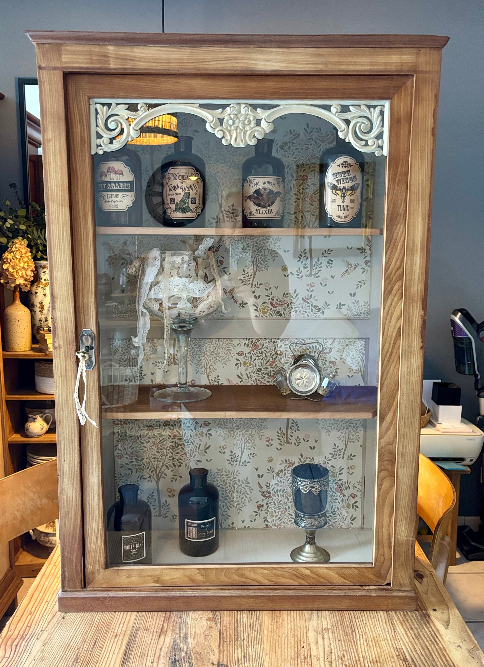 Cette charmante vitrine parisienne séduit par son bois clair naturel et ses détails sculptés délicats, qui lui confèrent une allure élégante et pleine de caractère. L’intérieur, repeint en blanc lin, offre une base lumineuse et épurée, tandis que le fond tapissé de motifs jungle ajoute une touche contemporaine et audacieuse, parfaite pour mettre en valeur vos objets décoratifs. Avec ses dimensions compactes (H77 x L49,5 x P31 cm), elle s’intègre facilement dans une salle de bain, un salon cosy ou une entrée stylée. Ses deux étagères permettent d’exposer verrerie, livres, boîtes ou souvenirs, tout en apportant du cachet à votre intérieur. Cette vitrine est une pièce unique et fonctionnelle, idéale pour les amateurs de décoration vintage ou bohème.