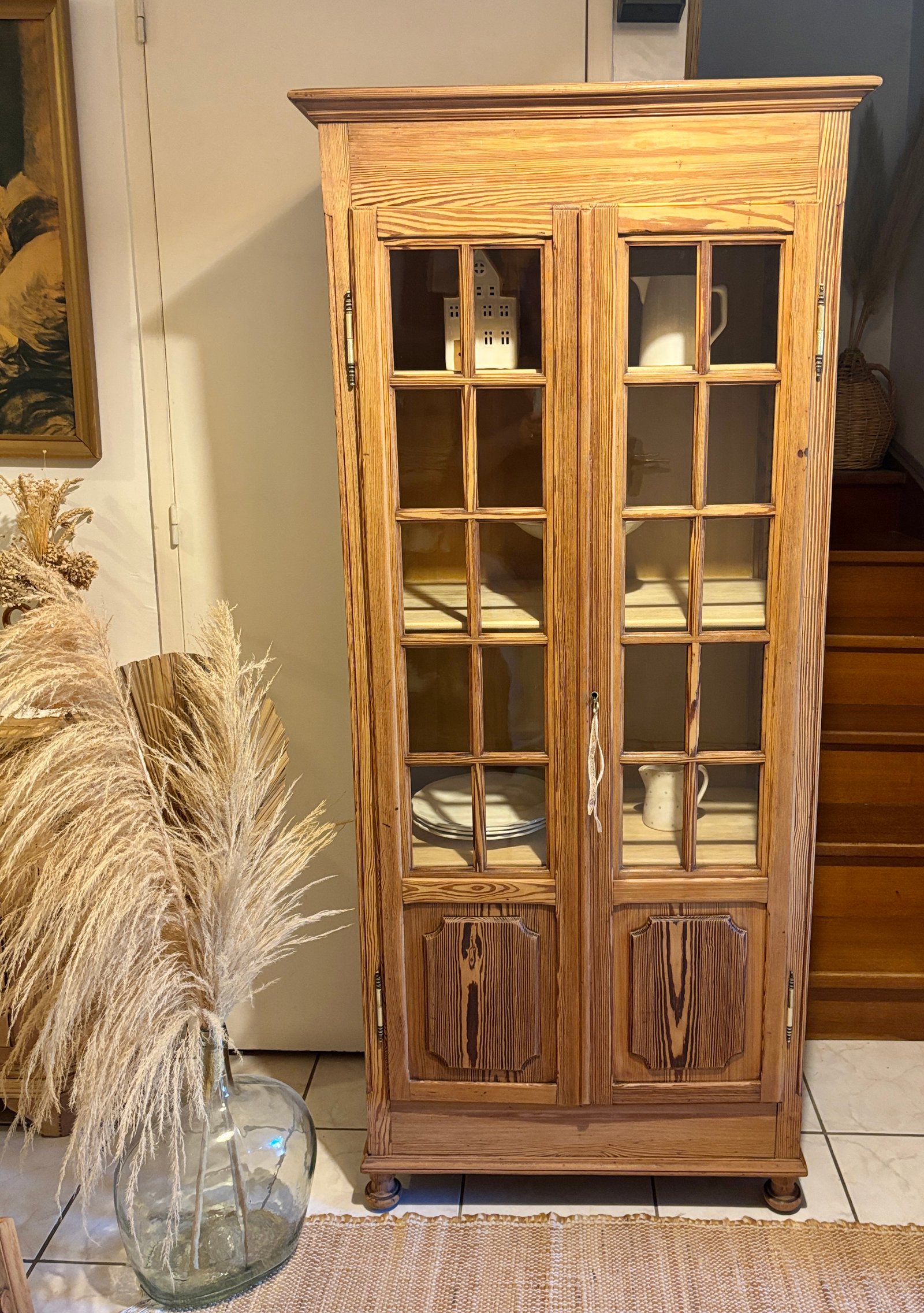 Cette vitrine parisienne en pitchpin, bois résineux prisé pour sa robustesse et son veinage chaleureux, incarne le charme des meubles anciens revisités. Entièrement poncée, traitée et nettoyée, elle dévoile une finition naturelle qui met en valeur la beauté brute du bois. Ses deux portes vitrées ornées de croisillons apportent une touche décorative raffinée tout en laissant entrevoir vos objets de collection, vaisselle ou livres. Les trois étagères en bois massif offrent un espace de rangement généreux et modulable, parfait pour une salle à manger, un salon cosy ou un bureau au style campagne chic. Avec ses dimensions (H168 x L75 x P38 cm), elle s’intègre facilement dans les intérieurs rustiques, bohèmes ou classiques revisités, tout en apportant de la légèreté visuelle grâce à ses vitrages.