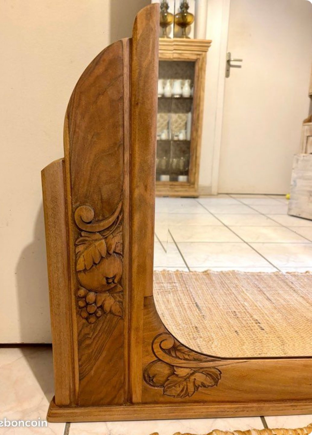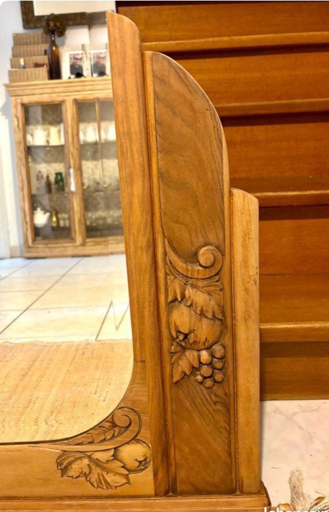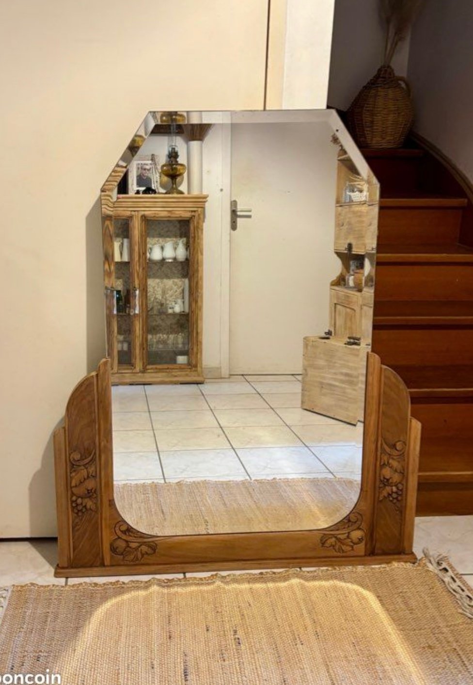 Ce superbe miroir Art Déco est une véritable pièce de collection, typique des années 1920/1930, qui apportera une touche d’élégance et de caractère à votre intérieur. Son cadre en noyer massif, aux moulures sculptées en relief représentant des motifs de fruits et de feuillages, incarne le raffinement décoratif de l’époque. La glace biseautée, conservée dans son jus, présente quelques marques du temps qui renforcent son authenticité et son charme vintage. Avec ses dimensions généreuses (L100 x H120 cm), ce miroir peut être posé au sol pour un effet majestueux ou installé sur un buffet pour habiller un mur avec style. Il s’intègre parfaitement dans un salon classique, une entrée élégante ou une chambre au style rétro. Idéal pour les amateurs de mobilier ancien, décoration Art Déco ou pièces uniques avec une histoire, ce miroir est en bon état général et prêt à sublimer votre espace.