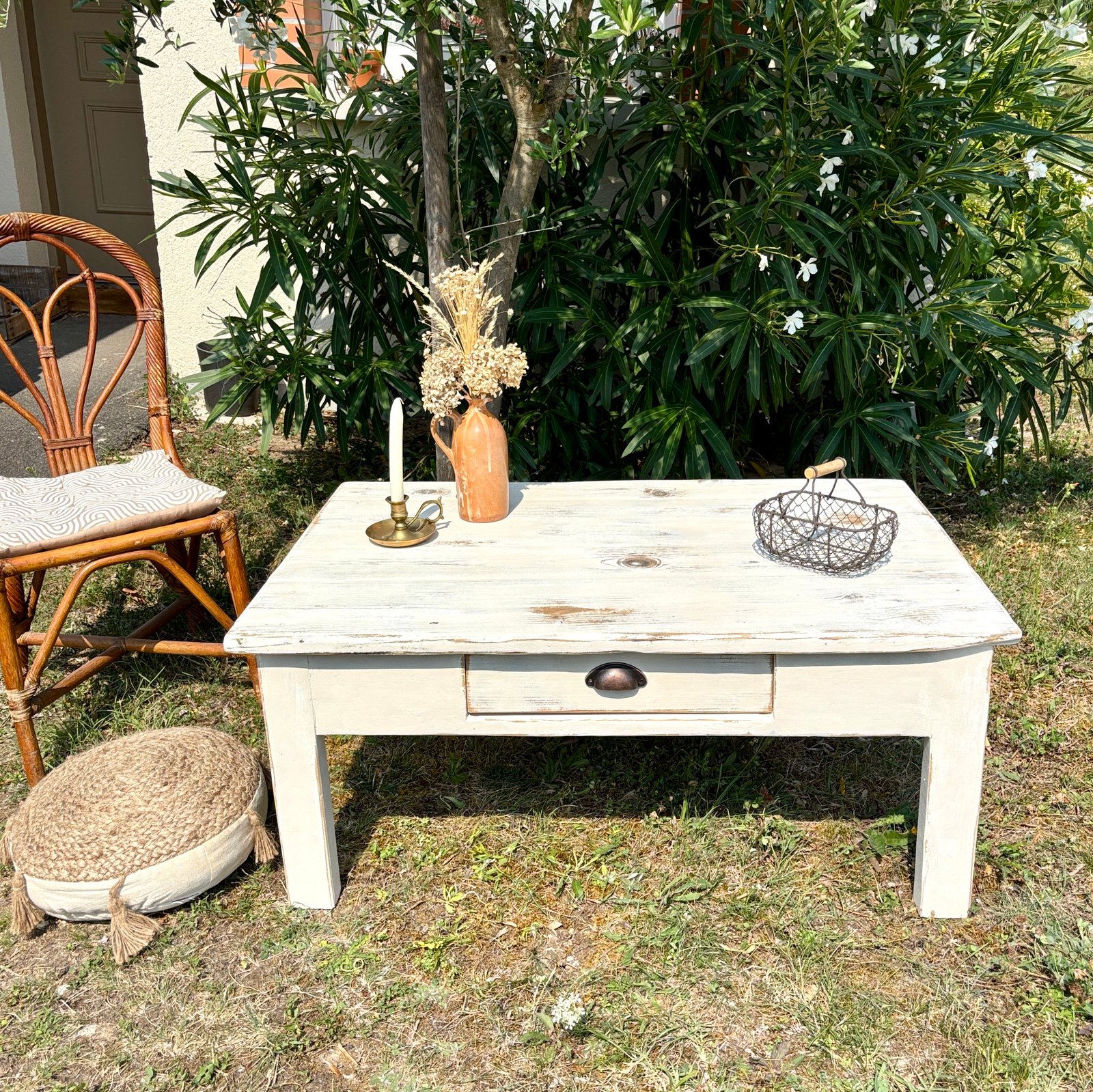 🤍 Table Basse de Caractère 🤍 Magnifique table en bois relookée avec une patine élégante et authentique. Son aspect vieilli et ses imperfections volontaires lui confèrent un charme unique et un esprit "maison de famille". Le tiroir coulissant est équipé de compartiments pour un rangement optimisé. Idéal pour garder votre espace de vie toujours ordonné et stylé. Un meuble pratique et esthétique pour un salon chaleureux et plein de personnalité ! 📐 Dimensions : * L 100 cm * P 66 cm * H 43 cm