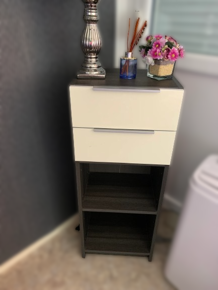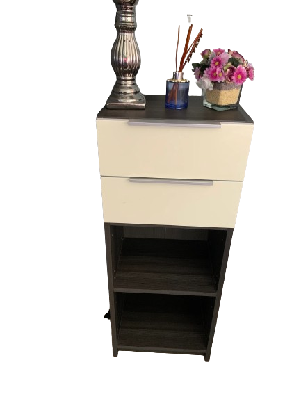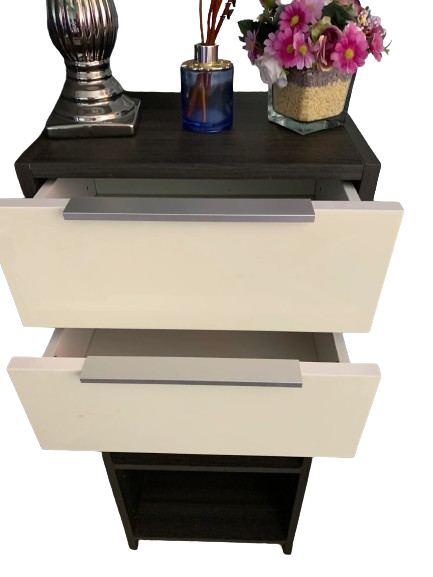 Petit meuble à rangement moderne en bois pouvant servir de bureau, chevet ou autre, blanc et noir à 2 tiroirs et une étagère permettant d'avoir deux espaces de rangement de plus. Il est en très bon état.