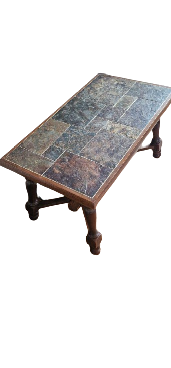 Table basse en bois massif rustique avec un design atypique sur son dessus composée de plaques en pierres. Elle est en très bon état.