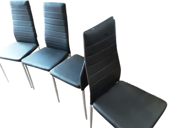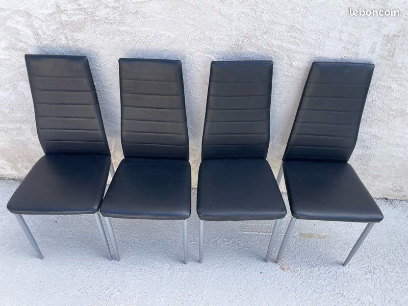 Lot de 4 chaises de salle à manger au design moderne, parfaites pour une déco contemporaine ou industrielle. Assise et dossier rembourrés en simili cuir noir avec surpiqûres horizontales, offrant un confort optimal et un look élégant. Pieds en métal noir mat, stables et résistants, qui s’intègrent facilement dans une cuisine, un salon ou un bureau. Les chaises sont en très bon état, sans rayures ni affaissement, soigneusement entretenues. Leur style épuré convient aussi bien à un intérieur minimaliste qu’à une ambiance loft. Idéales pour les repas quotidiens, les dîners entre amis ou comme chaises d’appoint.