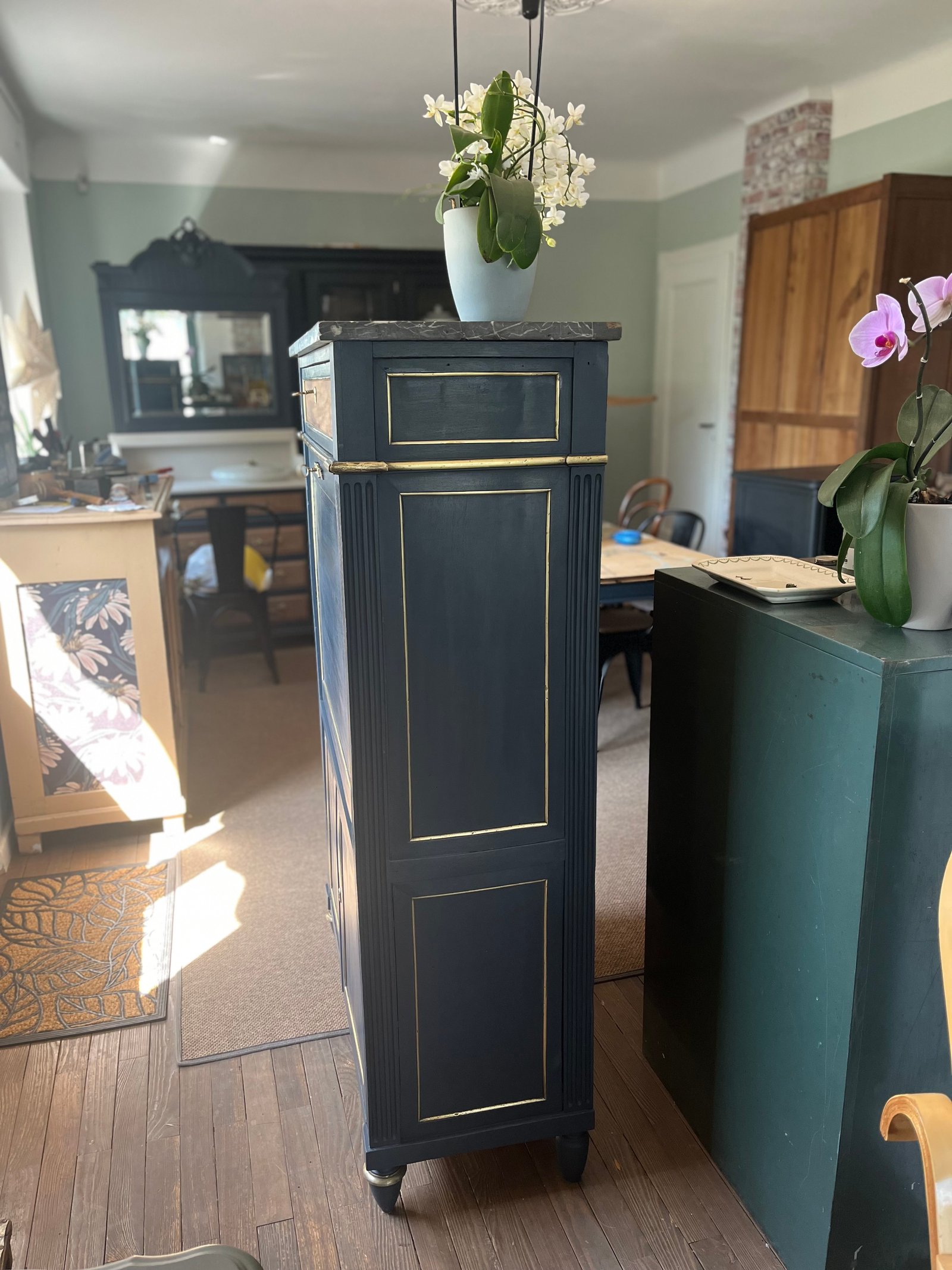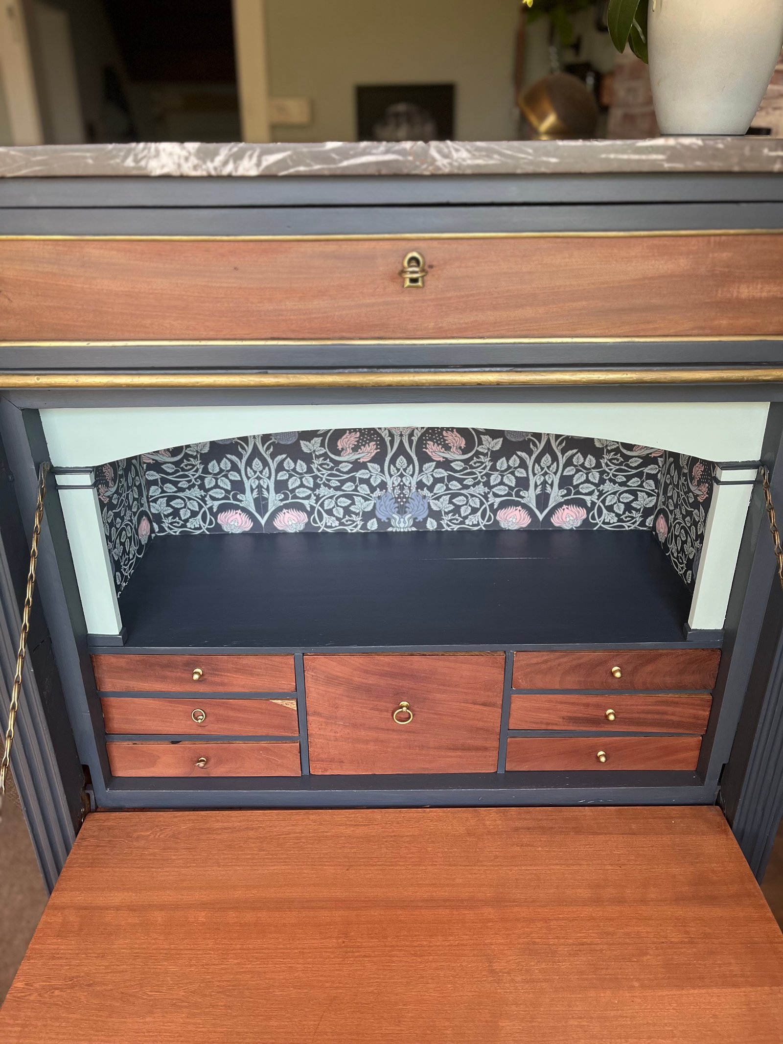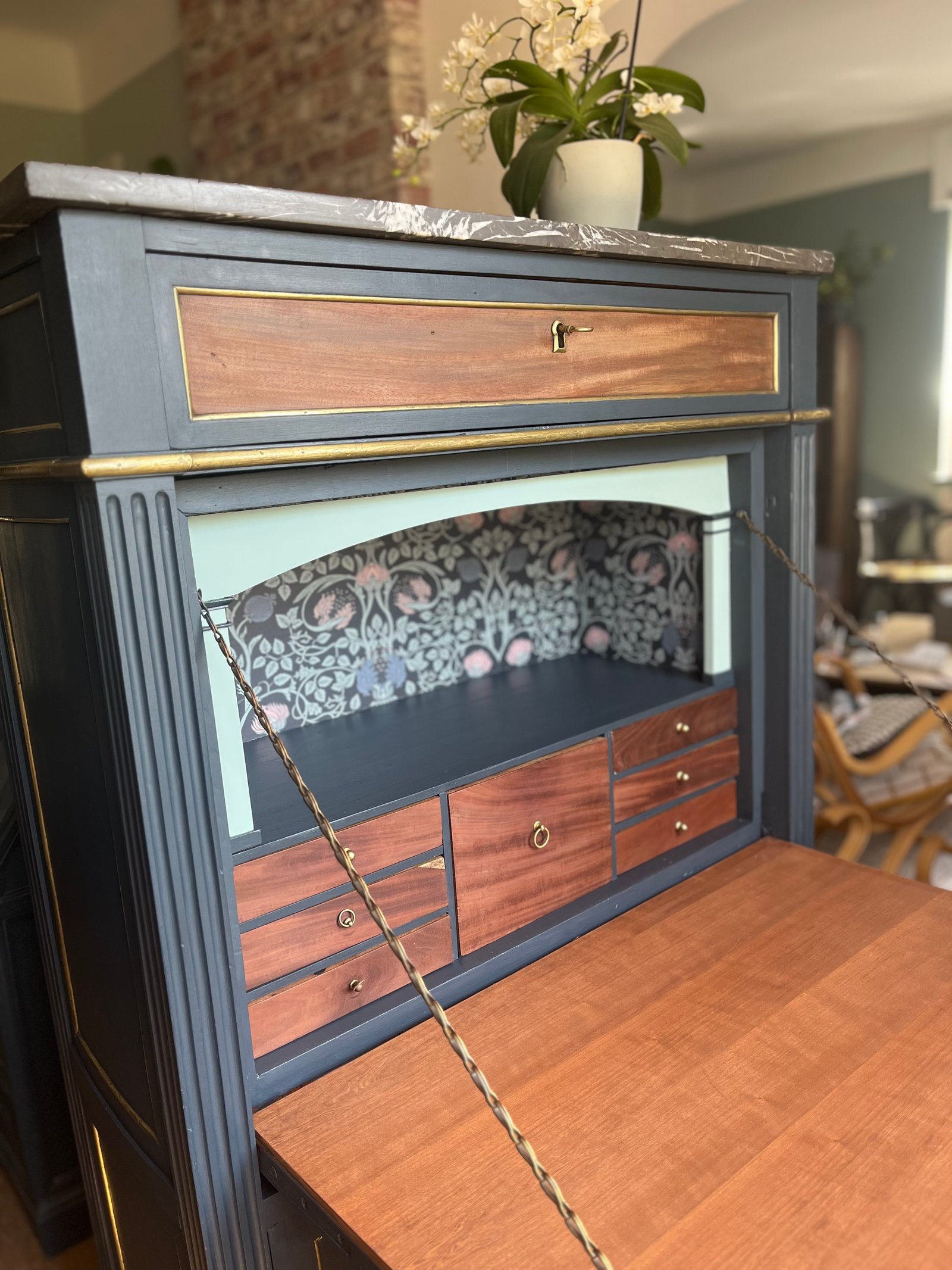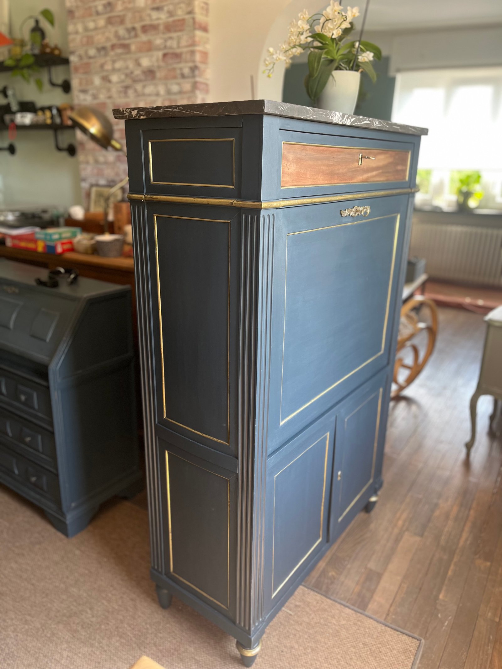 Secrétaire ancien relooké en bois de la marque Bric&Broc. Il a été restauré par un ébéniste. Et je l’ai relooké. Je l’ai repeint couleur ardoise, puis ciré. Intérieur tapissé et peint. Il a quelques traces du temps, mais qui lui donne un gage d’authenticité. ( quelques petits trous, quelques impacts sur le marbre mais pas de fissure).