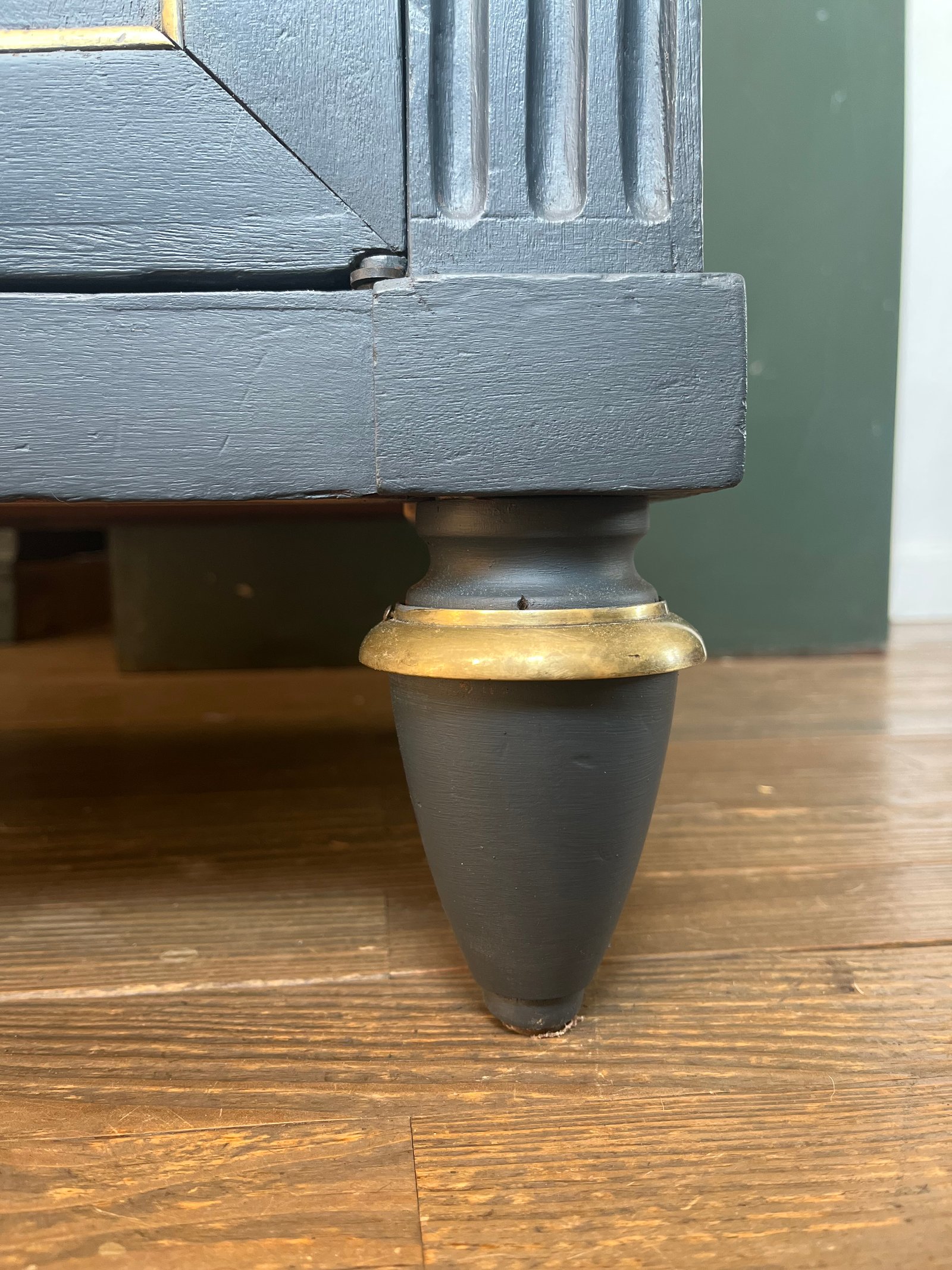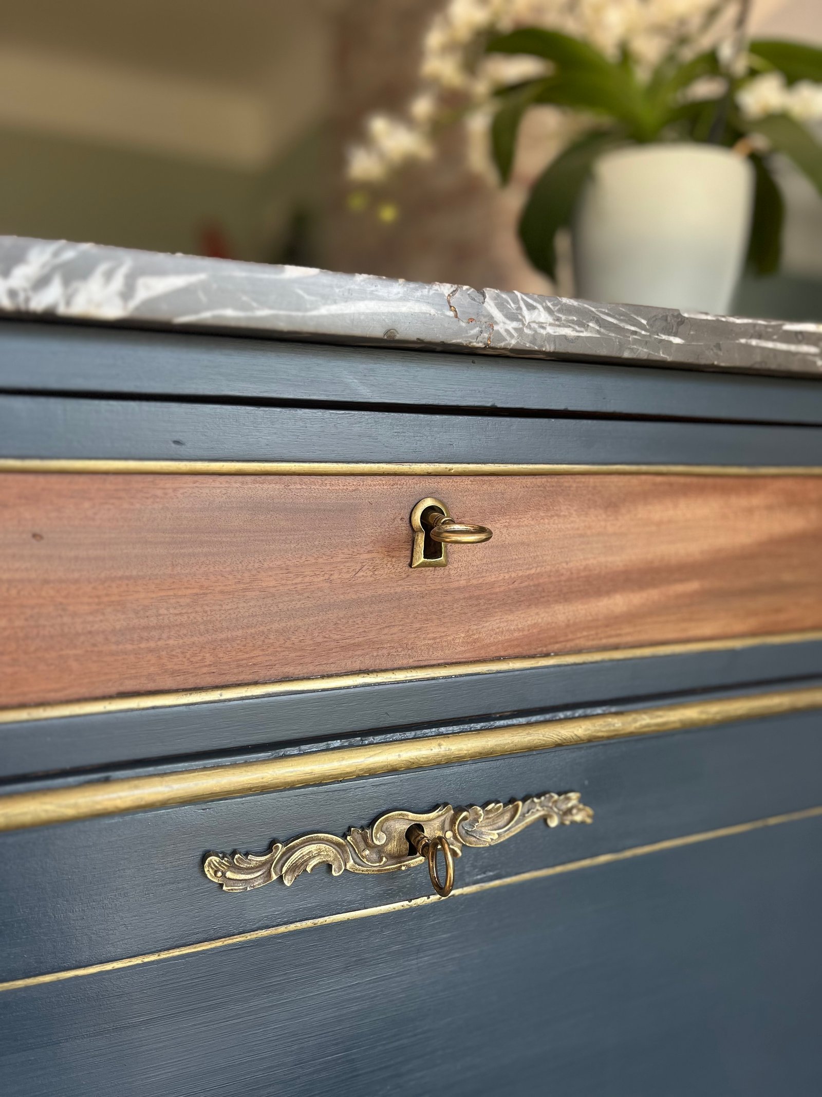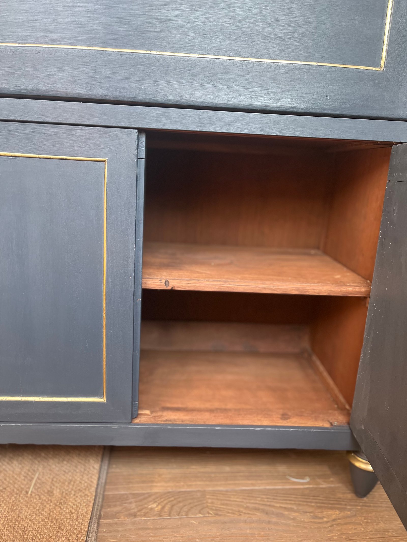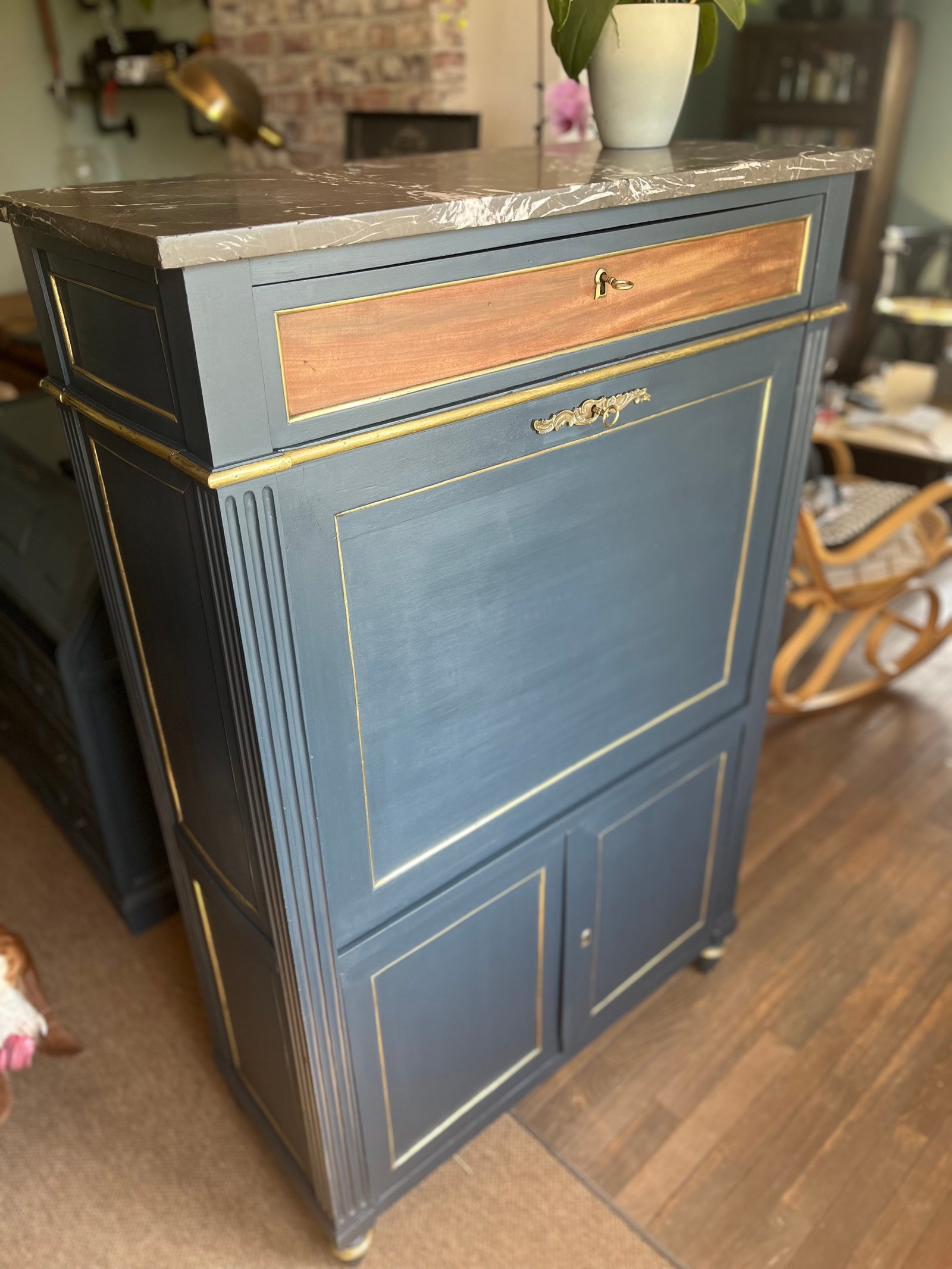Secrétaire ancien relooké en bois de la marque Bric&Broc. Il a été restauré par un ébéniste. Et je l’ai relooké. Je l’ai repeint couleur ardoise, puis ciré. Intérieur tapissé et peint. Il a quelques traces du temps, mais qui lui donne un gage d’authenticité. ( quelques petits trous, quelques impacts sur le marbre mais pas de fissure).