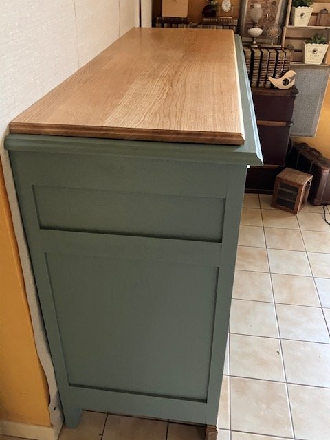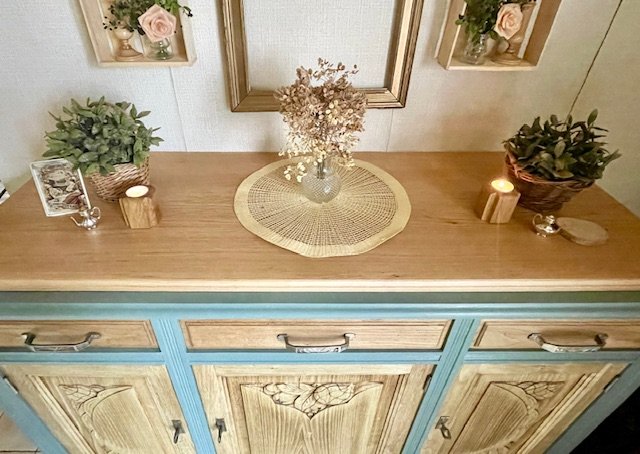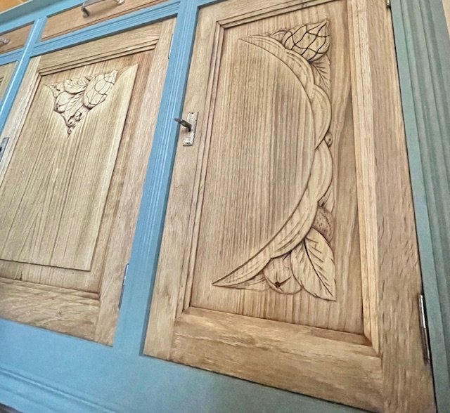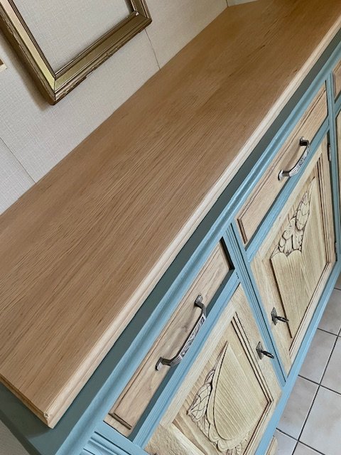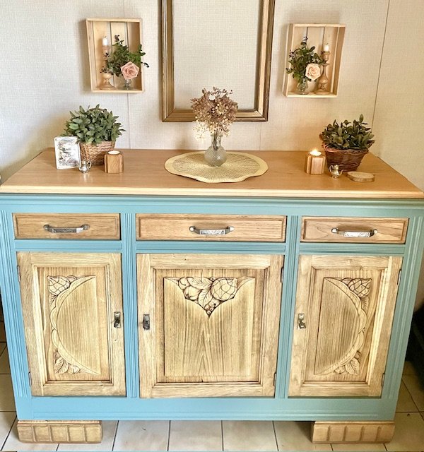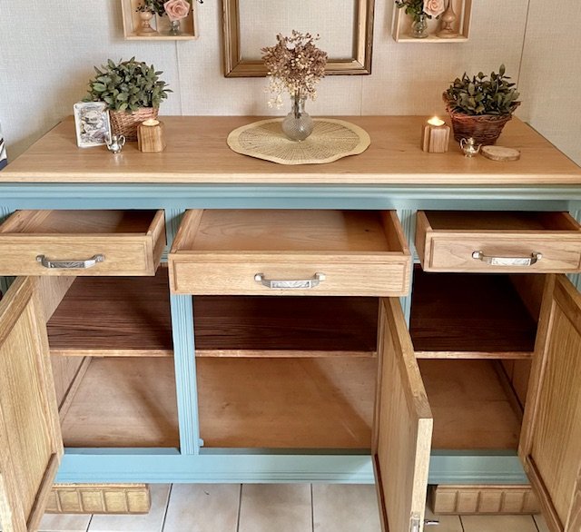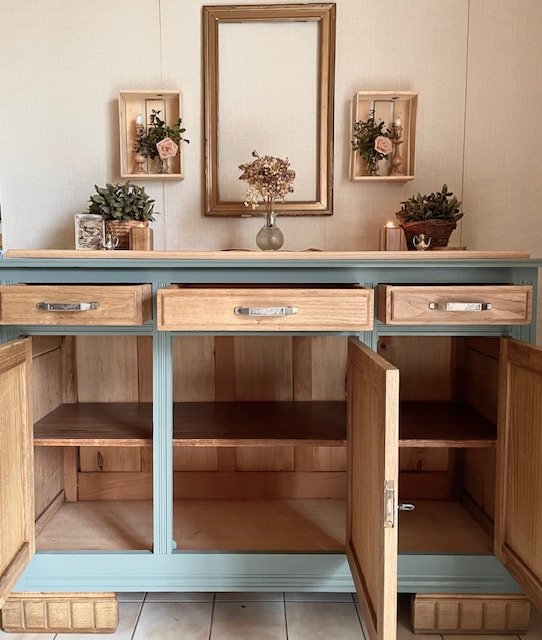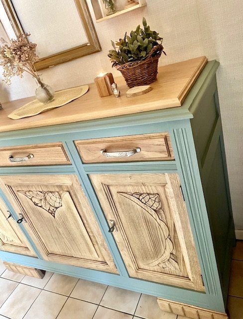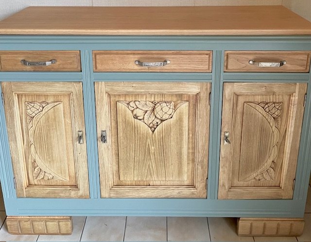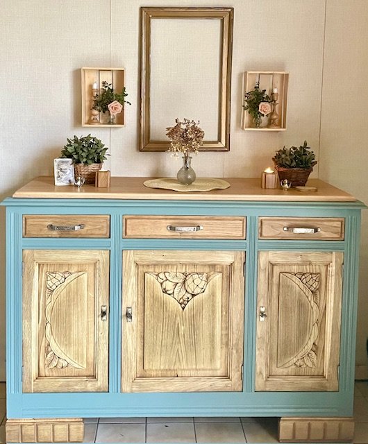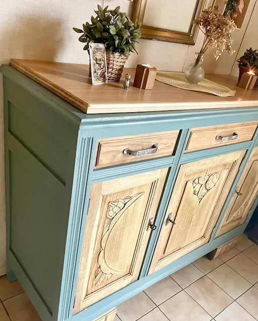 Cette partie basse d’un buffet 2 corps ancien a été entièrement décapée et rénovée avec soin pour révéler la noblesse de son chêne massif. Le plateau en marbre d’origine a été remplacé par un plateau en chêne clair, traité à la cire d’antiquaire, qui apporte chaleur et authenticité. Le bâti peint en vert sauge mat, très tendance, confère à l’ensemble un style rustique chic et vintage, idéal pour une déco campagne, bohème ou classique revisitée. Les poignées d’origine et les serrures fonctionnelles témoignent du soin apporté à la restauration. Avec ses dimensions (L : 139 cm ; H : 101 cm ; P : 49,5 cm), ce meuble offre une belle capacité de rangement tout en s’intégrant facilement dans une salle à manger, un salon ou une entrée. Une pièce unique, à la fois fonctionnelle et chargée d’histoire, qui apportera du cachet à votre intérieur.