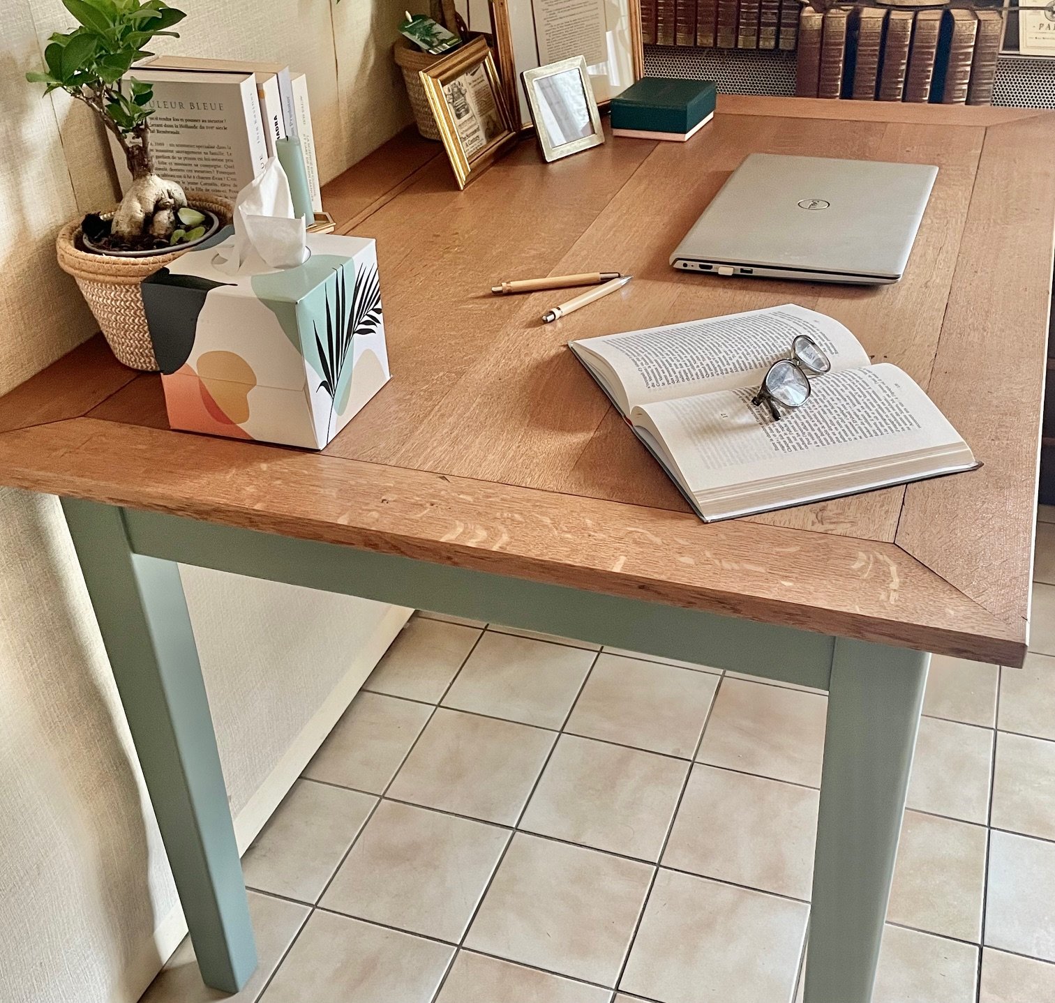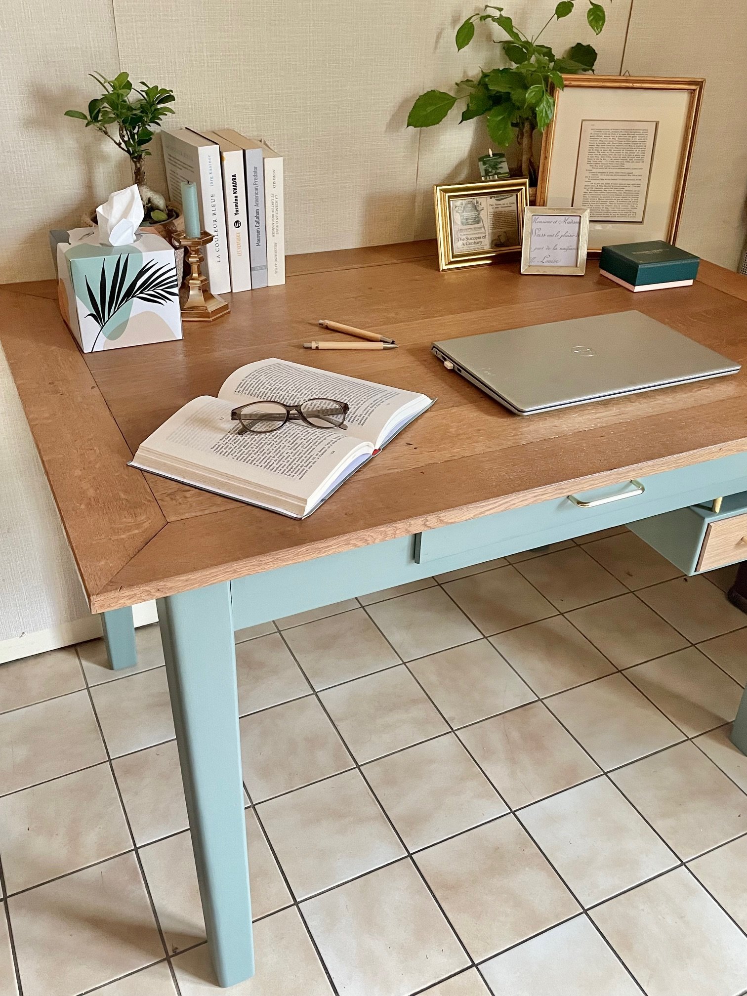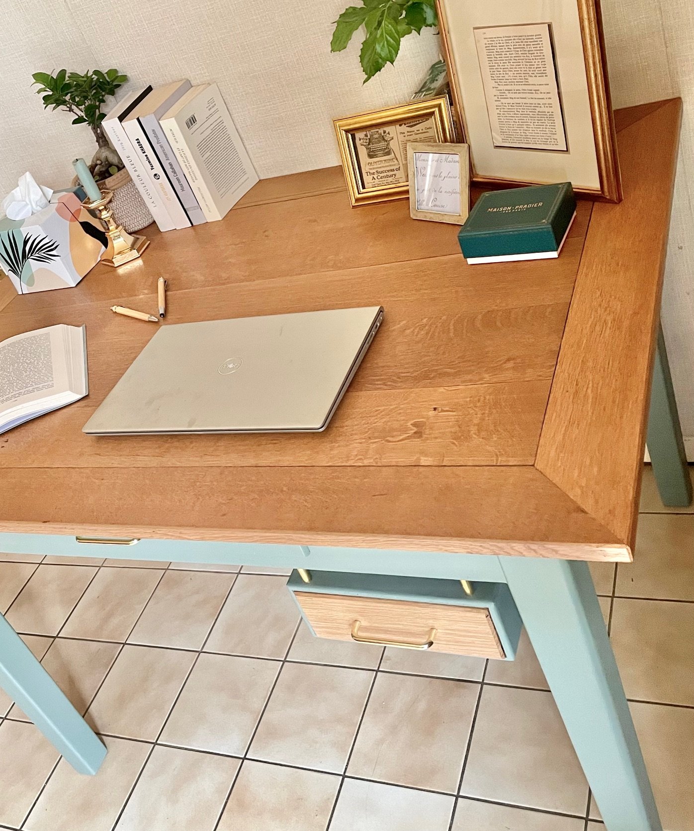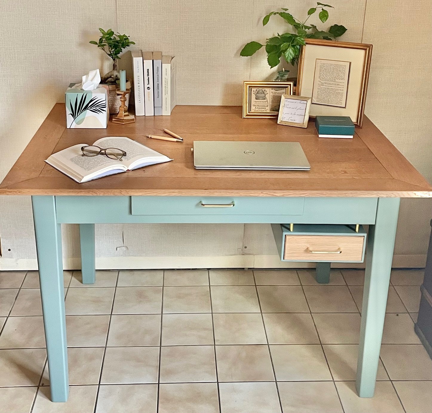Cette table ancienne en bois massif a été entièrement décapée et rénovée avec des produits V33 pour révéler la beauté de ses matériaux. Son plateau en chêne vitrifié incolore satiné offre une finition douce et résistante, tandis que son châssis en hêtre peint en vert sauge mat apporte une touche de fraîcheur et de modernité. Le tiroir suspendu à bagues en laiton, avec poignées assorties, ajoute du caractère tout en restant discret. Avec ses dimensions (L : 124 cm ; l : 88 cm ; H : 78 cm), elle est idéale comme bureau, console ou table d’appoint. Il est également possible de la convertir en table familiale en retirant le tiroir, ce qui en fait un meuble polyvalent et évolutif. Parfaite dans une déco rustique chic, scandinave ou bohème, elle conjugue authenticité, élégance et fonctionnalité.