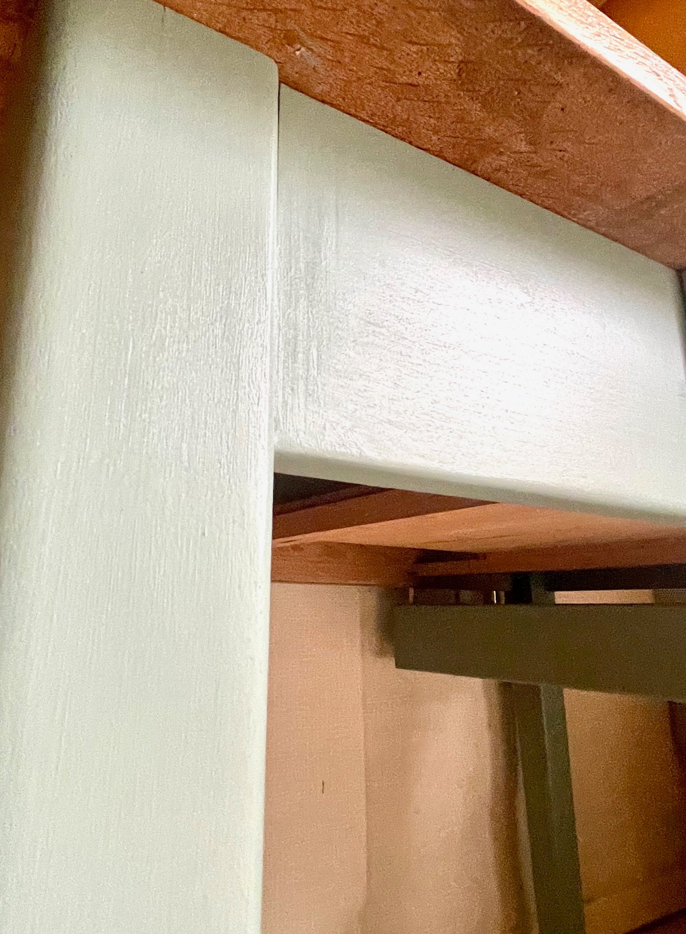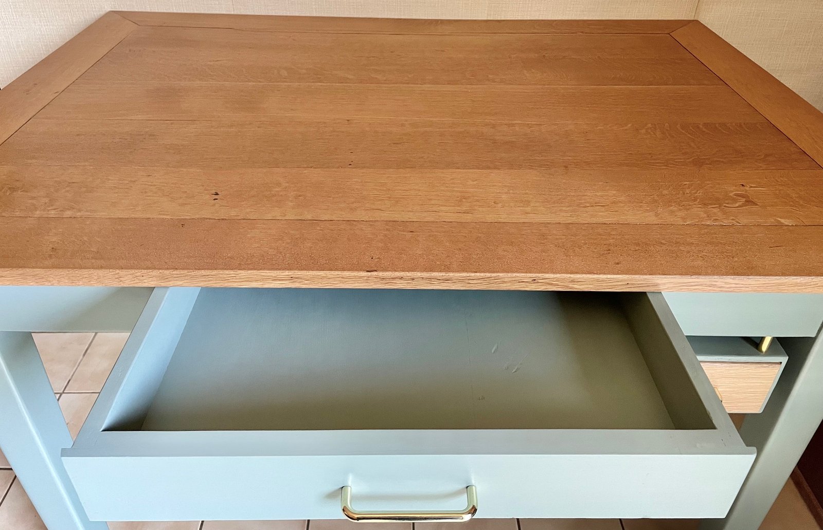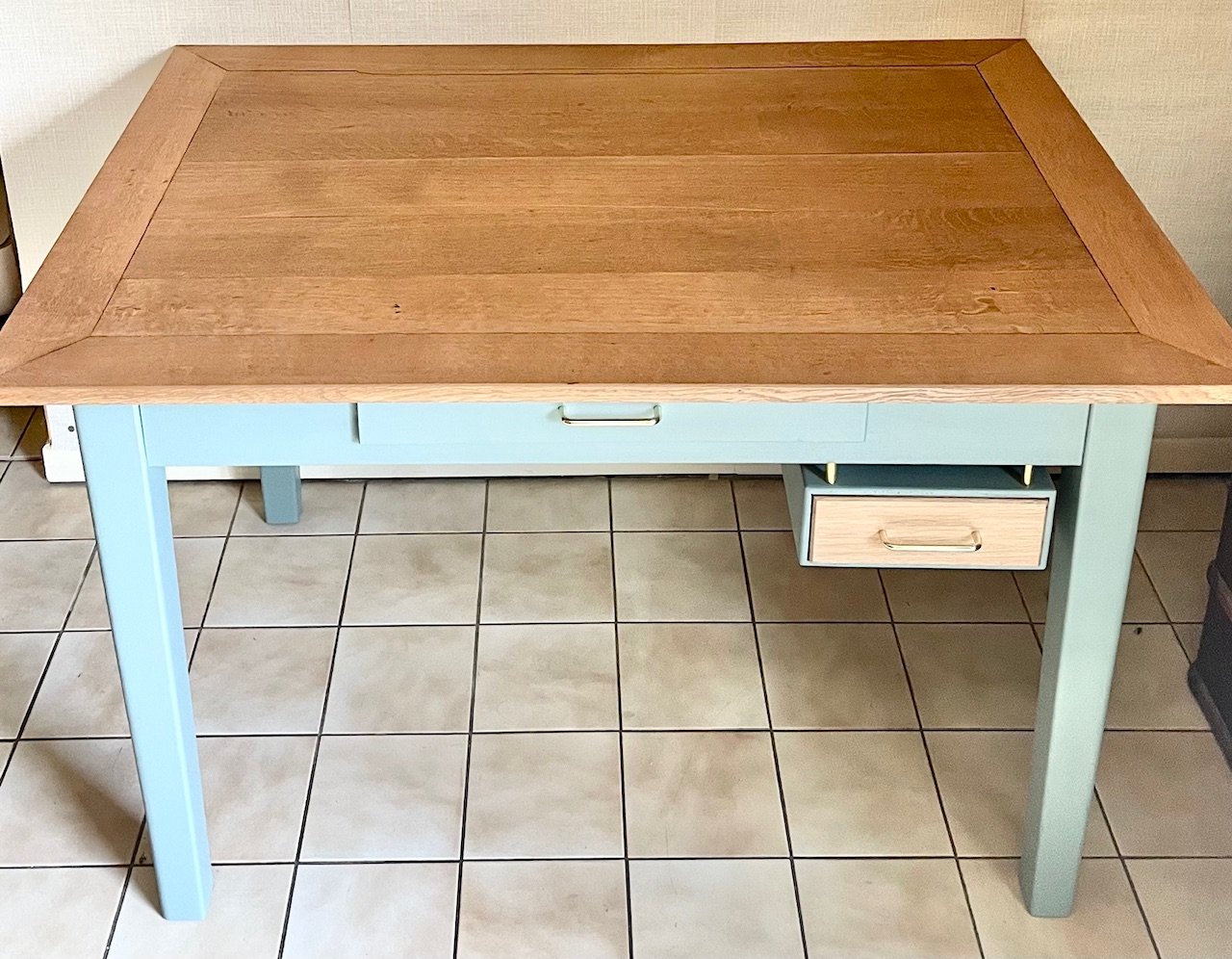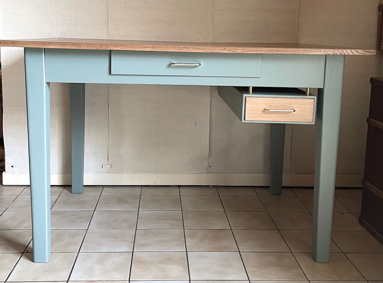 Cette table ancienne en bois massif a été entièrement décapée et rénovée avec des produits V33 pour révéler la beauté de ses matériaux. Son plateau en chêne vitrifié incolore satiné offre une finition douce et résistante, tandis que son châssis en hêtre peint en vert sauge mat apporte une touche de fraîcheur et de modernité. Le tiroir suspendu à bagues en laiton, avec poignées assorties, ajoute du caractère tout en restant discret. Avec ses dimensions (L : 124 cm ; l : 88 cm ; H : 78 cm), elle est idéale comme bureau, console ou table d’appoint. Il est également possible de la convertir en table familiale en retirant le tiroir, ce qui en fait un meuble polyvalent et évolutif. Parfaite dans une déco rustique chic, scandinave ou bohème, elle conjugue authenticité, élégance et fonctionnalité.