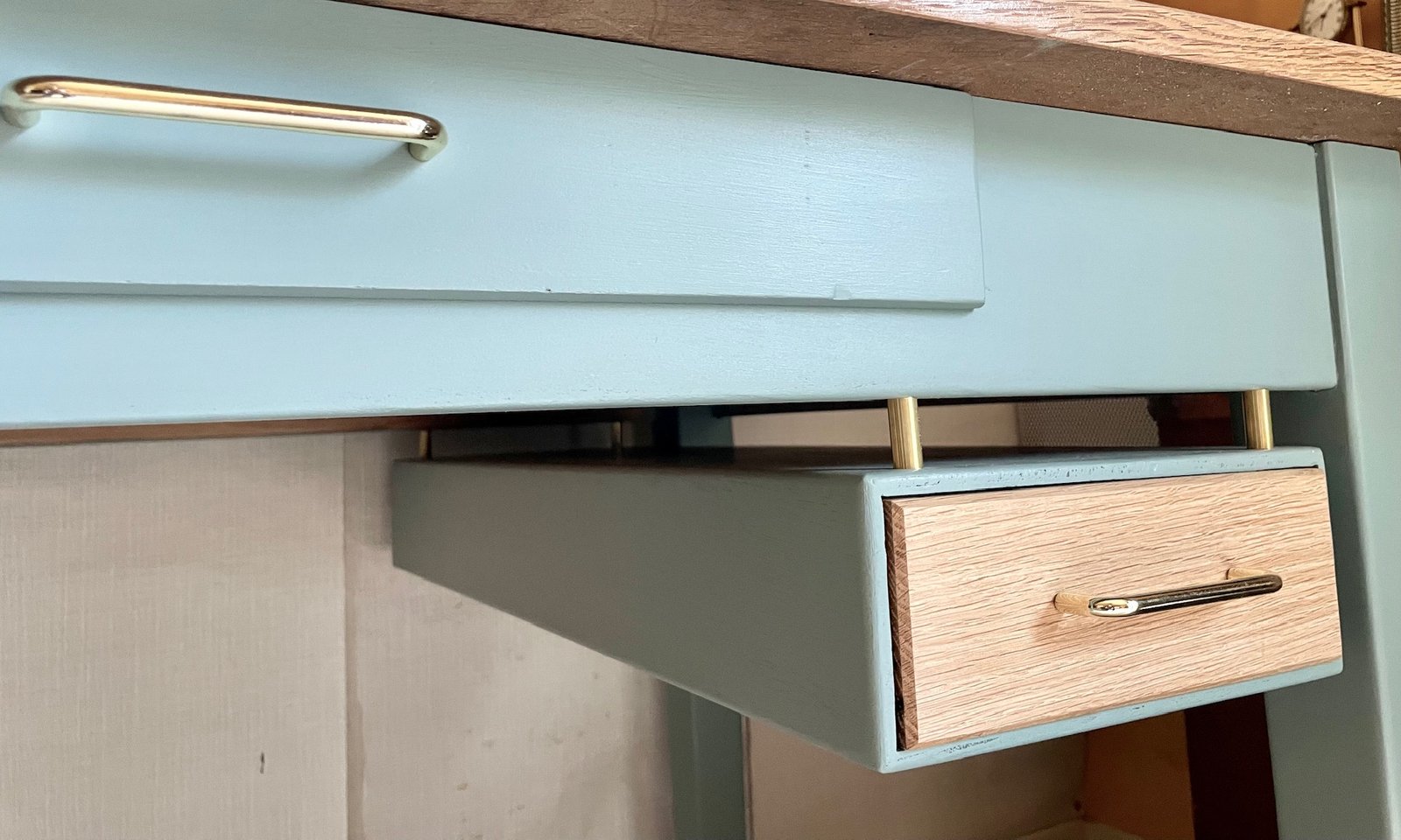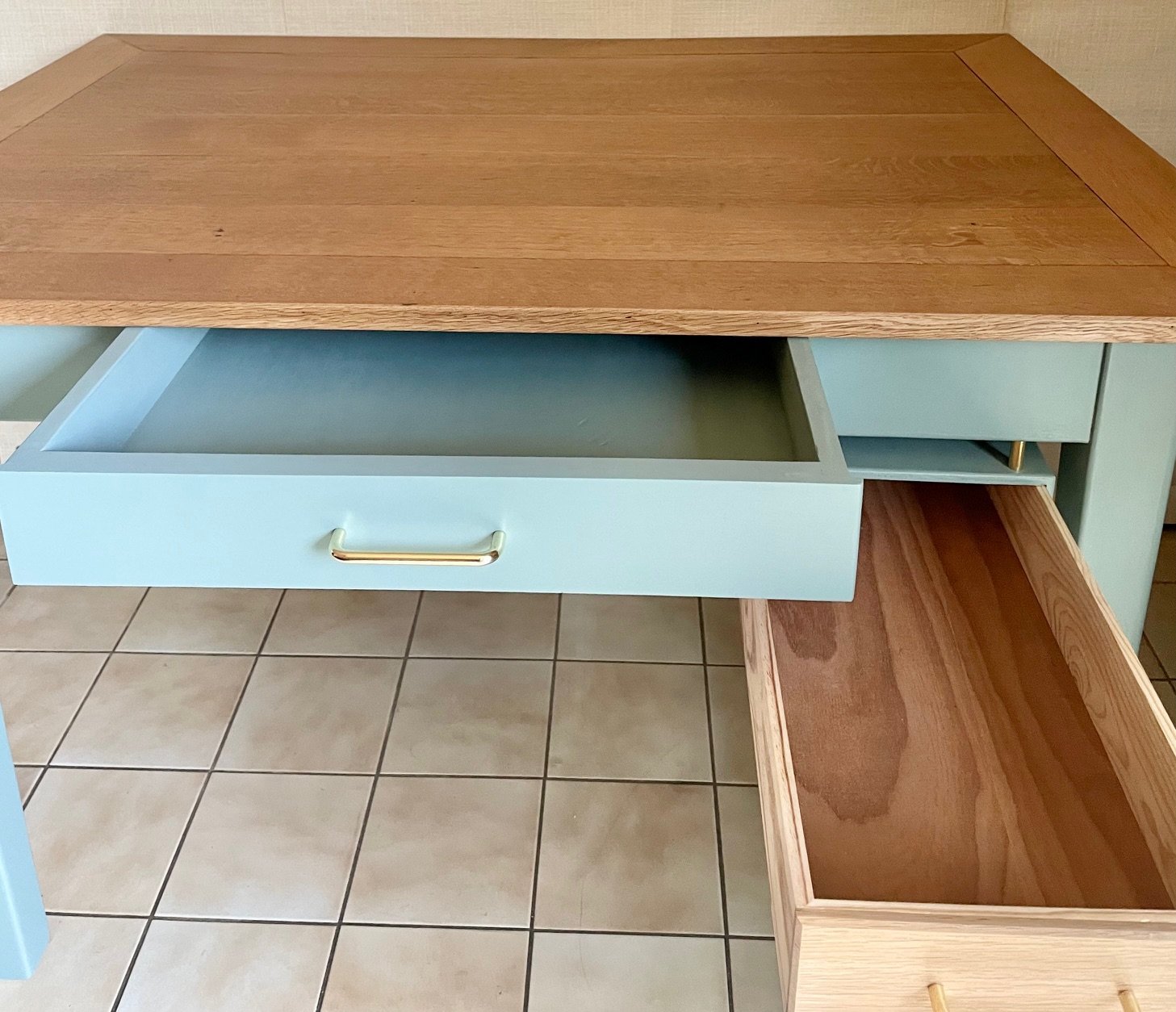 Issue de la brasserie de Basse Yutz, cette table ancienne a été soigneusement restaurée pour retrouver toute sa noblesse. Seul le châssis en hêtre, peint dans une teinte grège douce, a été conservé, tandis que deux tiroirs en façade chêne ont été ajoutés, ornés de poignées en laiton doré pour une finition raffinée. Le plateau à volets en chêne vitrifié incolore satiné surplombe l’ensemble, offrant une surface modulable selon vos besoins.