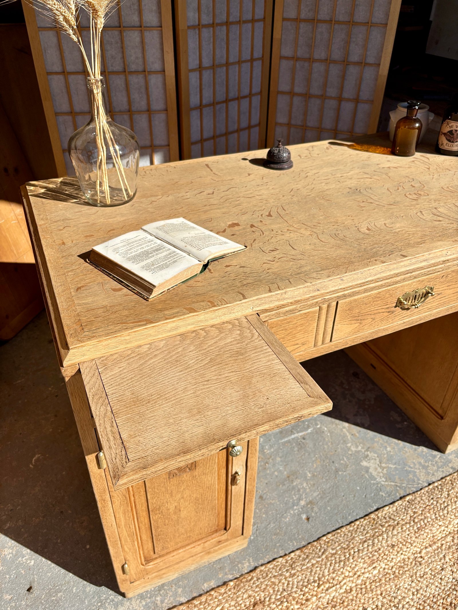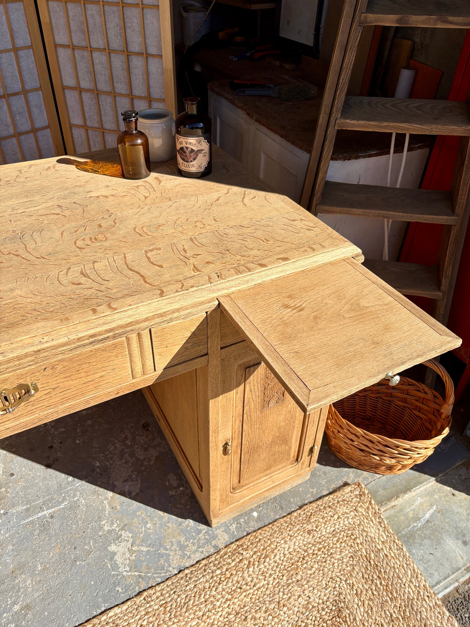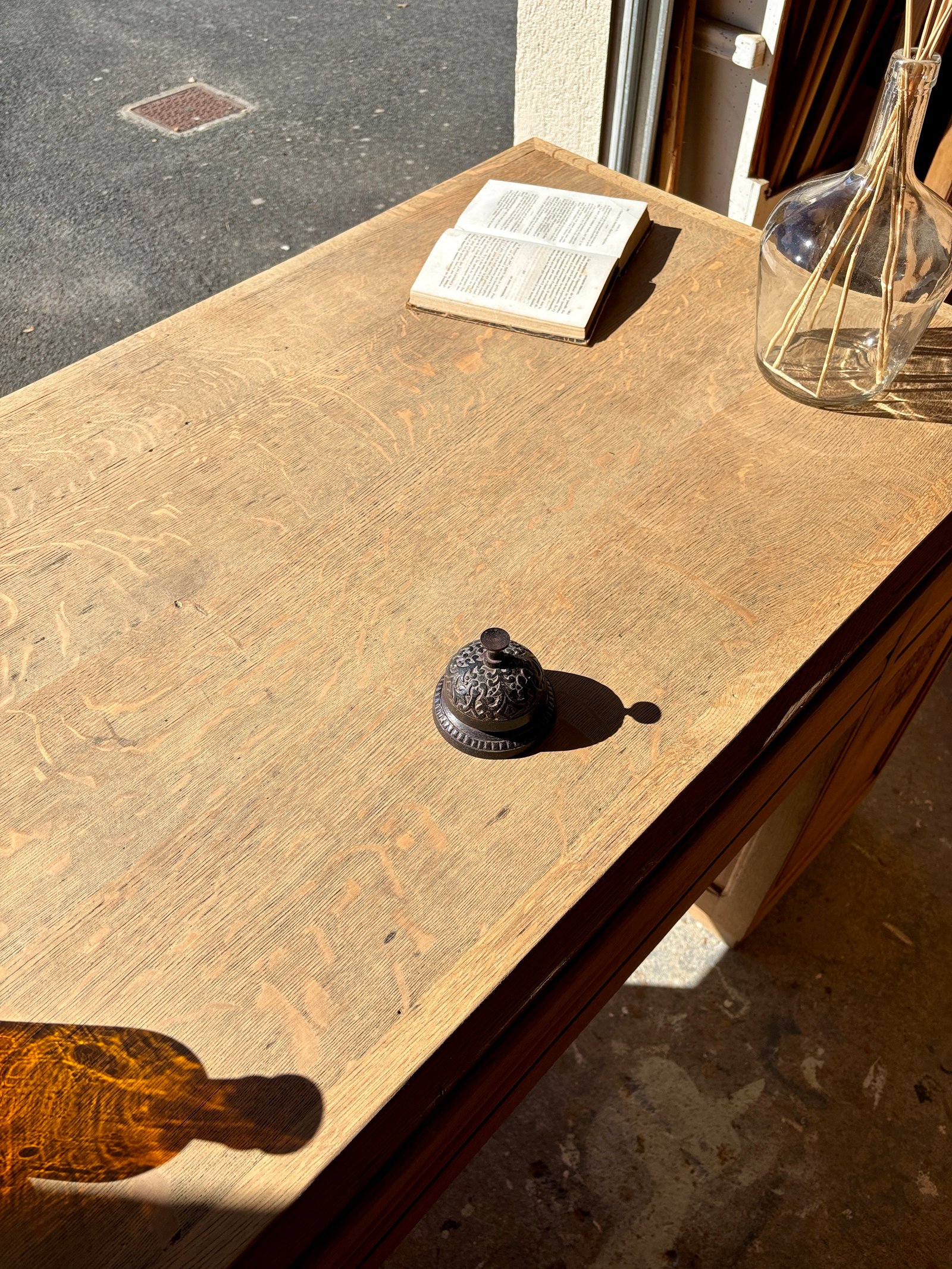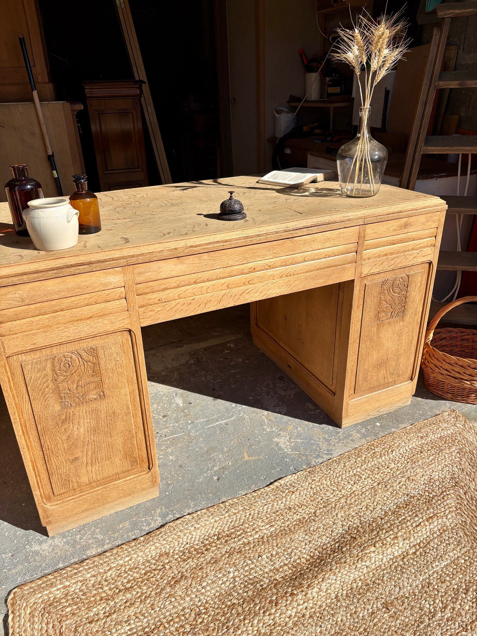 Ce bureau Art Déco des années 1930, réalisé en chêne massif, incarne l’élégance structurée et le raffinement de cette époque. Sa teinte claire et naturelle met en valeur le grain du bois, tandis que les moulures sculptées sur les façades et le dos en relief témoignent d’un savoir-faire artisanal remarquable. Fonctionnel, il dispose de trois tiroirs centraux, de deux portes latérales avec étagères intérieures, ainsi que de deux tablettes escamotables sous le plateau pour étendre l’espace de travail. Les poignées dorées ajoutent une touche de luxe discret. Grâce à son dos travaillé, il peut être placé au centre d’une pièce sans compromettre l’esthétique.