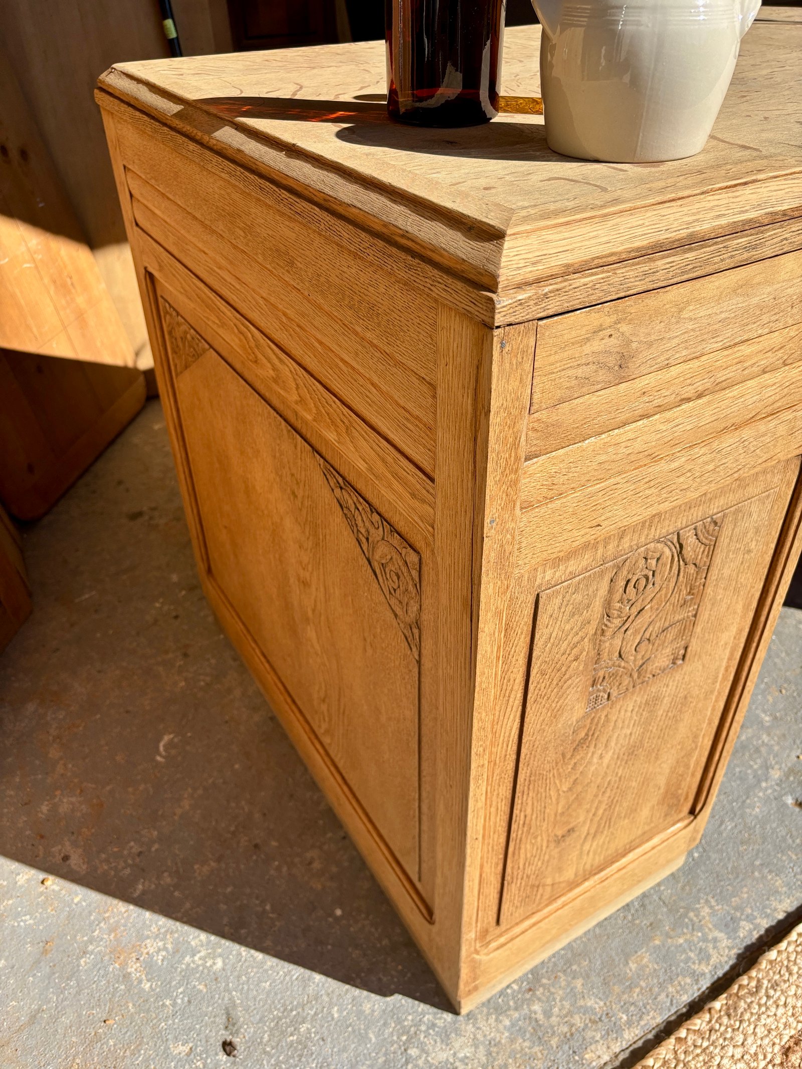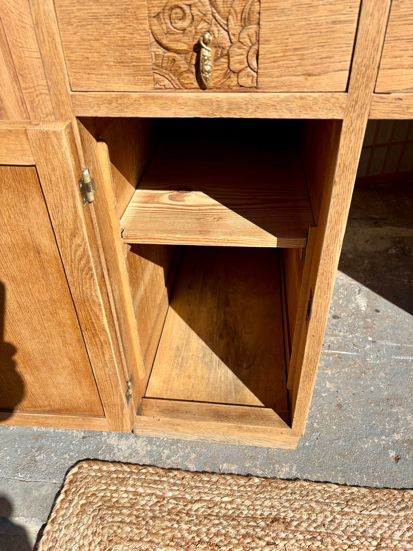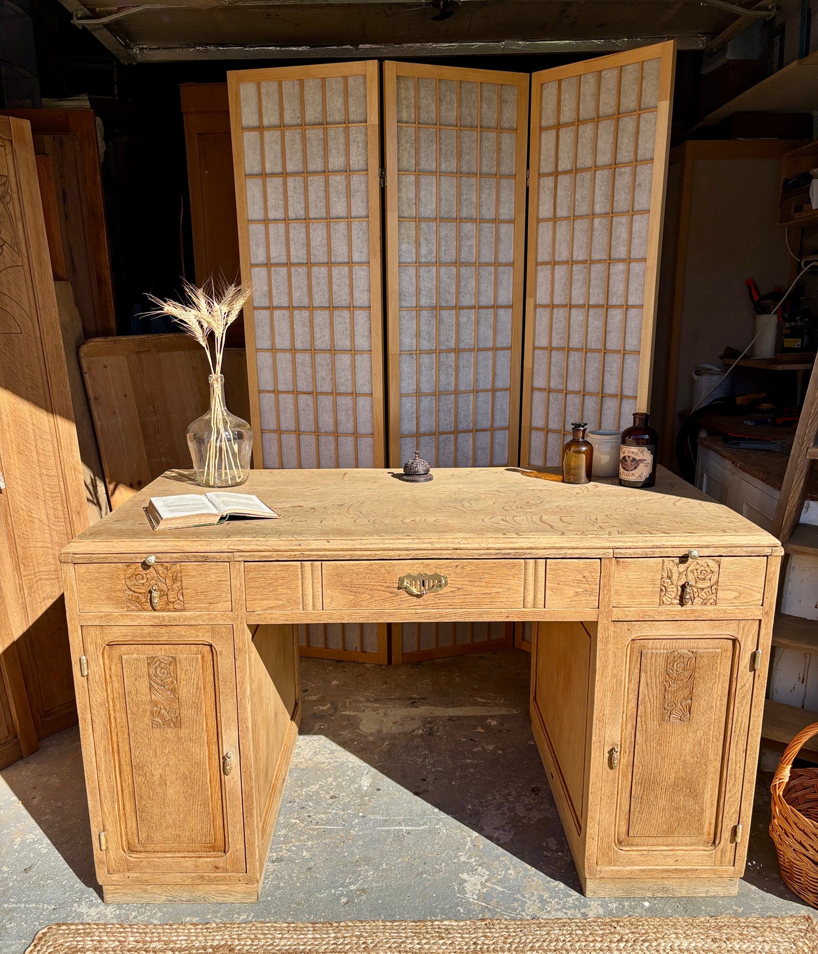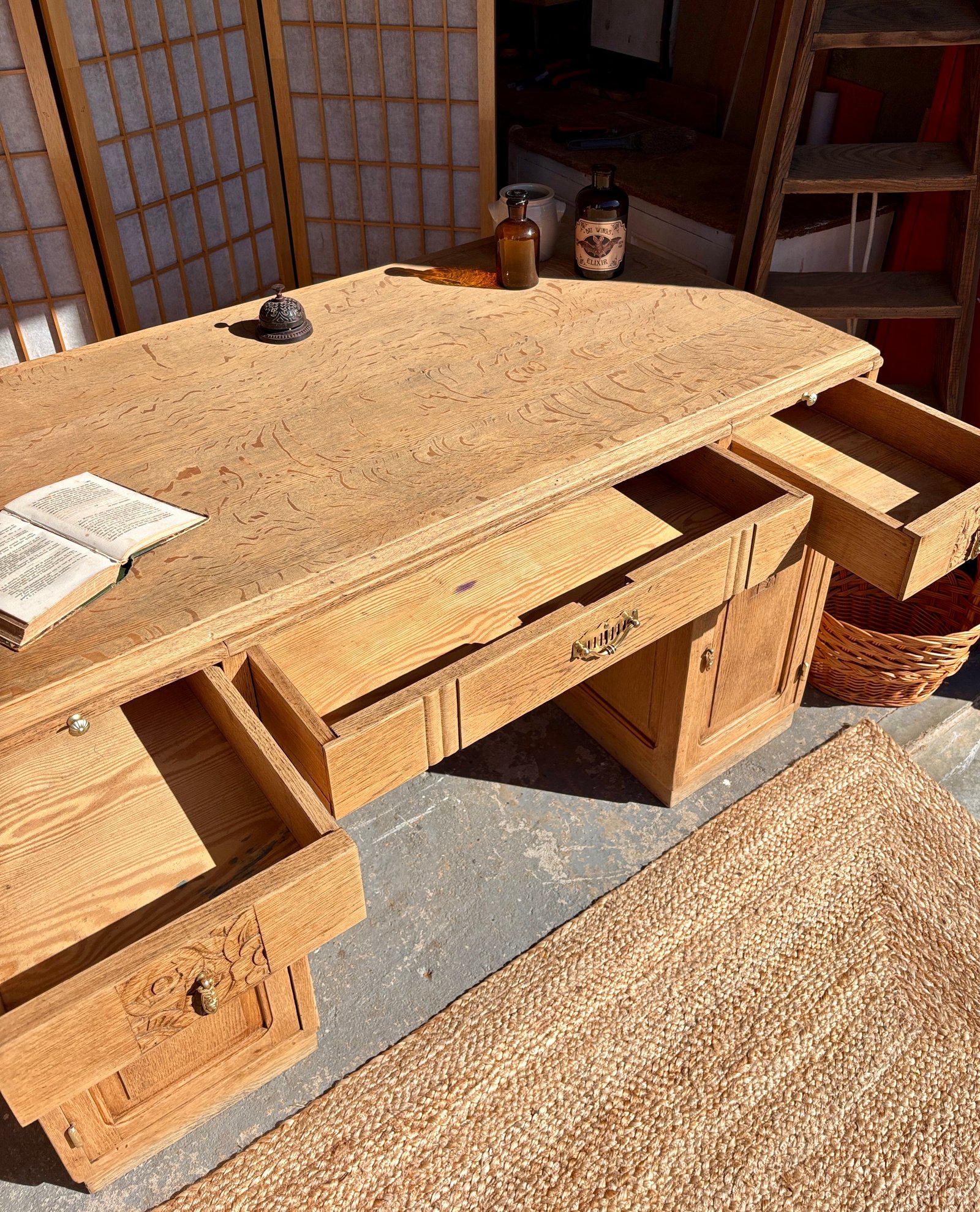 Ce bureau Art Déco des années 1930, réalisé en chêne massif, incarne l’élégance structurée et le raffinement de cette époque. Sa teinte claire et naturelle met en valeur le grain du bois, tandis que les moulures sculptées sur les façades et le dos en relief témoignent d’un savoir-faire artisanal remarquable. Fonctionnel, il dispose de trois tiroirs centraux, de deux portes latérales avec étagères intérieures, ainsi que de deux tablettes escamotables sous le plateau pour étendre l’espace de travail. Les poignées dorées ajoutent une touche de luxe discret. Grâce à son dos travaillé, il peut être placé au centre d’une pièce sans compromettre l’esthétique.