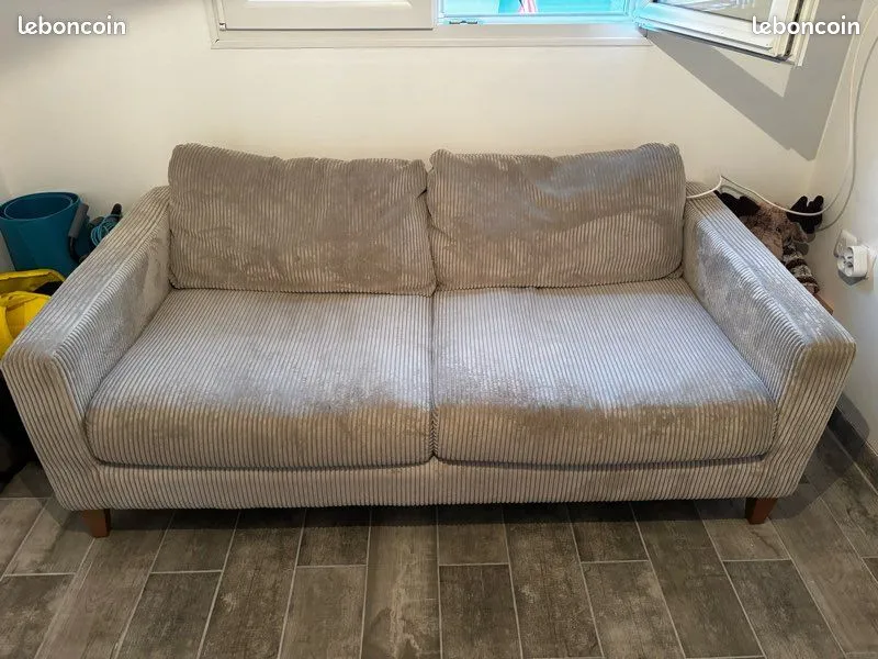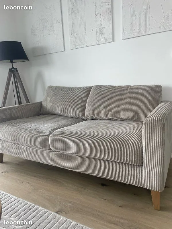 Canapé 3 places en velours côtelé gris clair, acheté chez Maisons du Monde il y a 1 an et demi pour 640 € (facture disponible). Son design épuré et ses lignes modernes s’intègrent parfaitement dans un intérieur contemporain, scandinave ou minimaliste. Le tissu côtelé apporte une touche chaleureuse et tendance, tout en étant résistant et agréable au toucher. Assise moelleuse et confortable, idéale pour recevoir vos invités autour d’un apéritif ou pour une soirée cinéma. Parfait également pour un appartement grâce à son format cosy et peu encombrant. Très bon état général, seul un léger frottement est visible sur le côté gauche (voir photos). Aucun défaut structurel, usage soigneux. Vendu pour cause de déménagement.