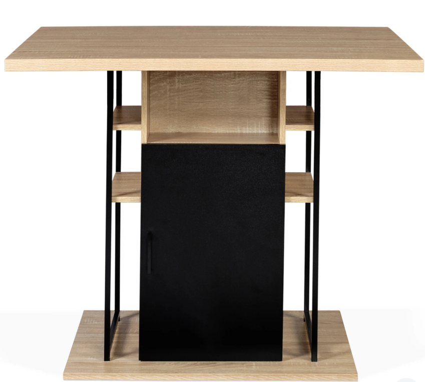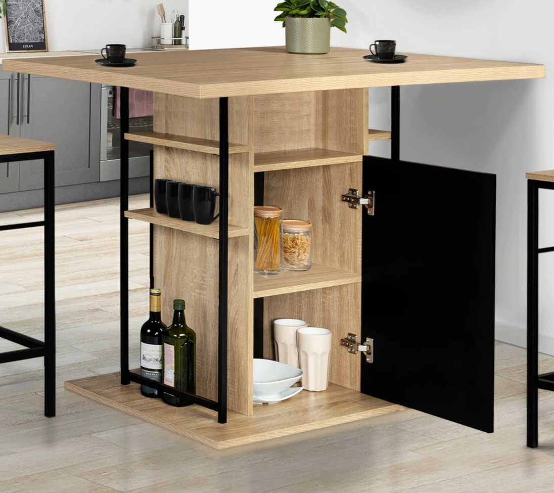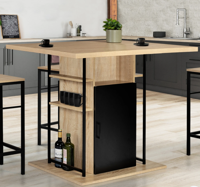 Parfait pour les cuisines modernes, cet îlot central au design industriel tendance combine esthétique et fonctionnalité. Son plateau carré en bois noir imitation hêtre repose sur une structure robuste en panneaux mélaminés, avec une épaisseur de 3 cm pour le plan de travail et 1,5 cm pour le bâti. Grâce à ses dimensions compactes (L. 110 x l. 80 x H. 90 cm), il s’intègre facilement dans les espaces réduits tout en offrant une maxi capacité de rangement : placard fermé, niche centrale et étagères latérales pour bouteilles ou accessoires. Ce meuble polyvalent peut accueillir jusqu’à 6 personnes, idéal comme coin repas, plan de travail ou bar convivial. Sa finition bois noir et ses lignes épurées s’adaptent à tous les styles : industriel, contemporain, scandinave. En excellent état, prêt à l’usage.