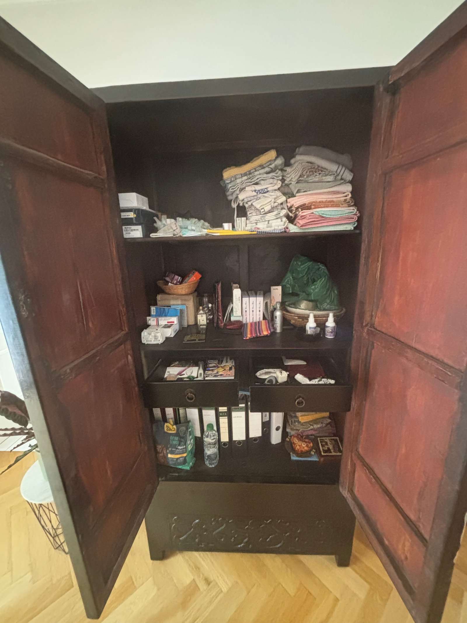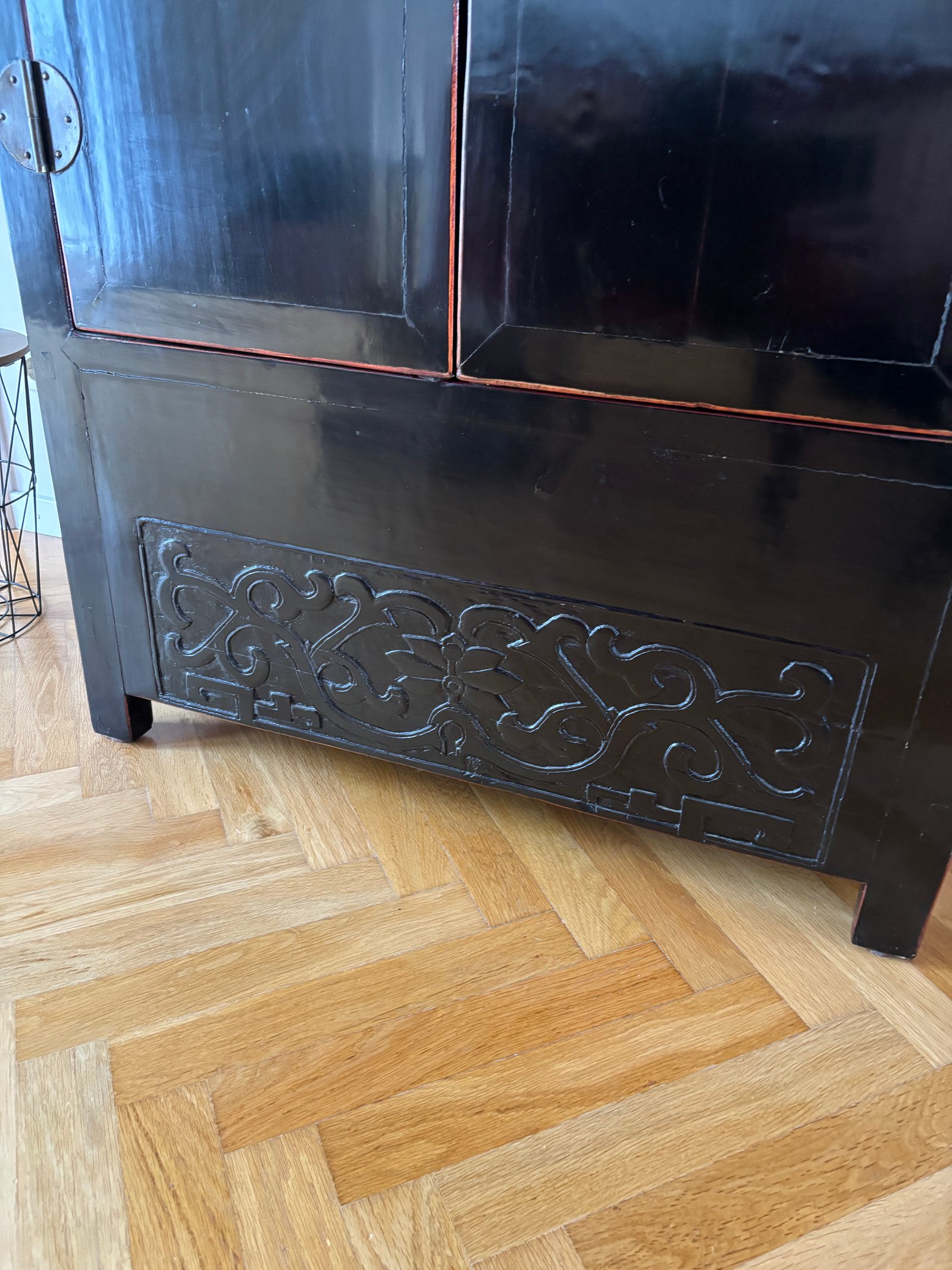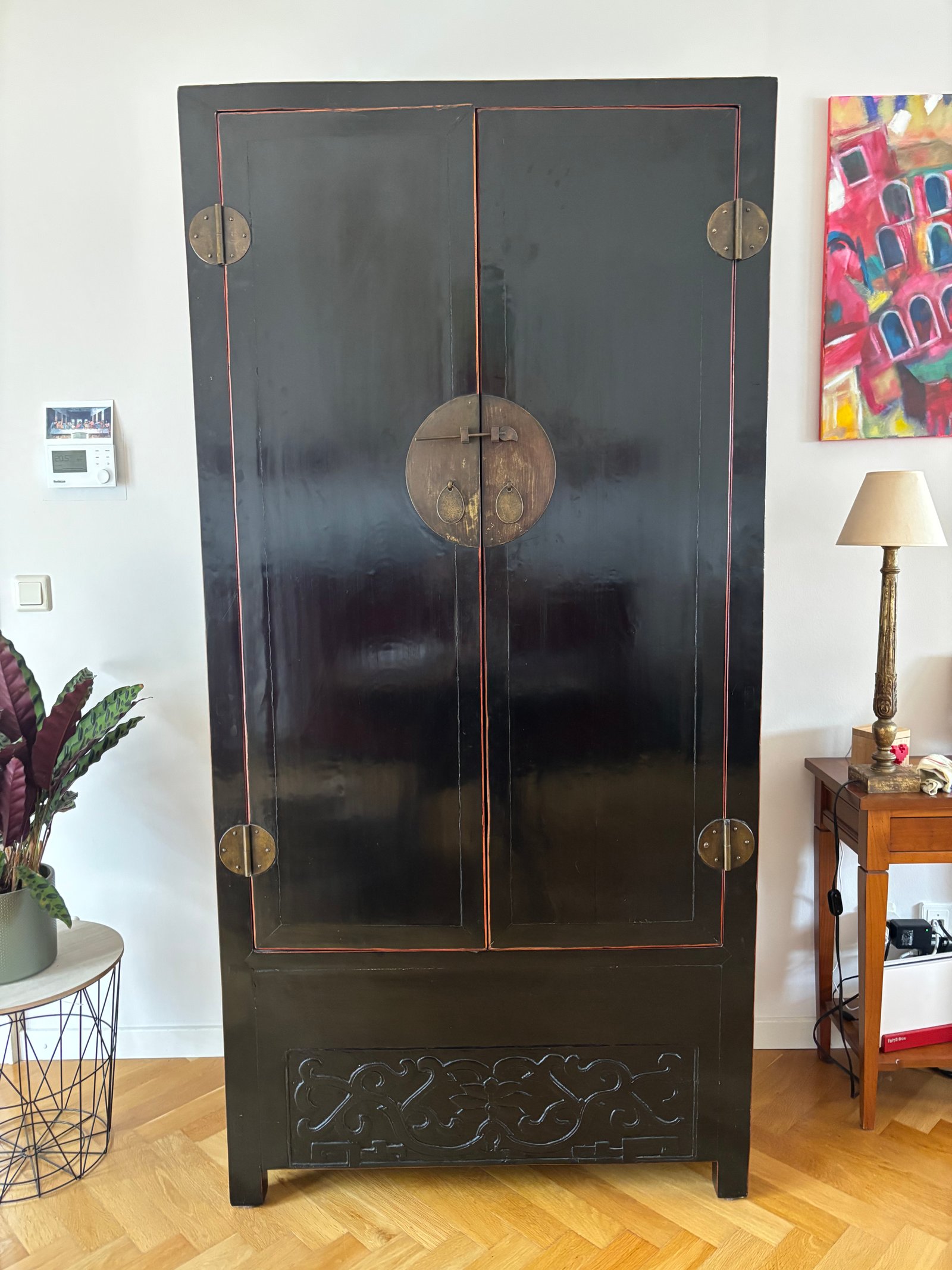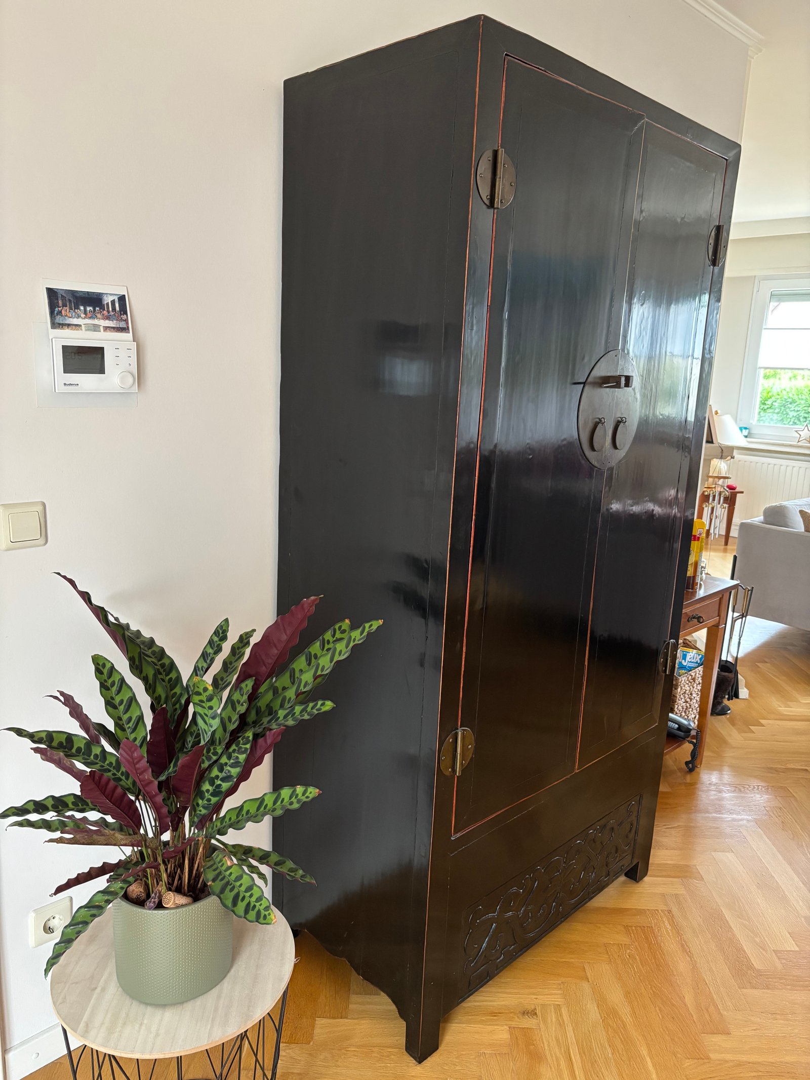 Cette armoire de style asiatique, en bois noir laqué, est une pièce décorative raffinée tout en offrant une grande capacité de rangement. Provenant du magasin spécialisé China Collection Luxembourg, elle incarne l’esthétique traditionnelle chinoise avec ses ferrures métalliques circulaires, ses portes pleines et son socle sculpté. Ses dimensions généreuses (L. 95 x H. 192 x P. 50 cm) permettent d’organiser vêtements, linge ou objets précieux. Un atout discret : une petite trappe intérieure permet de dissimuler un coffre-fort ou rangement sécurisé, idéal pour les effets personnels. Parfaite dans un salon, une chambre ou un bureau, cette armoire s’intègre aussi bien dans une décoration zen, ethnique ou contemporaine.
