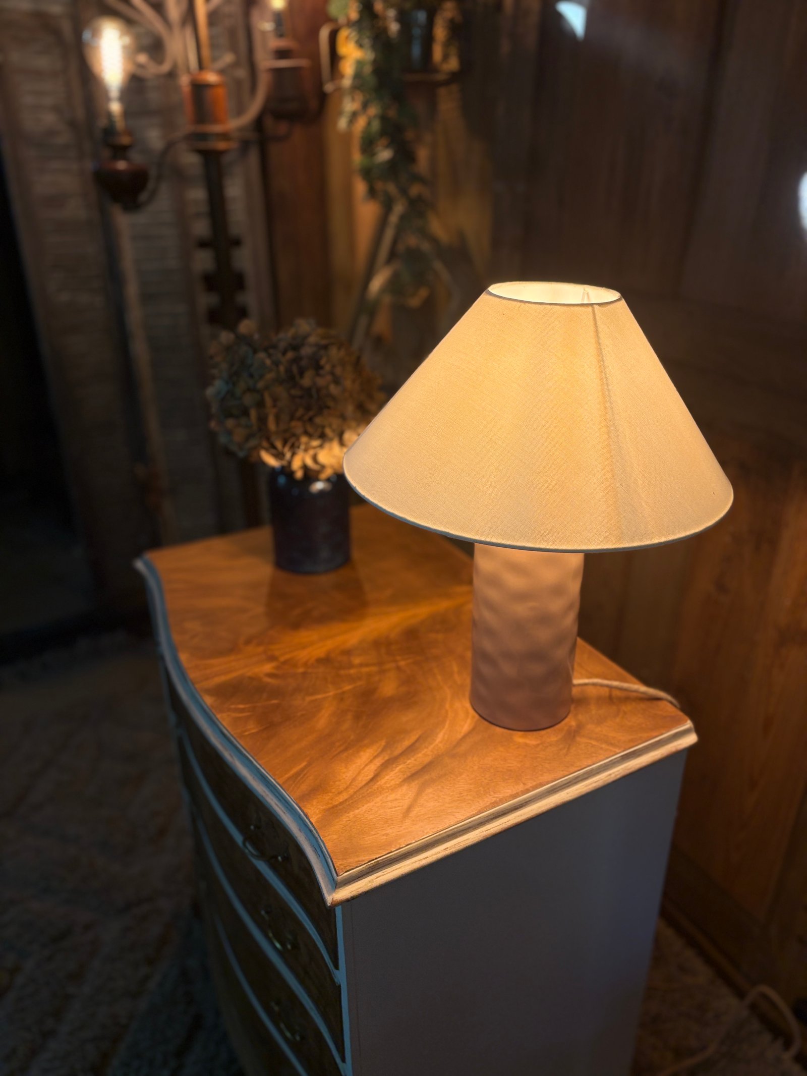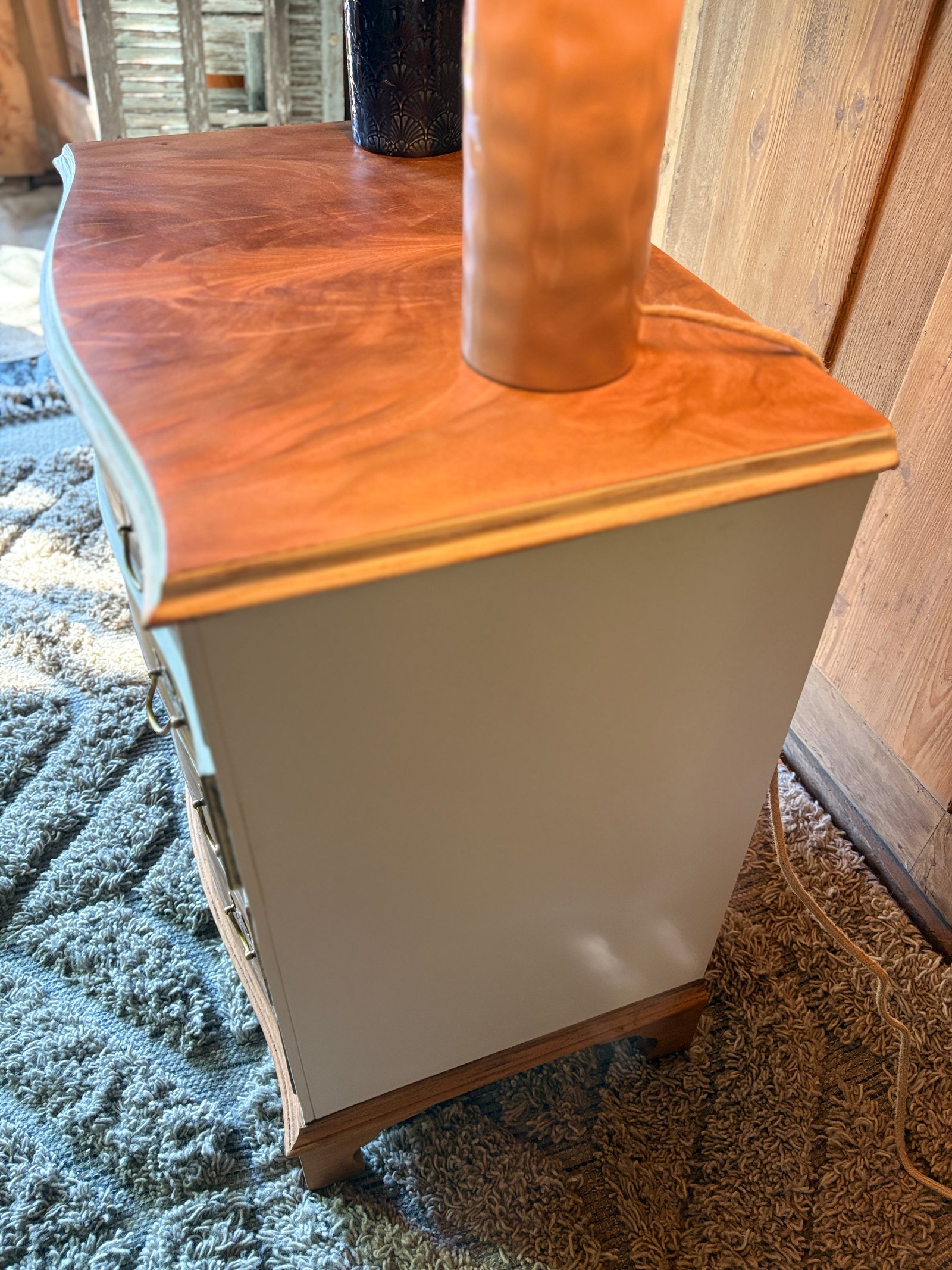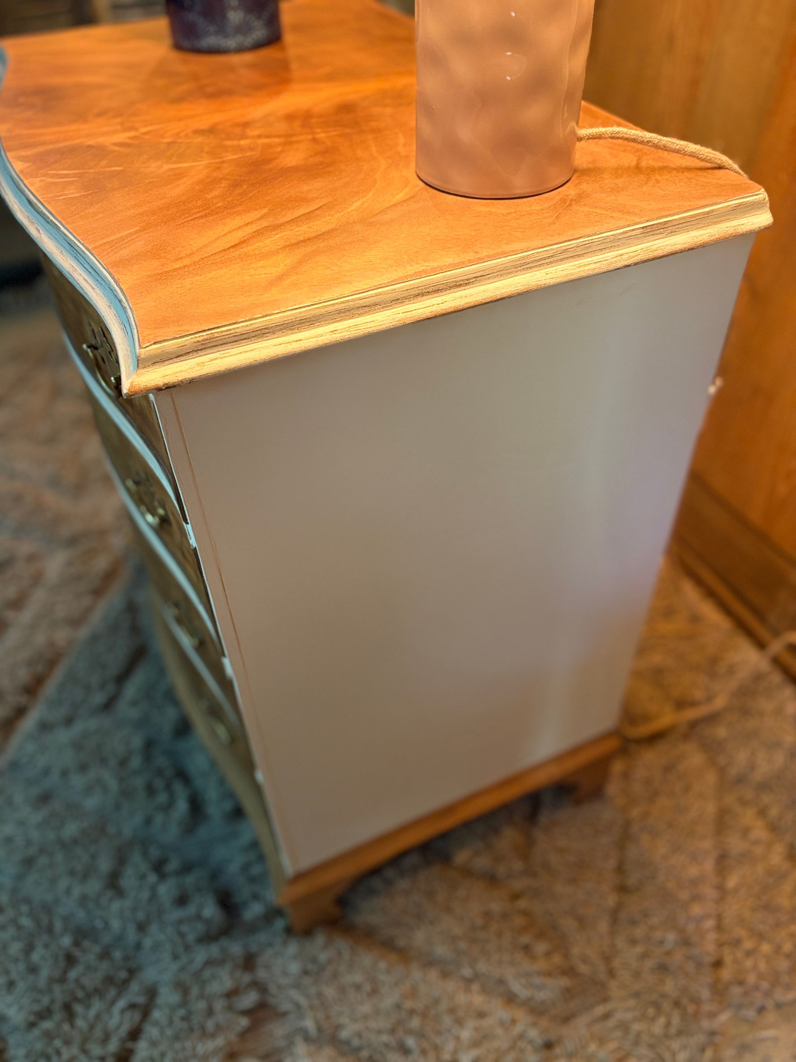 Commode vintage 4 tiroirs en bois massif, entièrement restaurée dans un esprit doux et authentique. Peinte en crème avec un plateau laissé brut pour révéler le veinage naturel du bois, elle allie charme ancien et fonctionnalité moderne. Les poignées en laiton et les pieds galbés renforcent son style campagne chic, idéal pour une déco bohème, rétro ou scandinave. Chaque tiroir est tapissé d’un motif chevron beige et blanc, apportant une touche graphique discrète et soignée. Parfaite en meuble d’entrée, commode de chambre ou meuble d’appoint dans une salle de bain, elle offre un rangement pratique tout en apportant du caractère à votre intérieur.