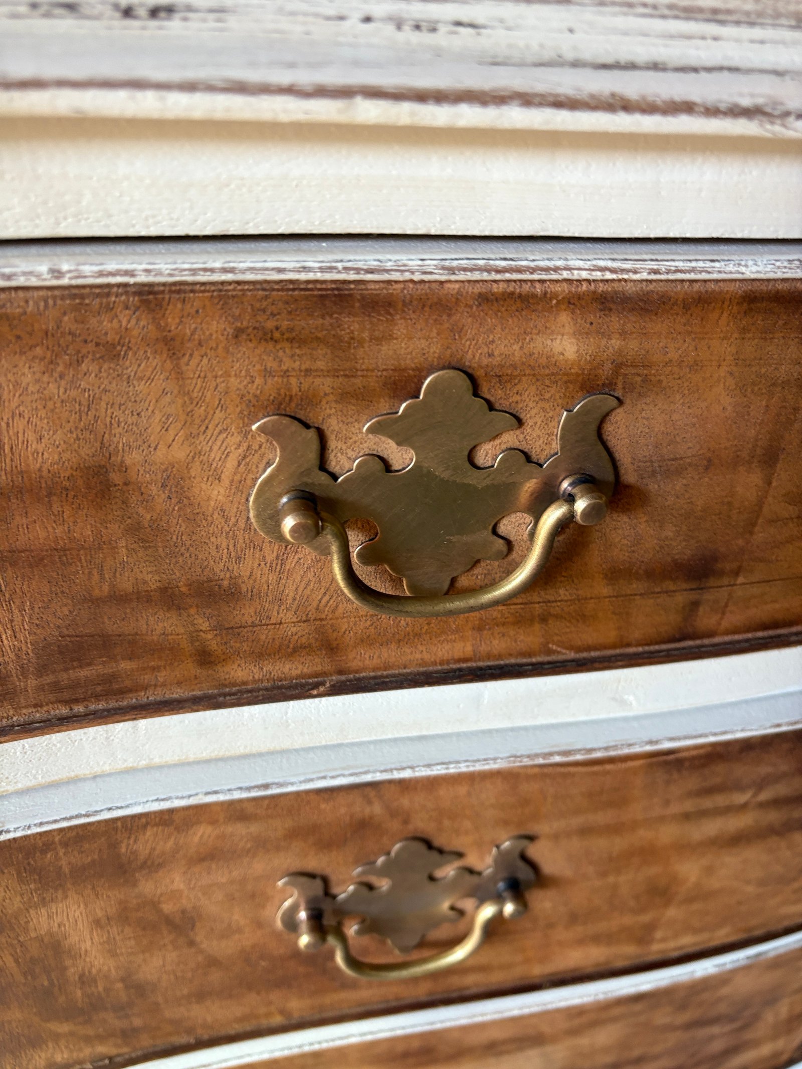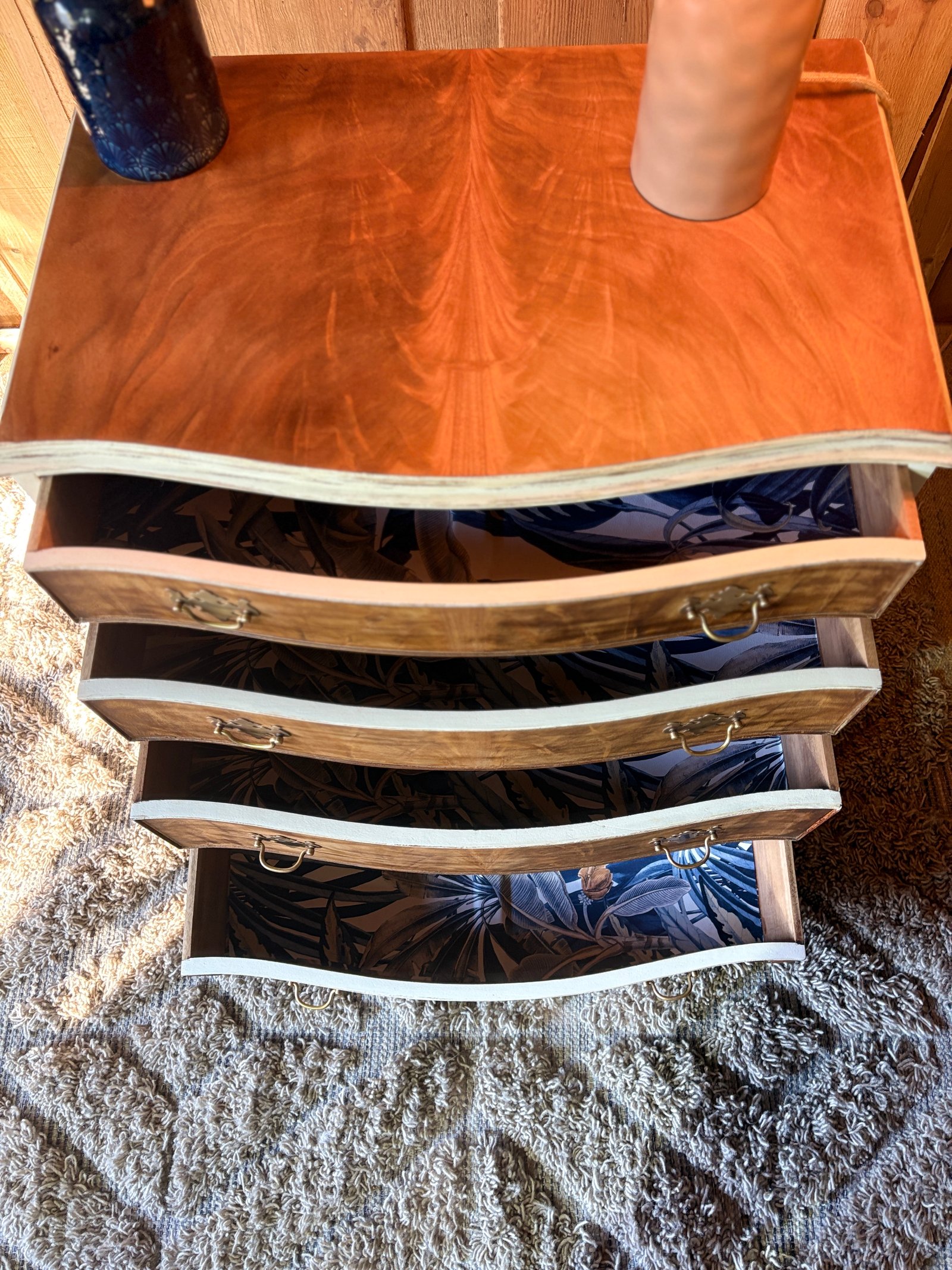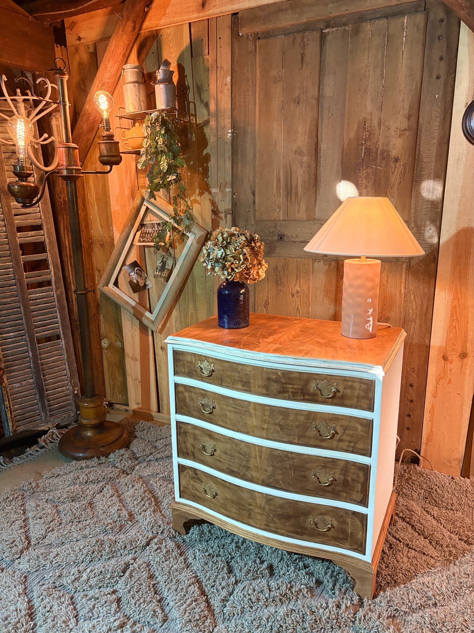 Cette élégante commode ancienne a été entièrement restaurée pour lui offrir une seconde vie pleine de douceur. Peinte dans un ivoire lumineux de chez Libéron®, elle dévoile des lignes féminines et arrondies qui s’intègrent parfaitement dans une décoration romantique, bohème ou campagne chic. Les tiroirs patinés contrastent subtilement avec le bois blond satiné, tandis que l’intérieur est habillé d’un papier feuillage rétro, apportant une touche poétique et raffinée.