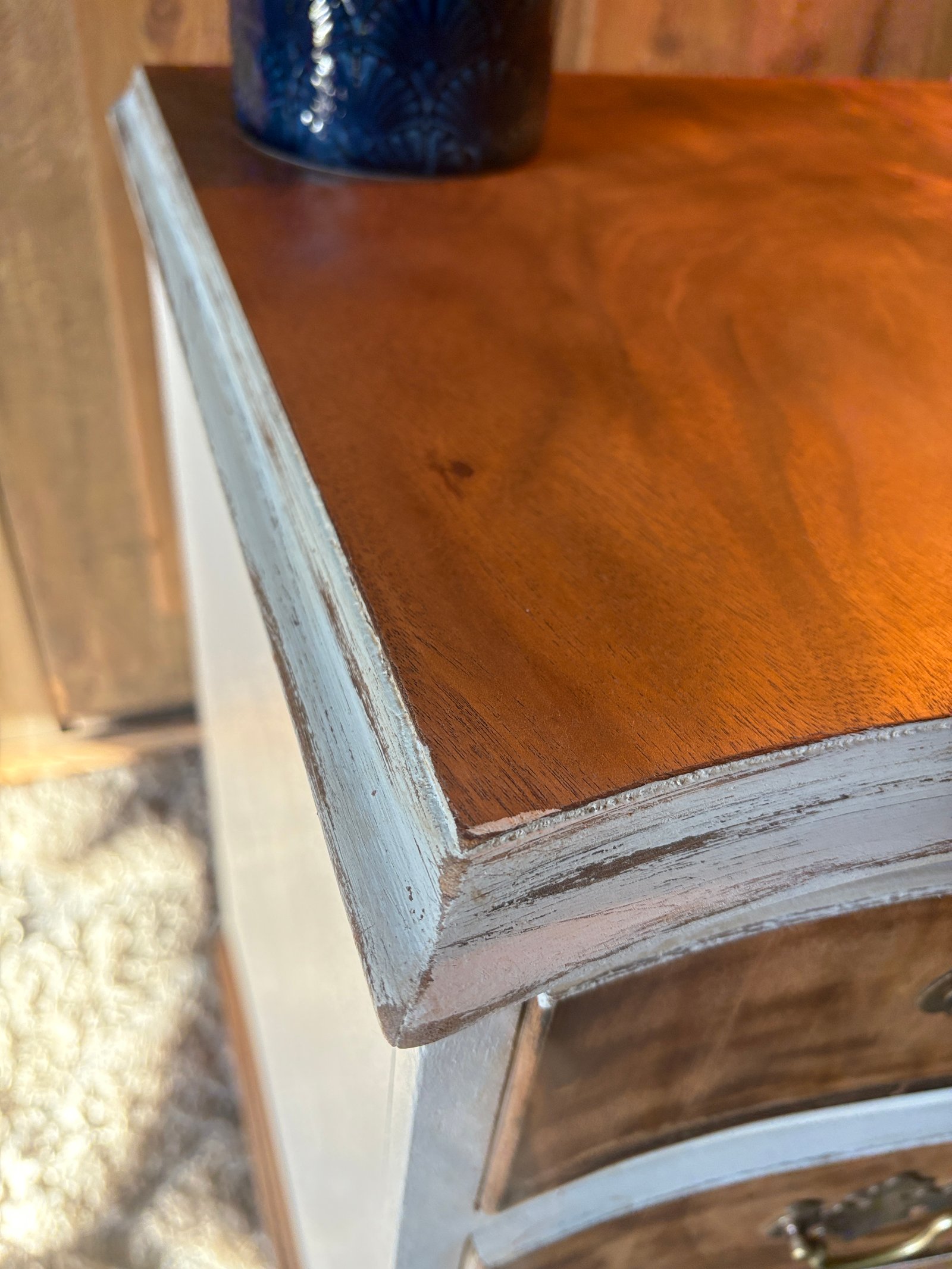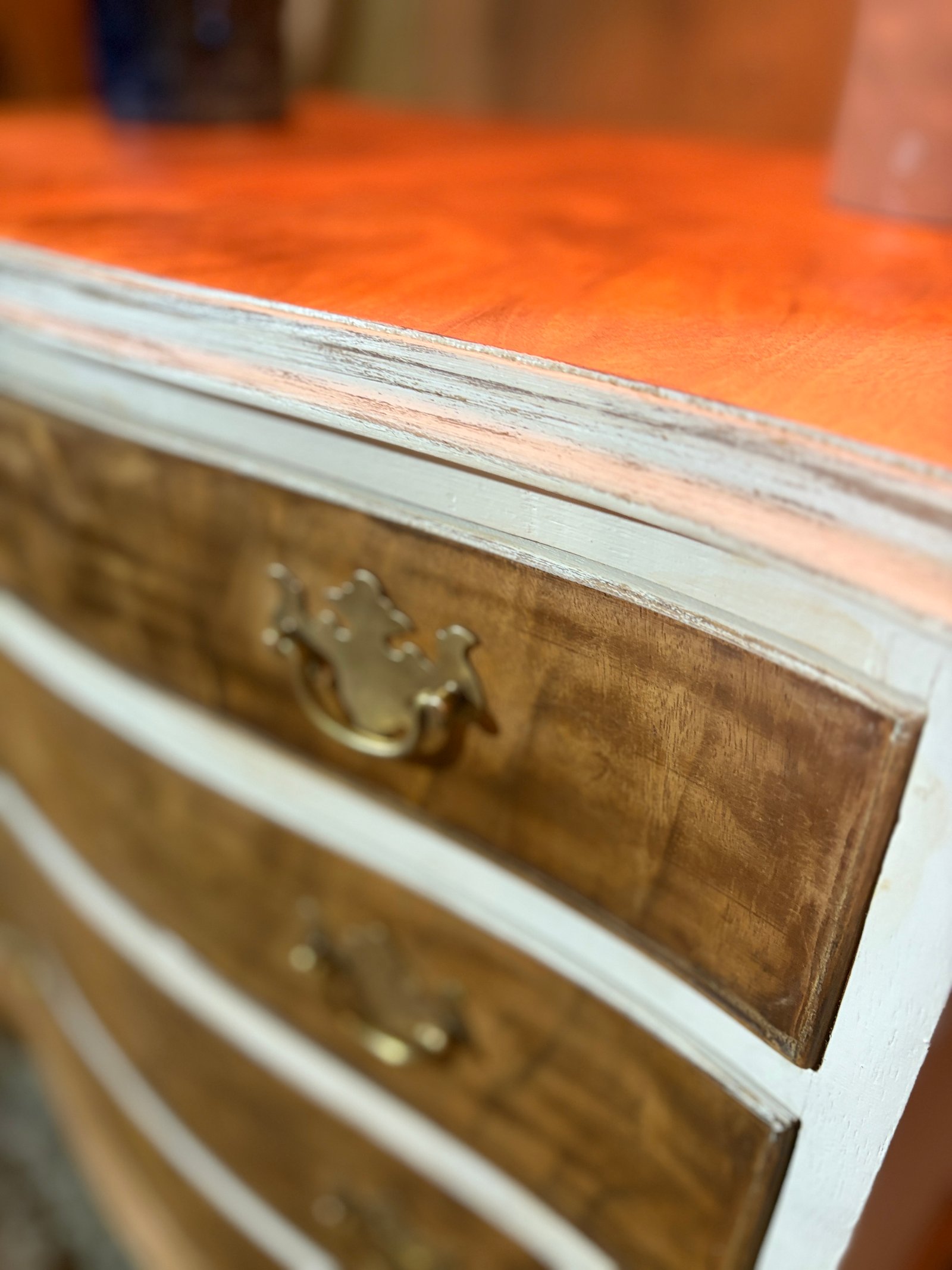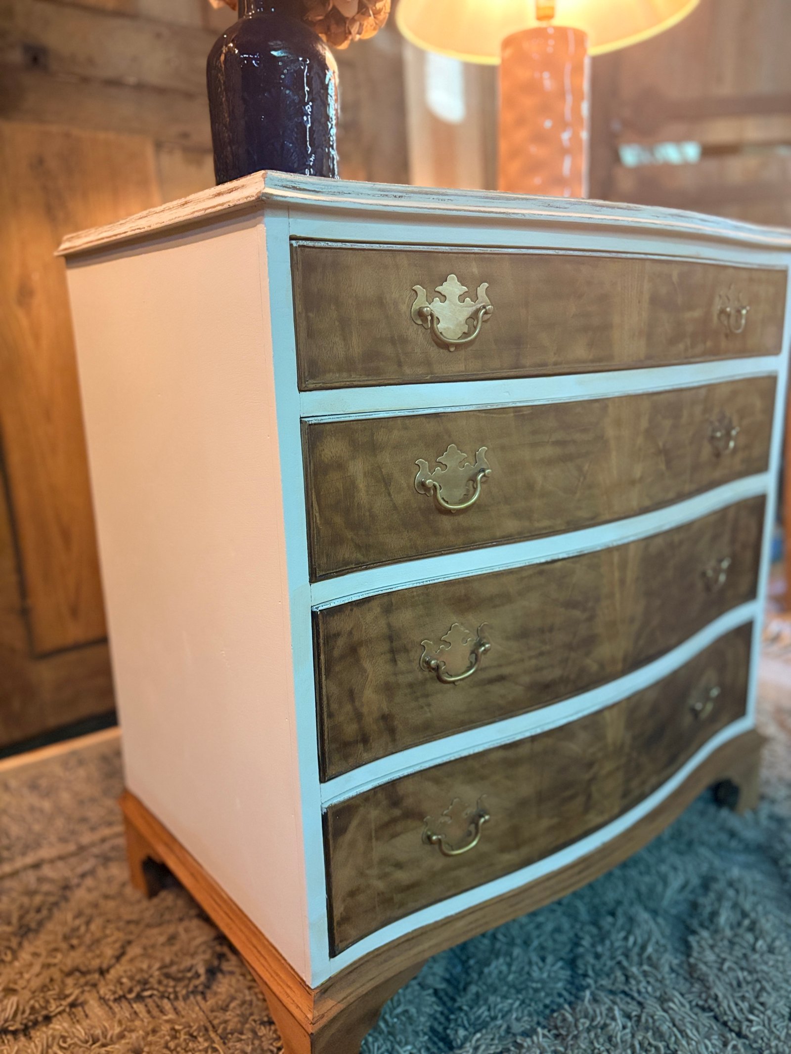 Cette élégante commode ancienne a été entièrement restaurée pour lui offrir une seconde vie pleine de douceur. Peinte dans un ivoire lumineux de chez Libéron®, elle dévoile des lignes féminines et arrondies qui s’intègrent parfaitement dans une décoration romantique, bohème ou campagne chic. Les tiroirs patinés contrastent subtilement avec le bois blond satiné, tandis que l’intérieur est habillé d’un papier feuillage rétro, apportant une touche poétique et raffinée.