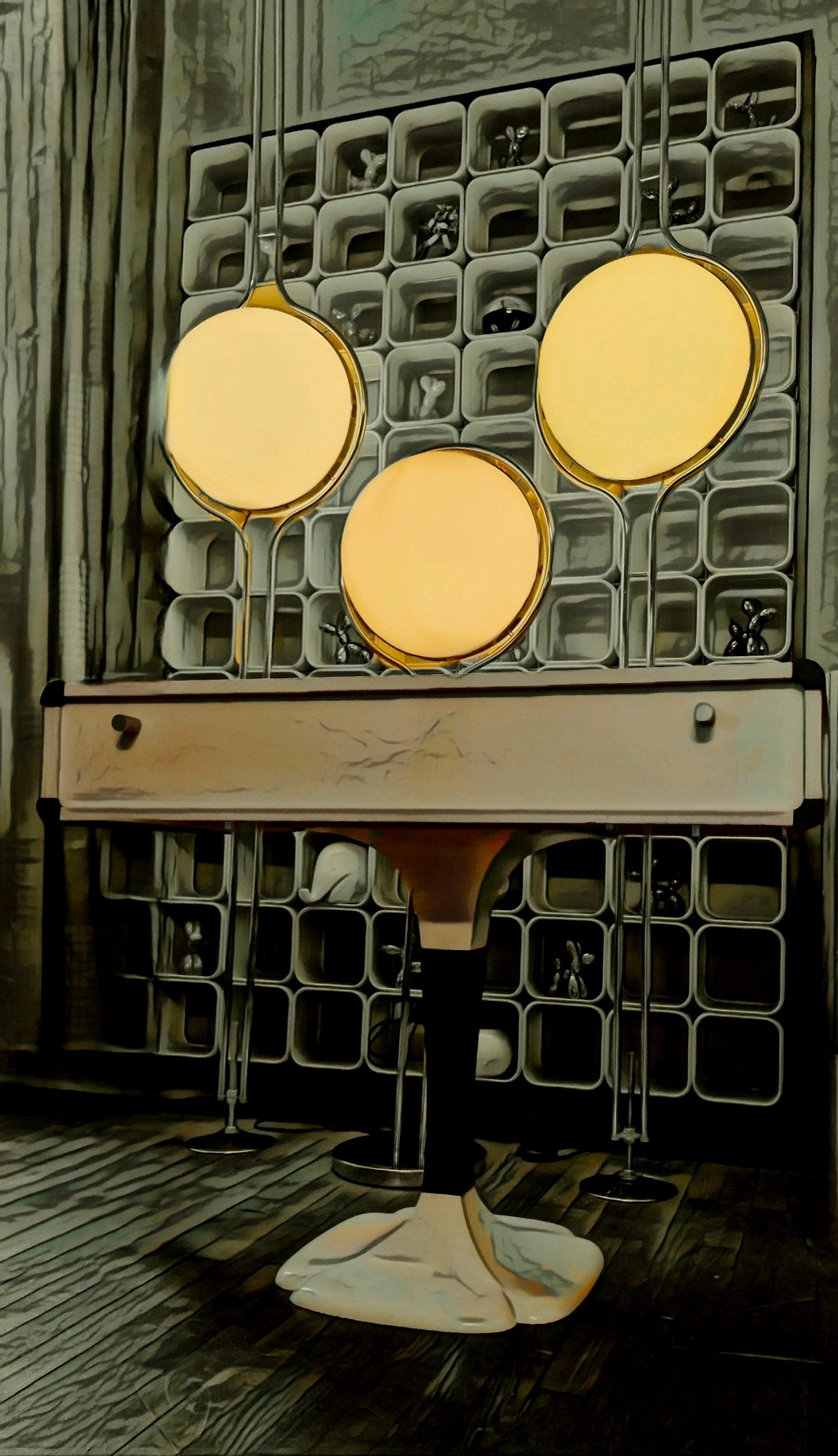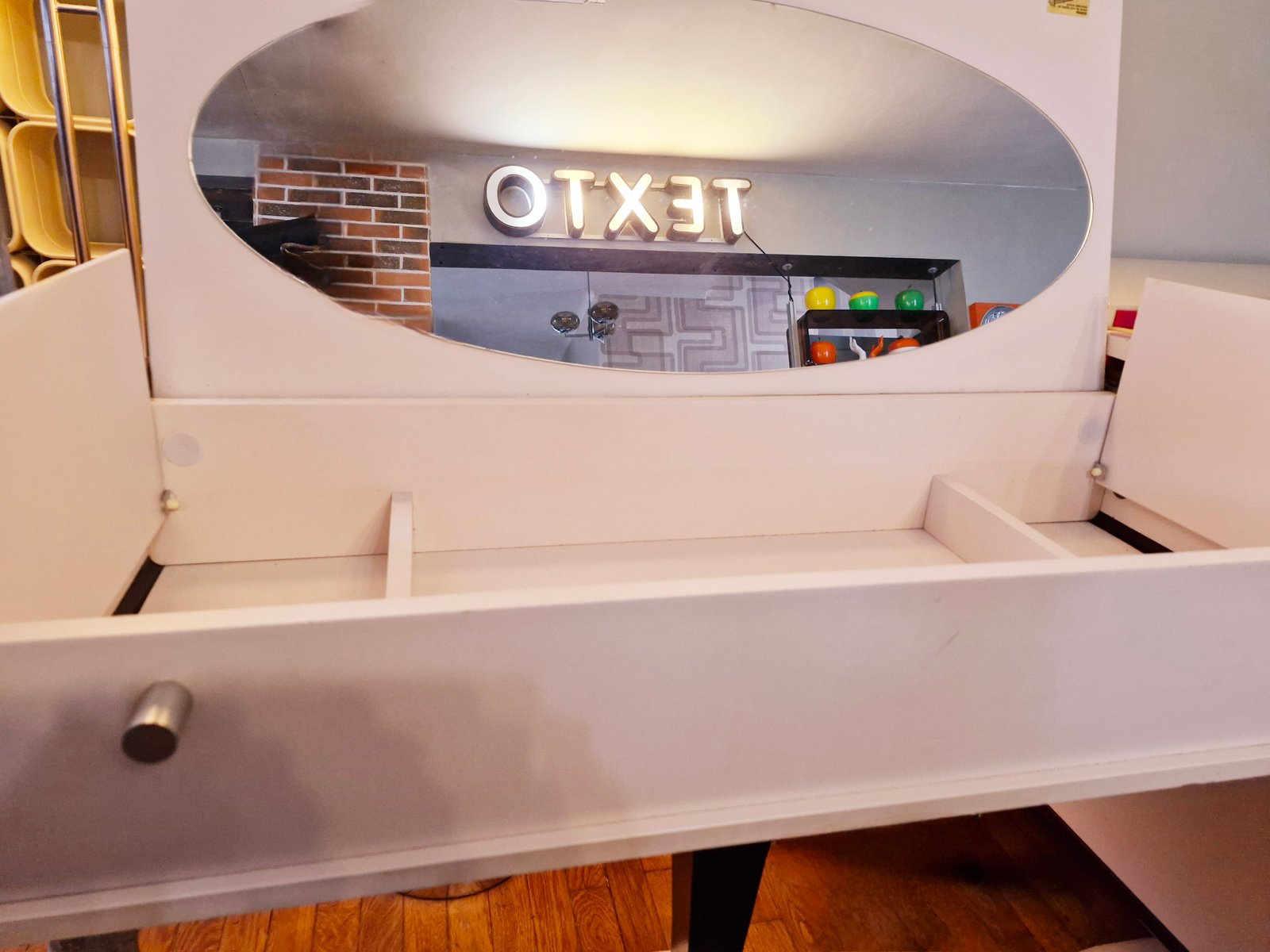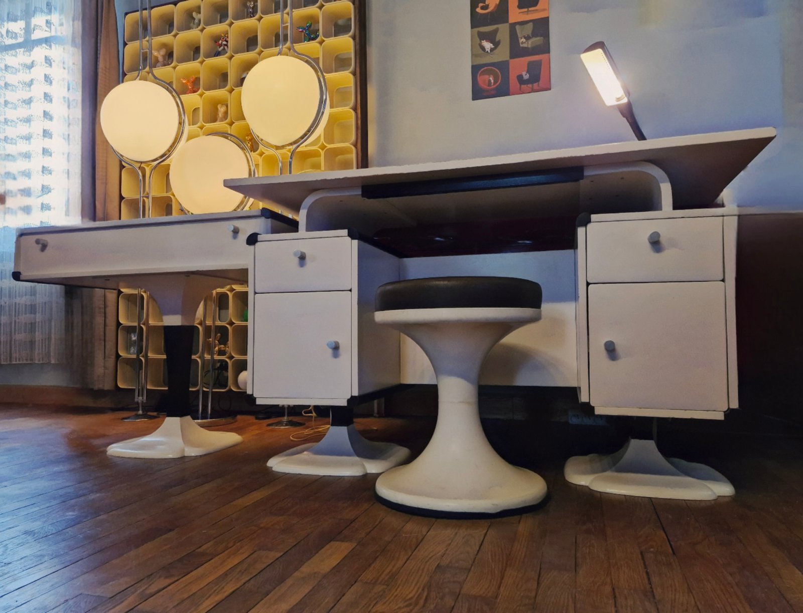 Rare duo estampillé Gautier, datant des années 1970, composé d’un bureau à caissons et d’une coiffeuse-console assortie, idéal pour créer une ambiance douce et élégante dans une chambre féminine, un studio créatif ou un espace vintage. Le bureau présente deux caissons avec portes et tiroirs, un plateau surélevé et des piètements tulipes en fibre de verre, agrémentés de galettes feutrées pour protéger le sol. La coiffeuse, en formica blanc également, dévoile un miroir ovoïde intégré sous le plateau, avec niches de rangement pratiques et un piètement trèfle typique du design 70’s.
