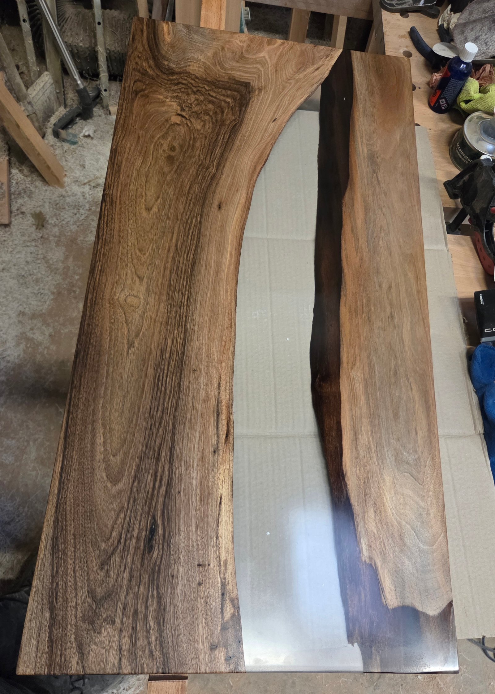 Cette table basse associe l’élégance naturelle du bois de noyer massif à la modernité de la résine époxy transparente, pour un rendu visuel spectaculaire. Le veinage du bois est mis en valeur par l’époxy qui crée un effet “rivière” ou “verre fondu”, très prisé dans les intérieurs design. Les pieds carrés, probablement en métal ou bois assorti, assurent une stabilité parfaite tout en renforçant le style minimaliste et géométrique de l’ensemble. Idéale pour un salon moderne, industriel ou scandinave, cette pièce artisanale s’intègre aussi bien dans un espace épuré que dans une déco plus chaleureuse. Elle peut servir de table centrale, de support déco ou de meuble d’appoint selon l’agencement.