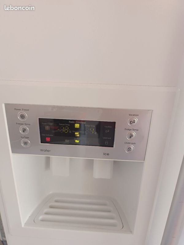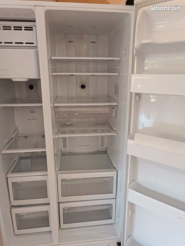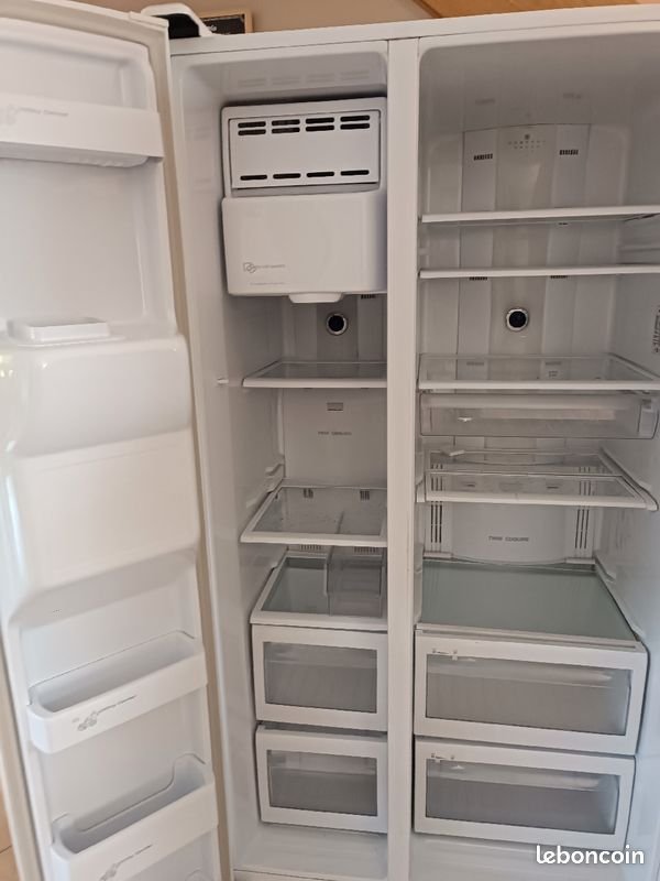 Frigo américain LG, modèle side-by-side, en très bon état, avec de nombreuses fonctionnalités pratiques. La partie congélateur est équipée d’un distributeur d’eau, glaçons et glace pilée, idéal pour un usage quotidien. Il dispose également d’une trappe extérieure permettant d’accéder rapidement aux bouteilles sans ouvrir la porte, un vrai plus pour limiter les pertes de froid. À l’intérieur, le réfrigérateur est doté de 2 étagères en ardoise et 2 en verre trempé, offrant une organisation modulable et élégante. Le design en inox s’intègre parfaitement dans une cuisine moderne ou contemporaine, et sa capacité généreuse convient à une famille nombreuse, une colocation ou une résidence principale. Dimensions estimées : Hauteur 175 cm, Largeur 89 cm, Profondeur 72,5 cm