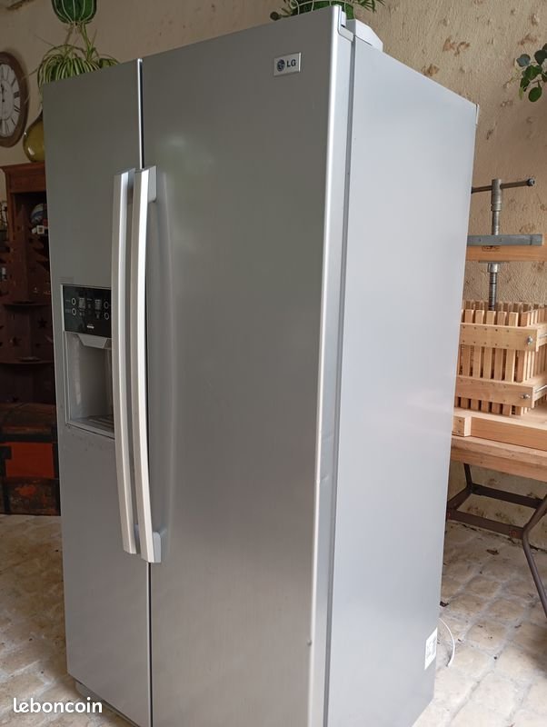 Frigo américain LG, modèle side-by-side, en très bon état, avec de nombreuses fonctionnalités pratiques. La partie congélateur est équipée d’un distributeur d’eau, glaçons et glace pilée, idéal pour un usage quotidien. Il dispose également d’une trappe extérieure permettant d’accéder rapidement aux bouteilles sans ouvrir la porte, un vrai plus pour limiter les pertes de froid. À l’intérieur, le réfrigérateur est doté de 2 étagères en ardoise et 2 en verre trempé, offrant une organisation modulable et élégante. Le design en inox s’intègre parfaitement dans une cuisine moderne ou contemporaine, et sa capacité généreuse convient à une famille nombreuse, une colocation ou une résidence principale. Dimensions estimées : Hauteur 175 cm, Largeur 89 cm, Profondeur 72,5 cm