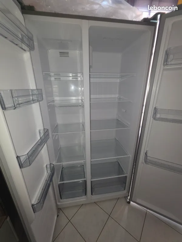 Réfrigérateur / Congélateur américain en pose libre Circulation du froid : à air ventilé Confort : Distributeur d'eau fraîche/glaçons/glace pilée • Home bar Volume net total : 484 L (Réfrigérateur : 340 L / Congélateur : 144 L) Classe énergie : A+ Très bon état. 4 ans d'utilisation. Les dimensions ne sont pas exactes !!