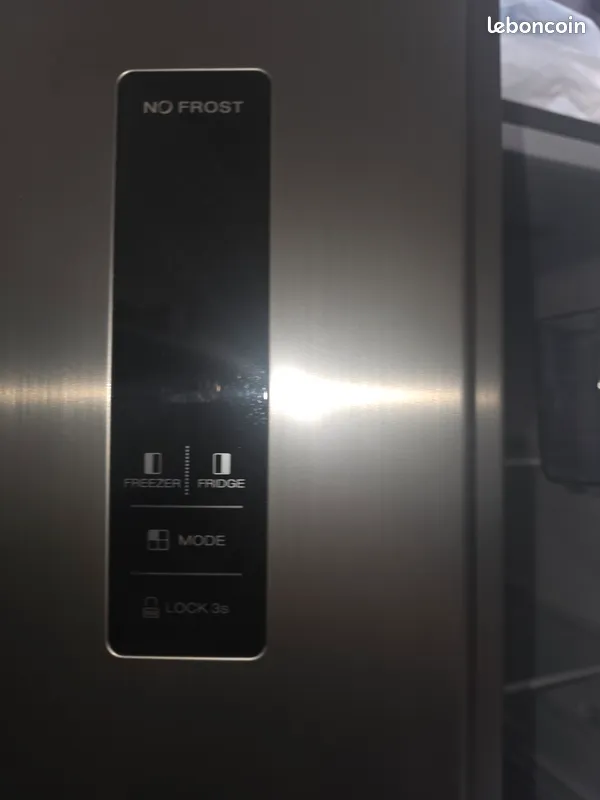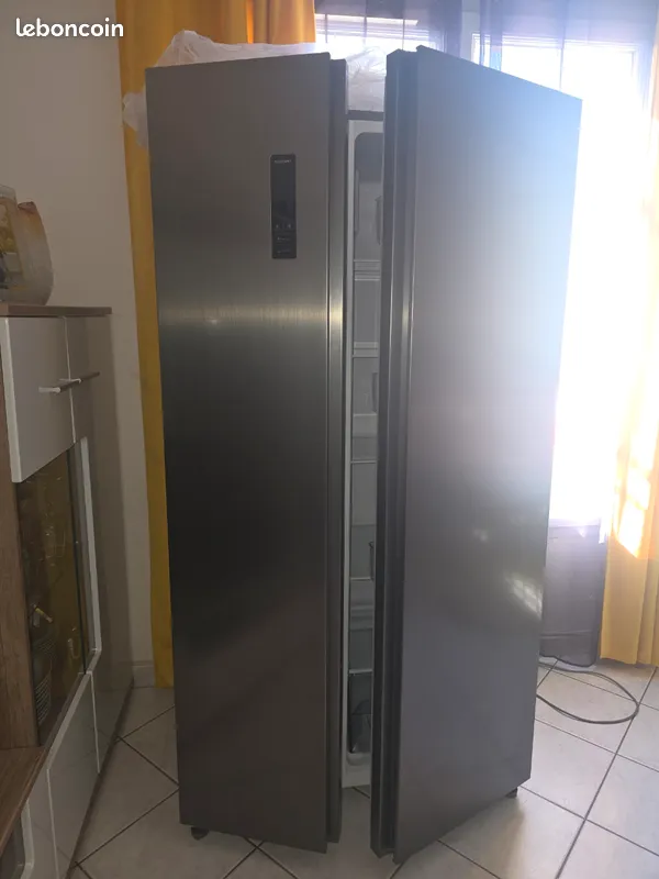 Réfrigérateur américain Haier HSOBPIF9183, état neuf, très peu utilisé. Modèle haut de gamme à froid ventilé No Frost, avec distributeur d’eau, glaçons et glace pilée intégré (fonctionne sans raccordement direct). Idéal pour une cuisine moderne, familiale ou partagée. Grande capacité de 515 litres : 337L pour le réfrigérateur et 178L pour le congélateur, parfait pour stocker les courses d’un foyer complet. Design élégant en noir mat, silencieux (40 dB), avec affichage digital, éclairage LED, balconnets ajustables et tiroirs transparents. Classe énergétique F (équivalent A+), consommation maîtrisée.