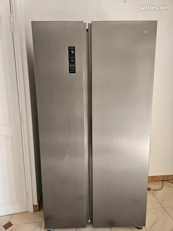 Frigo américain LG, modèle side-by-side, en très bon état, avec de nombreuses fonctionnalités pratiques. La partie congélateur est équipée d’un distributeur d’eau, glaçons et glace pilée, idéal pour un usage quotidien. Il dispose également d’une trappe extérieure permettant d’accéder rapidement aux bouteilles sans ouvrir la porte, un vrai plus pour limiter les pertes de froid. À l’intérieur, le réfrigérateur est doté de 2 étagères en ardoise et 2 en verre trempé, offrant une organisation modulable et élégante. Le design en inox s’intègre parfaitement dans une cuisine moderne ou contemporaine, et sa capacité généreuse convient à une famille nombreuse, une colocation ou une résidence principale. Dimensions estimées : Hauteur 175 cm, Largeur 89 cm, Profondeur 72,5 cm