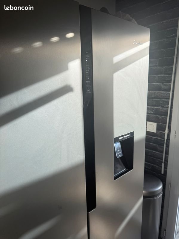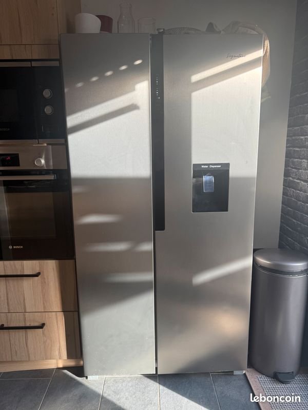 Modèle américain 2 portes de la marque Signature (BUT), avec partie congélateur à gauche et réfrigérateur à droite, équipé d’un distributeur d’eau fraîche fonctionnant par réservoir (pas de raccordement nécessaire). Finition inox élégante, idéale pour une cuisine moderne ou familiale. Ce combiné offre une grande capacité de rangement, avec des étagères pratiques, tiroirs spacieux et une organisation claire des aliments. Le distributeur intégré permet un accès rapide à l’eau fraîche, parfait pour un usage quotidien. Appareil silencieux, fiable et bien entretenu.