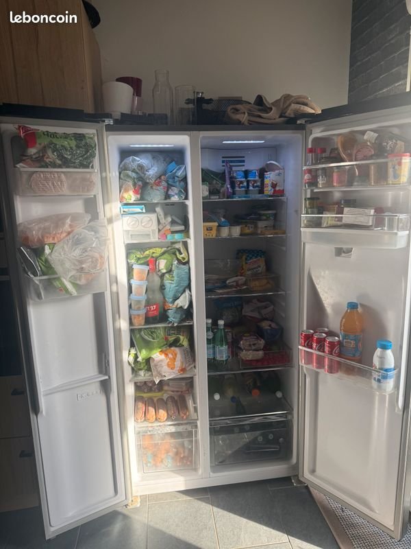 Réfrigérateur / Congélateur américain en pose libre Circulation du froid : à air ventilé Confort : Distributeur d'eau fraîche/glaçons/glace pilée • Home bar Volume net total : 484 L (Réfrigérateur : 340 L / Congélateur : 144 L) Classe énergie : A+ Très bon état. 4 ans d'utilisation. Les dimensions ne sont pas exactes !!
