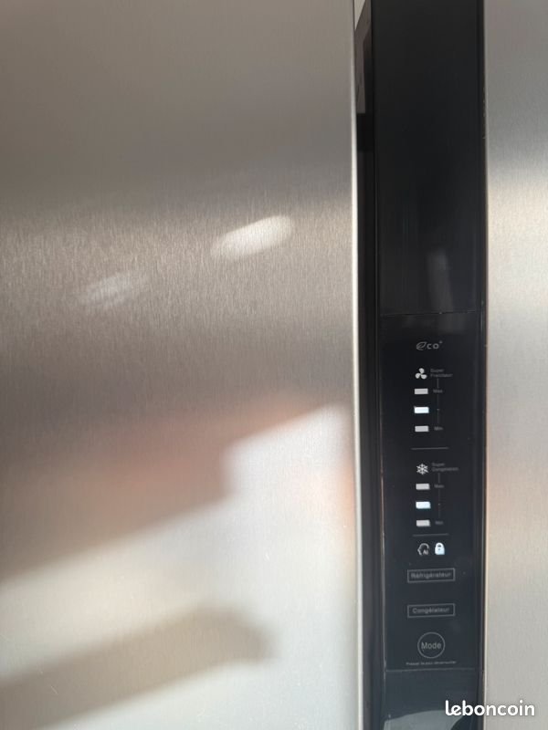 Réfrigérateur américain Haier HSOBPIF9183, état neuf, très peu utilisé. Modèle haut de gamme à froid ventilé No Frost, avec distributeur d’eau, glaçons et glace pilée intégré (fonctionne sans raccordement direct). Idéal pour une cuisine moderne, familiale ou partagée. Grande capacité de 515 litres : 337L pour le réfrigérateur et 178L pour le congélateur, parfait pour stocker les courses d’un foyer complet. Design élégant en noir mat, silencieux (40 dB), avec affichage digital, éclairage LED, balconnets ajustables et tiroirs transparents. Classe énergétique F (équivalent A+), consommation maîtrisée.