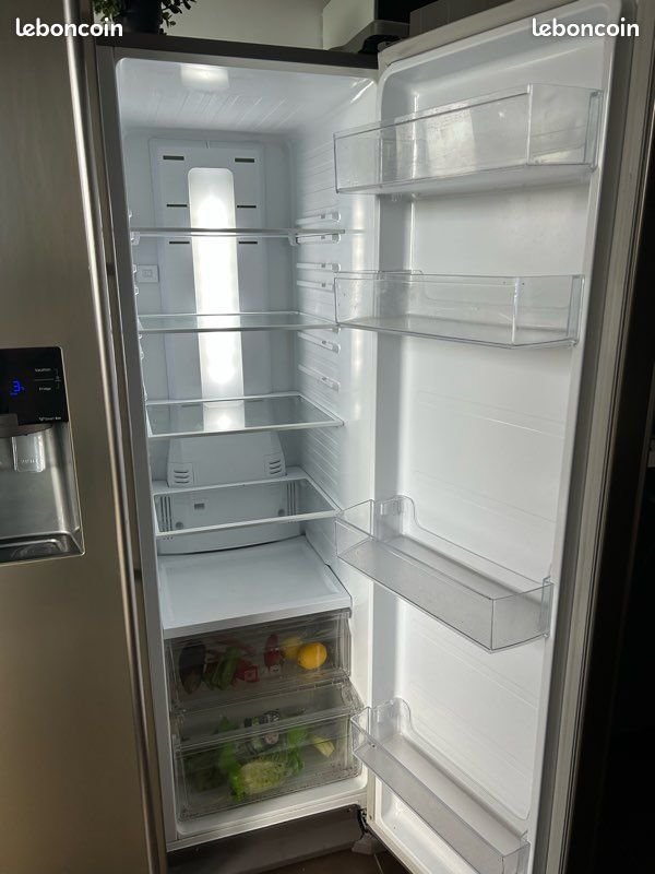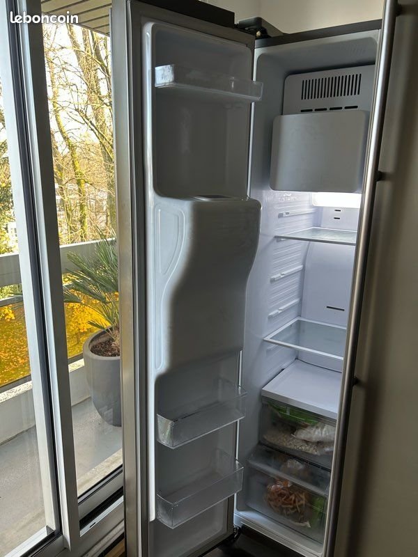 Réfrigérateur / Congélateur américain en pose libre Circulation du froid : à air ventilé Confort : Distributeur d'eau fraîche/glaçons/glace pilée • Home bar Volume net total : 484 L (Réfrigérateur : 340 L / Congélateur : 144 L) Classe énergie : A+ Très bon état. 4 ans d'utilisation. Les dimensions ne sont pas exactes !!