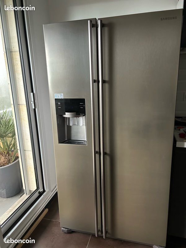 Ce frigo américain Samsung combine design moderne et fonctionnalité haut de gamme. Doté d’un distributeur intégré pour l’eau fraîche, les glaçons et la glace pilée, il offre un confort optimal au quotidien. Son système de froid ventilé No Frost assure une conservation homogène sans givre, et ses deux portes verticales permettent un accès rapide au réfrigérateur et au congélateur. Avec sa finition inox élégante, il s’intègre parfaitement dans une cuisine contemporaine, industrielle ou minimaliste. En très bon état, toutes les fonctions sont opérationnelles, et l’appareil est prêt à être installé sans aucun réglage particulier.