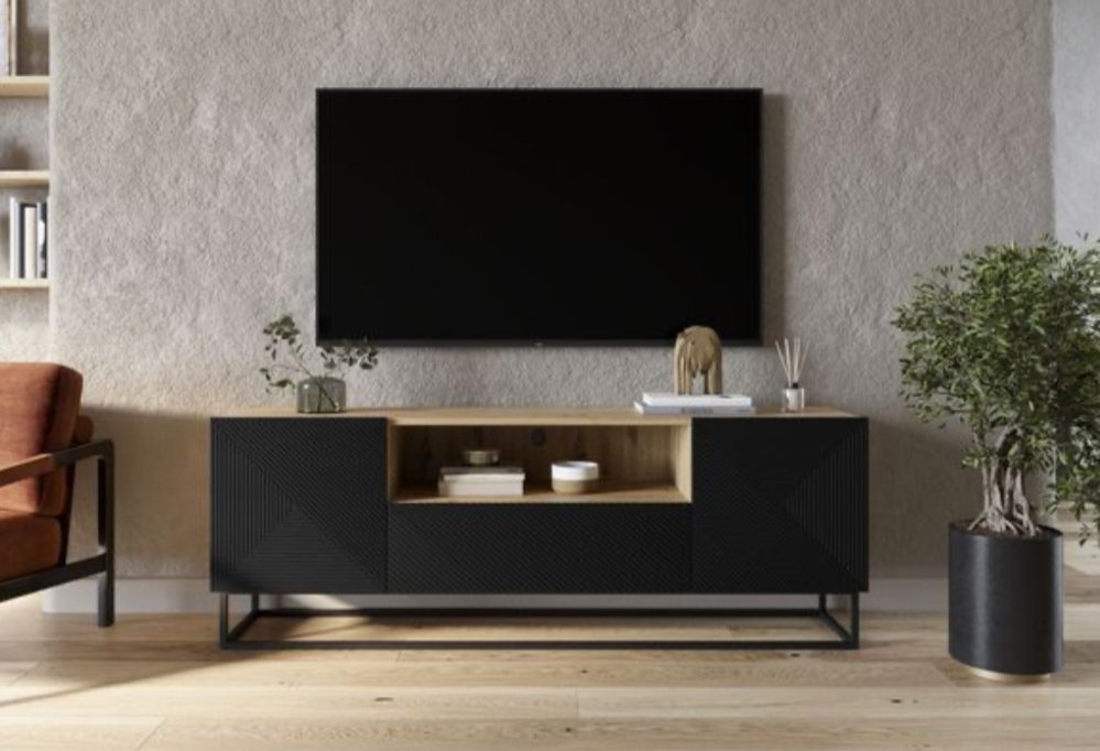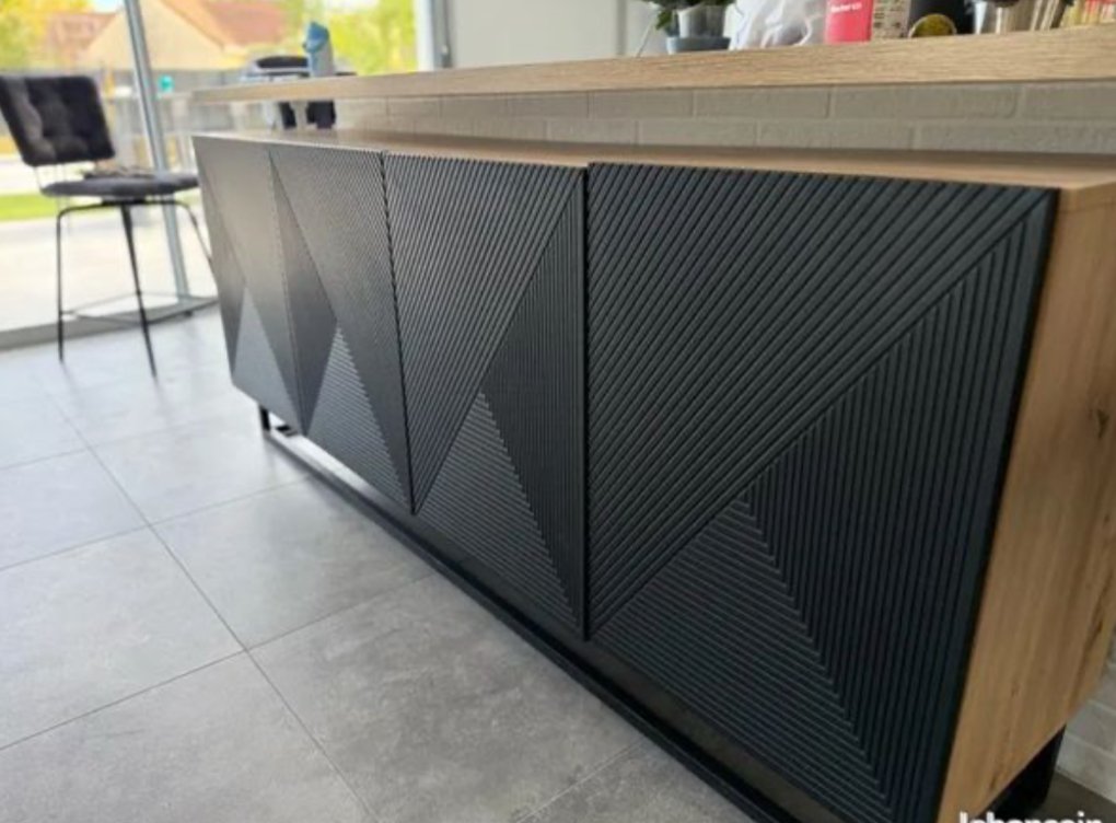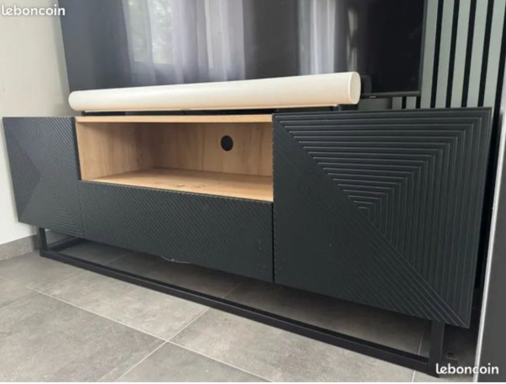 buffet de la collection ALICE de chez Bobochic, acheté il y a un an et encore disponible sur le site officiel. Design moderne et élégant avec façades chevronnées, finition chêne et noir, et pieds en métal pour une touche contemporaine. Le buffet 4 portes (200 cm) offre un vaste espace de rangement avec étagères réglables sur trois niveaux, tandis que le meuble TV (167 cm) combine style et fonctionnalité avec ses niches pratiques et son système d’ouverture sans poignées. Les deux meubles sont en très bon état, sans défaut, et s’intègrent parfaitement dans un intérieur tendance, scandinave ou industriel. Idéal pour structurer un séjour avec goût et praticité. Le prix comprend la livraison.