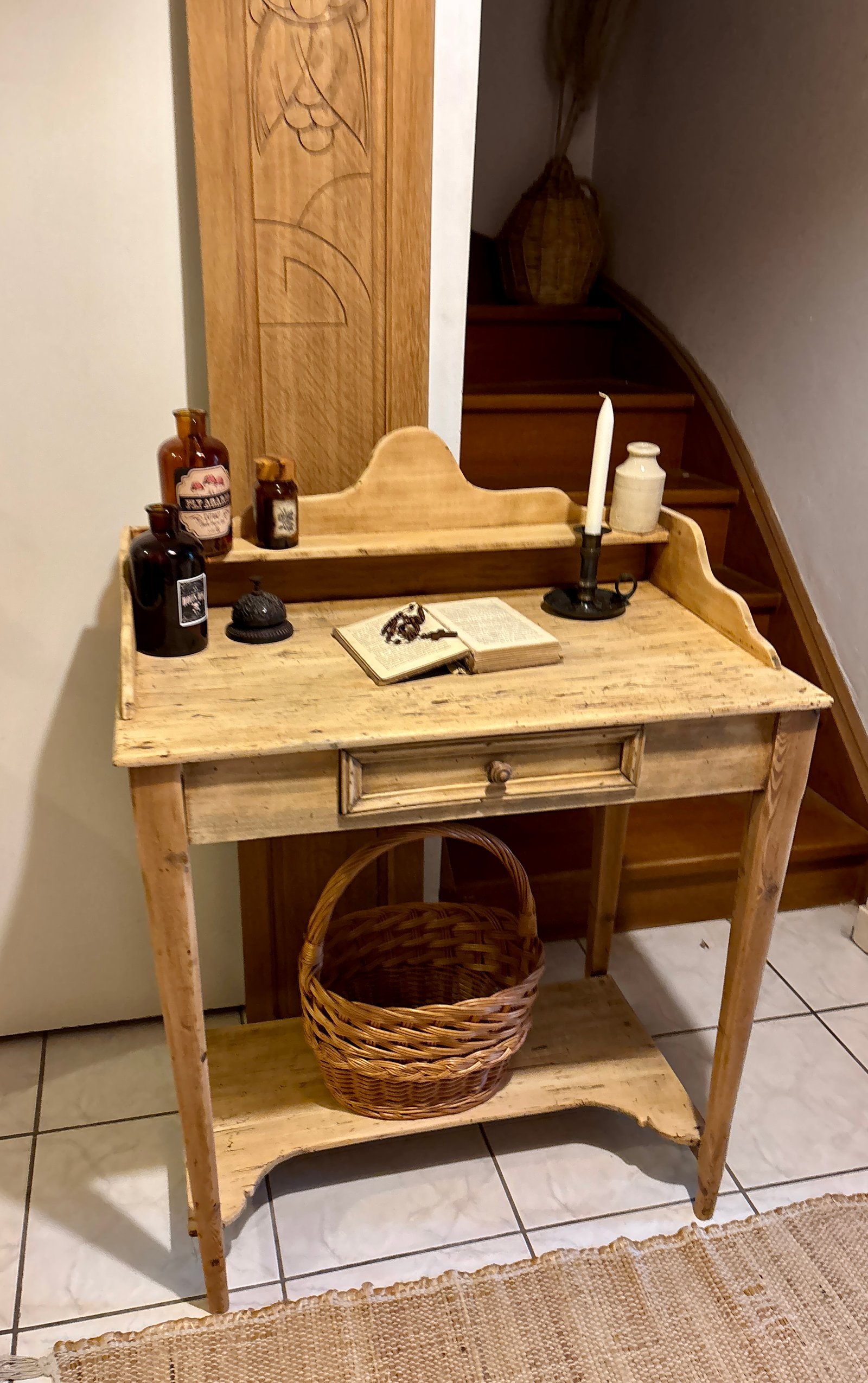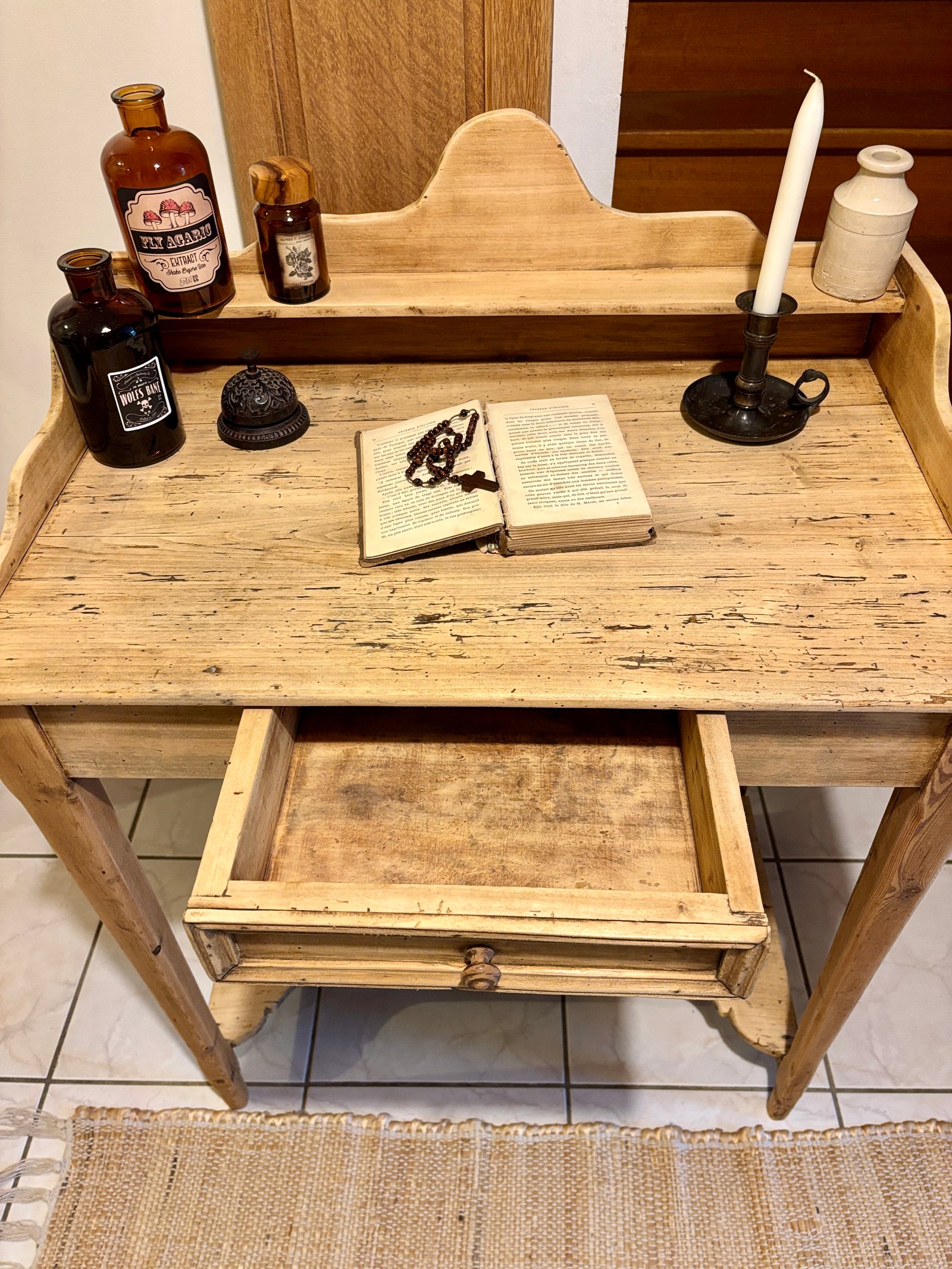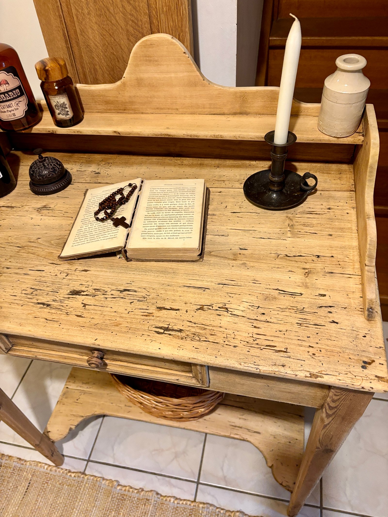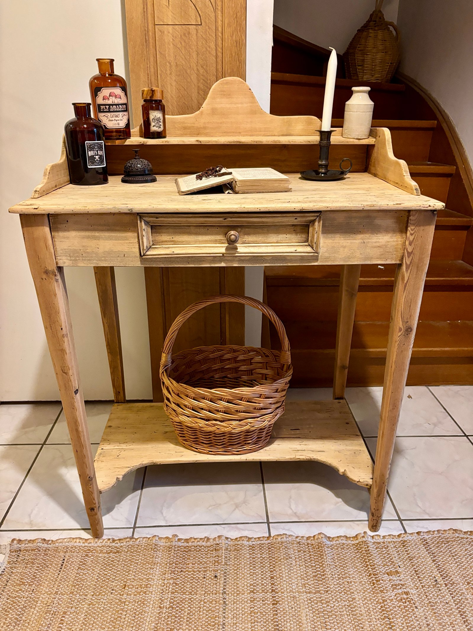 Ce meuble ancien séduit par son authenticité et sa polyvalence : idéal comme console d’entrée, coiffeuse élégante ou petit bureau d’appoint. Entièrement réalisé en bois, il arbore une patine claire et naturelle, mise en valeur par un travail de rénovation soigné : ponçage, traitement et nettoyage complet. Le plateau conserve de belles marques du temps, irrégularités et nuances qui racontent son histoire et lui donnent une âme unique. Le tiroir central est pratique pour le rangement, et l’étagère supérieure permet d’exposer vos objets déco ou accessoires. Ce meuble s’intègre parfaitement dans une ambiance campagne chic, bohème ou scandinave, grâce à ses lignes épurées et son bois lumineux.