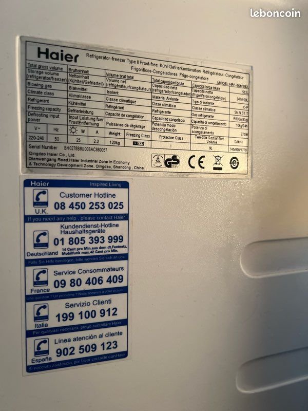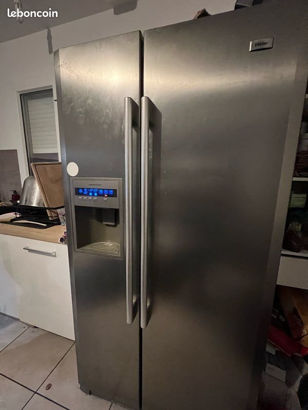 Réfrigérateur américain Haier HRF-663ISB2 en finition inox, en très bon état de fonctionnement. Ce modèle à double porte offre une capacité totale de 512 litres, dont 344 litres pour le réfrigérateur et 168 litres pour le congélateur. Idéal pour les grandes familles ou les cuisines spacieuses, il dispose d’un système No Frost, d’un éclairage LED, d’un distributeur de glaçons et d’un affichage digital. Classe énergétique A, niveau sonore 48 dB. Le design moderne et la finition acier inoxydable s’intègrent parfaitement dans une cuisine contemporaine. Modèle fiable, vendu bien en dessous du prix neuf constaté à plus de 800 €.