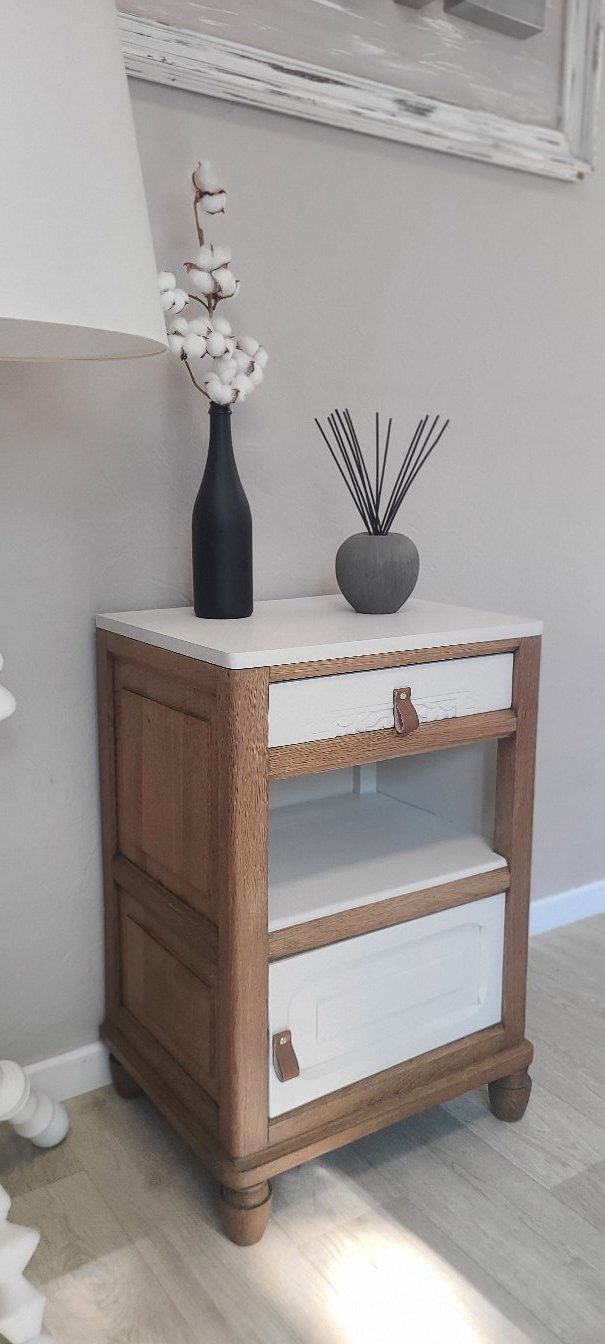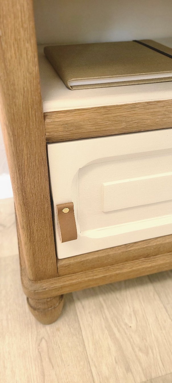 Léonie est un chevet ancien revalorisé, mêlant le charme du bois naturel à la douceur d’un ton crème lumineux. Entièrement restaurée avec soin, elle conserve la chaleur de son bois poncé et nourri, tout en adoptant une touche de modernité grâce à ses parties peintes et ses poignées en cuir camel, à la fois élégantes et contemporaines. Ce petit meuble polyvalent peut servir de table de chevet, de meuble d’appoint ou de rangement décoratif dans une chambre, un salon ou une entrée. Son style rustique chic s’intègre parfaitement dans une déco bohème, naturelle ou campagne moderne.